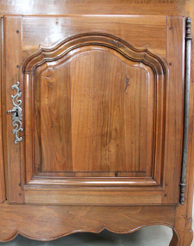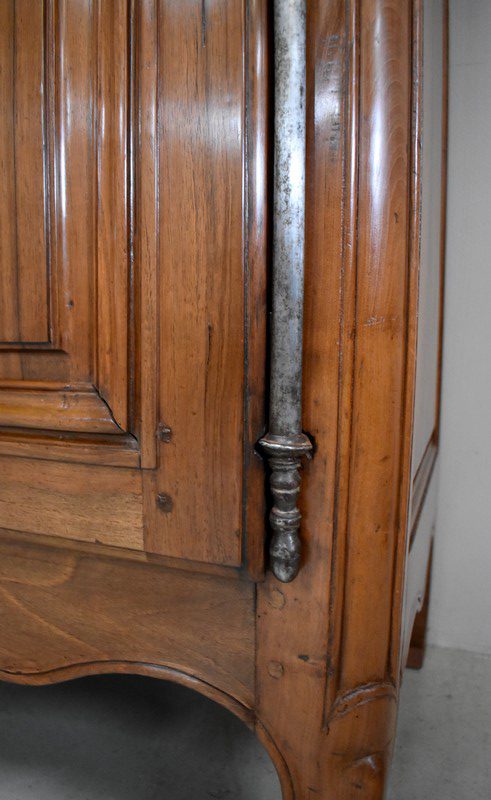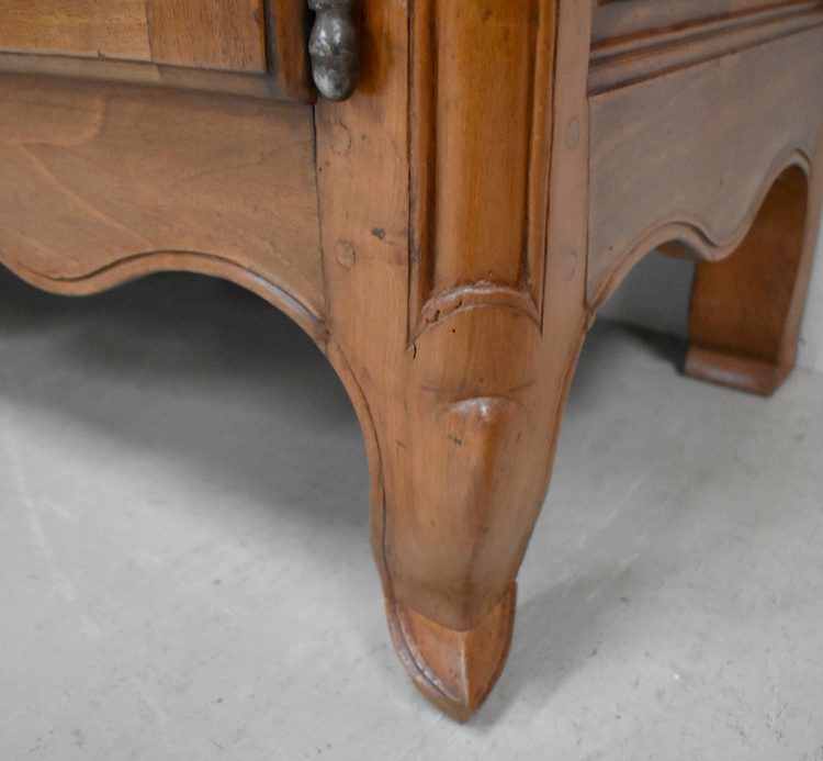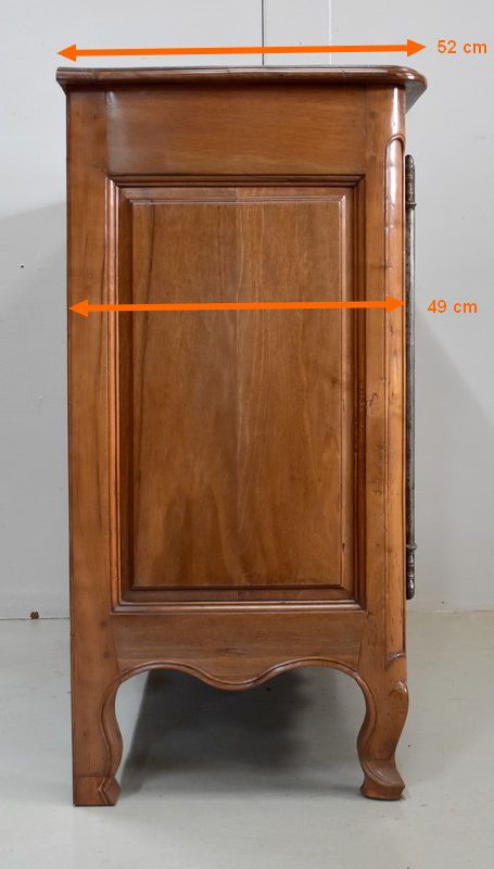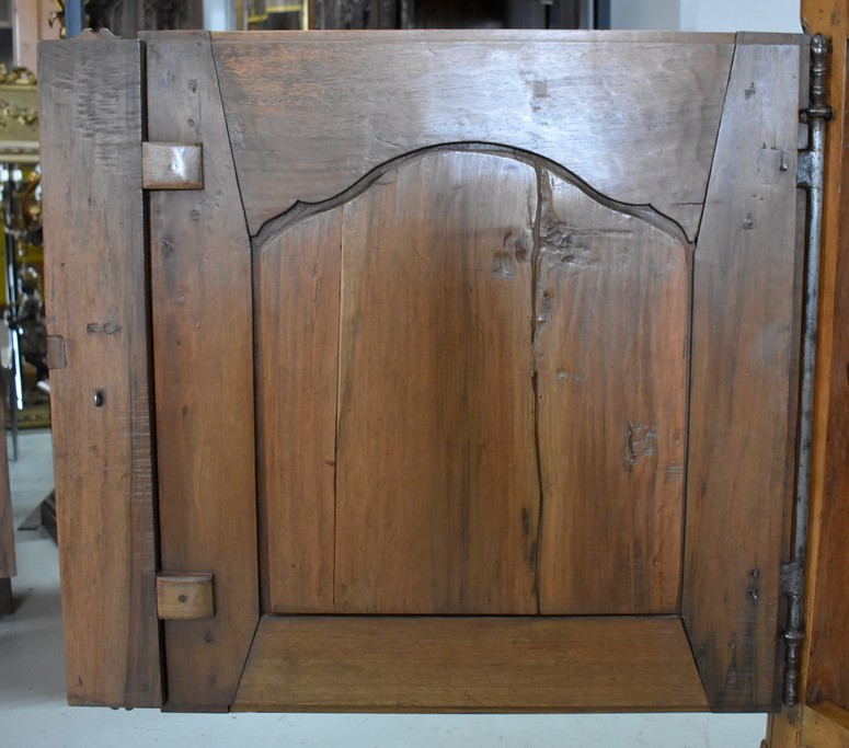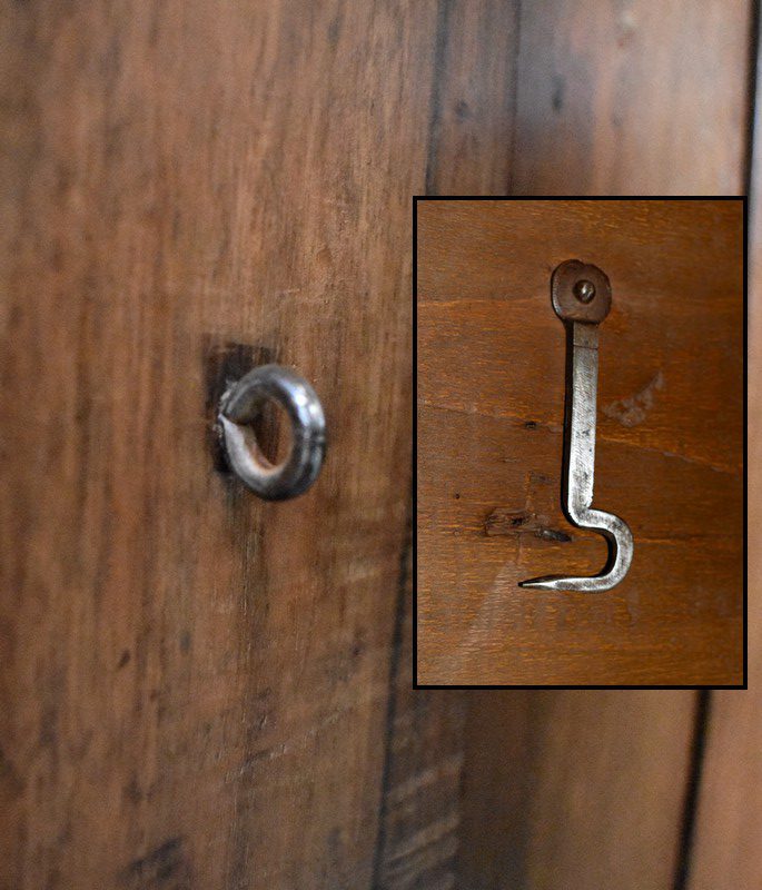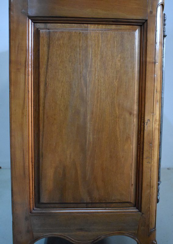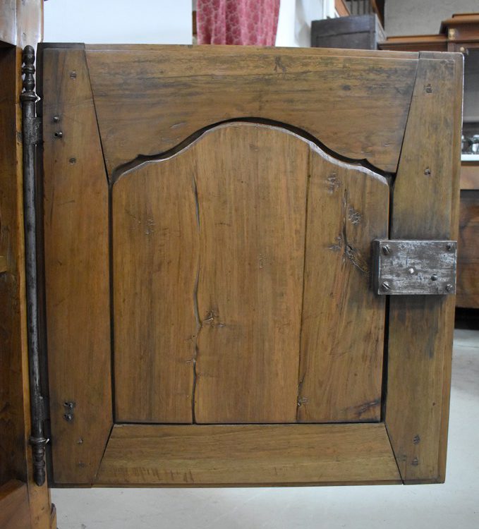 Ce Meuble est ouvrant en façade par deux portes indépendantes, Joliment travaillées en Moulures à Défoncement et Panneaux à plate-bande. Chacune est équipée d’un Gond et d’une Entrée ouvragée en Fer. Celle de Gauche est factice, tandis que celle de Droite est accompagnée de sa Clé et de sa Serrure d’Origine.