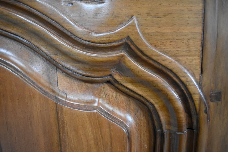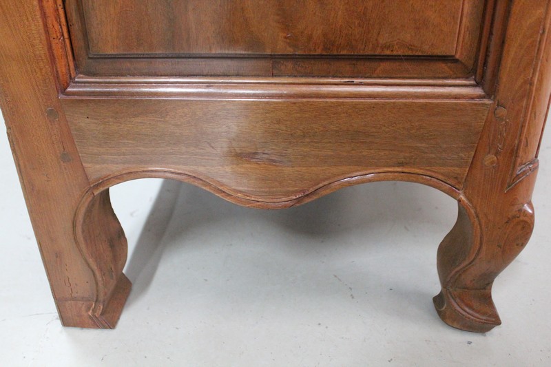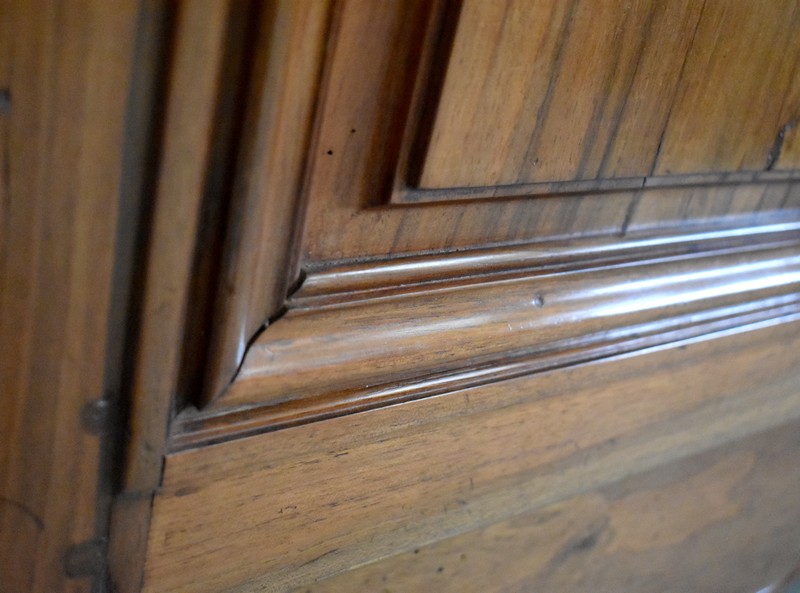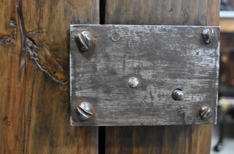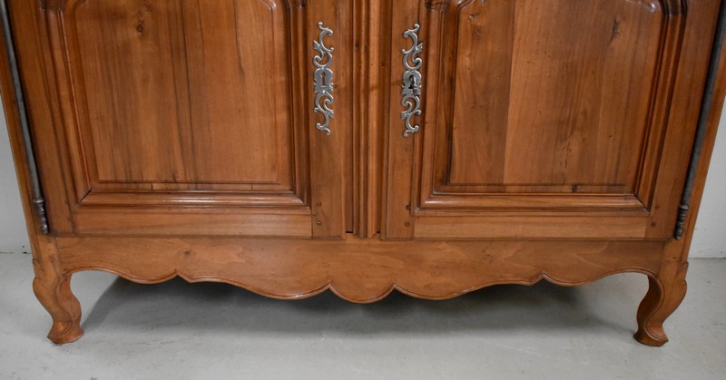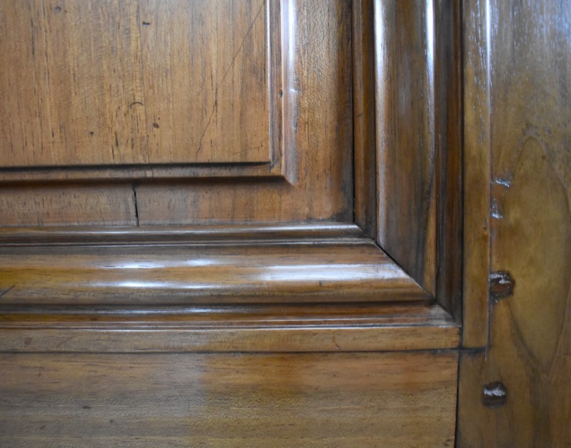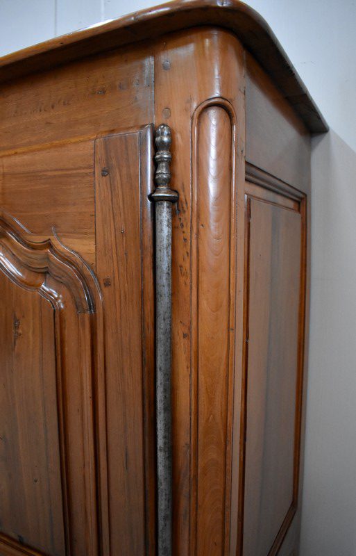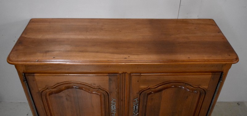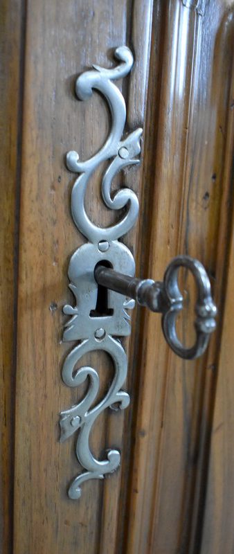Ce Meuble est ouvrant en façade par deux portes indépendantes, Joliment travaillées en Moulures à Défoncement et Panneaux à plate-bande. Chacune est équipée d’un Gond et d’une Entrée ouvragée en Fer. Celle de Gauche est factice, tandis que celle de Droite est accompagnée de sa Clé et de sa Serrure d’Origine.
