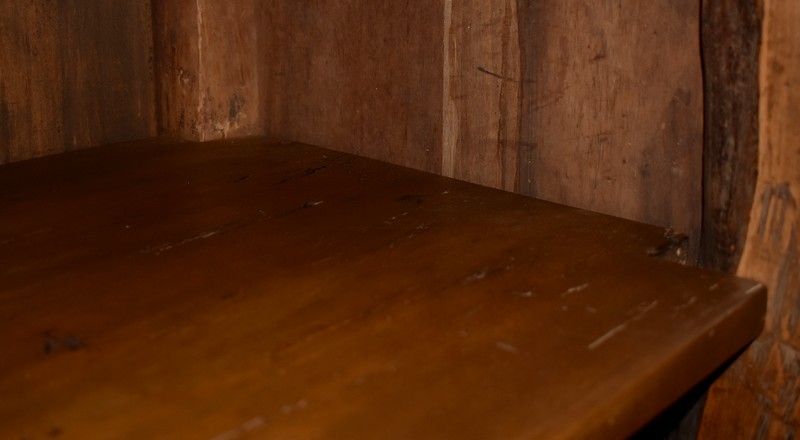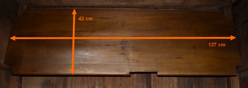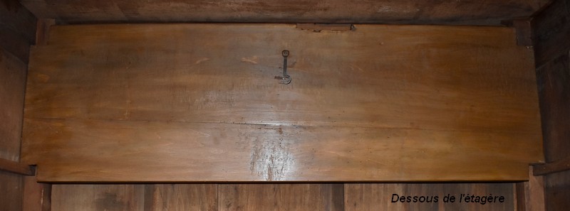 Une Étagère amovible reposant sur Tasseaux fixes, munie de son Crochet d’époque, garnie l’Intérieur de ce Buffet, lui offrant ainsi une configuration de rangement intéressante.