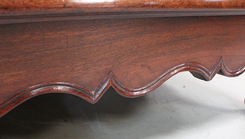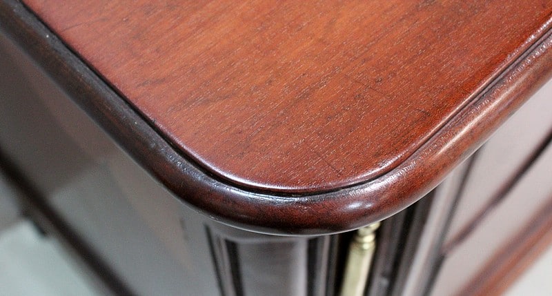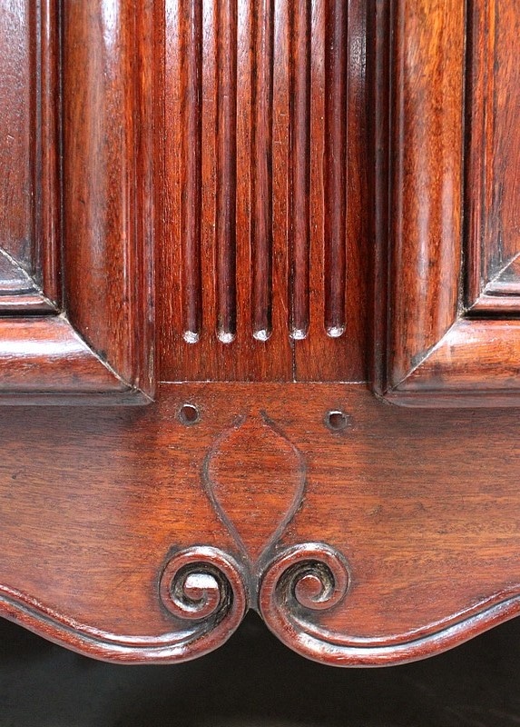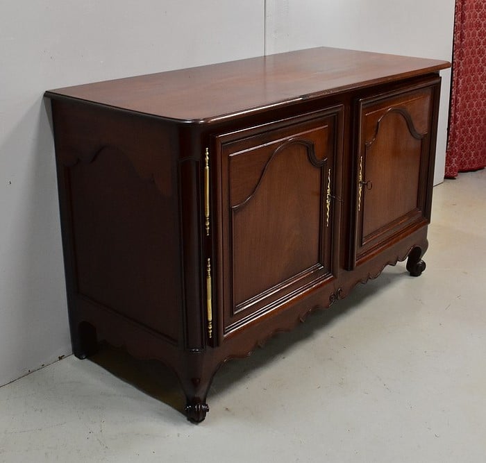 Buffet de Port Régional, en Acajou de Cuba, avec dessus Bois au pourtour à fine rainure. Ce plateau aux angles avant arrondis est constitué de deux planches.