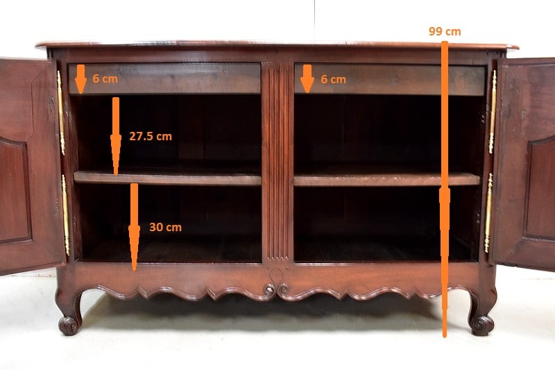 Ce meuble ouvre par deux portes indépendantes, aux façades à Défoncement et encadrements moulurés. Elles sont séparées par un pilastre central fixe, à cannelures verticales. Chacun de ces vantaux est maintenu par des fiches en Bronze, est doté d’une entrée de serrure du même alliage et d’un verrou en état de fonctionnement. Le meuble est fourni avec ses deux clés. Le tout est d’origine. Ces deux portes dévoilent un même espace de rangement, compartimenté par la présence d’une étagère de 60 cm de profondeur posée sur tasseaux fixes. L’intérieur de ce Buffet propose également en partie haute deux tiroirs assemblés à larges Queues d’Arondes.