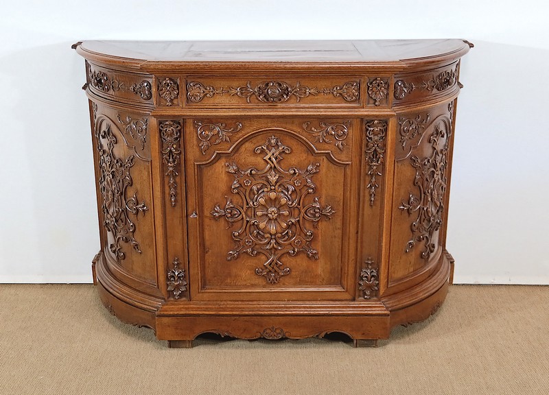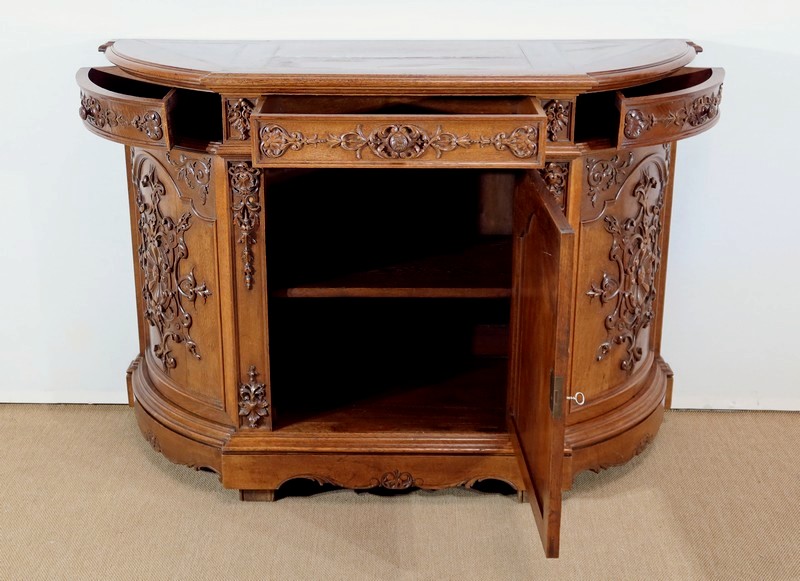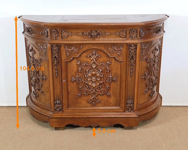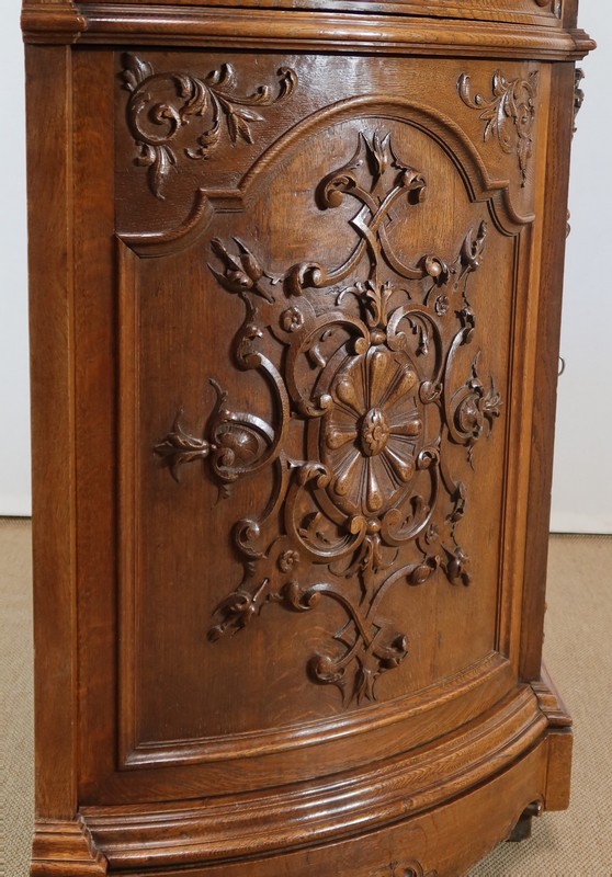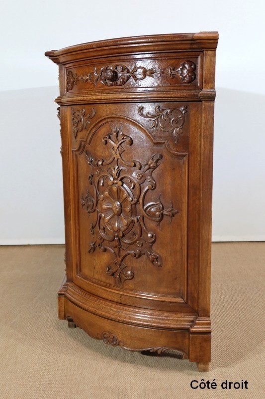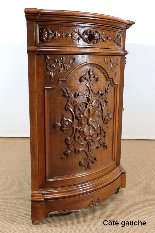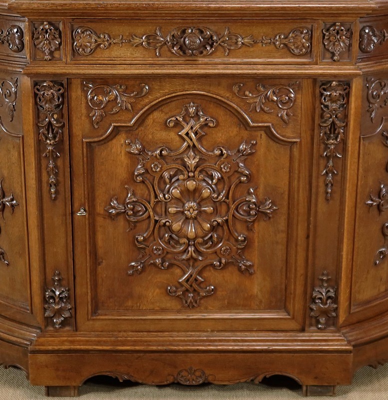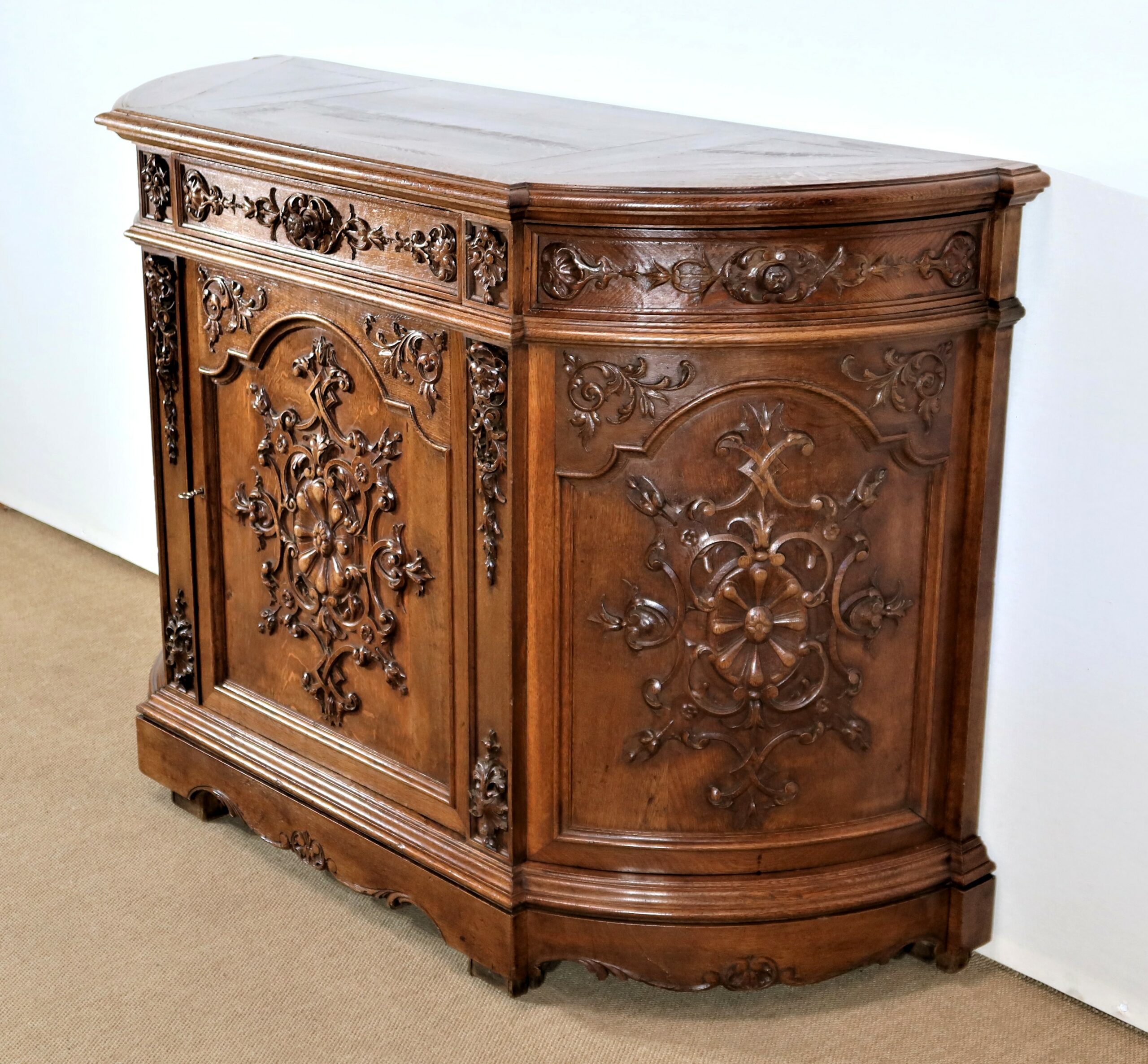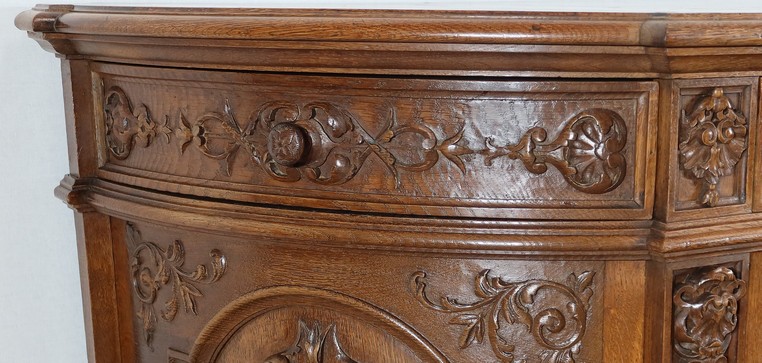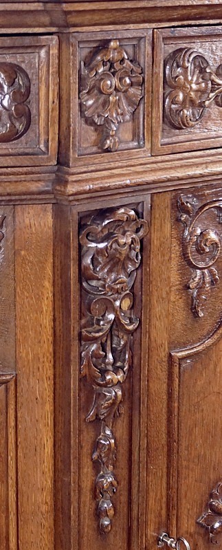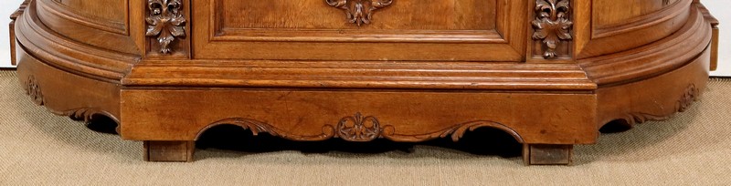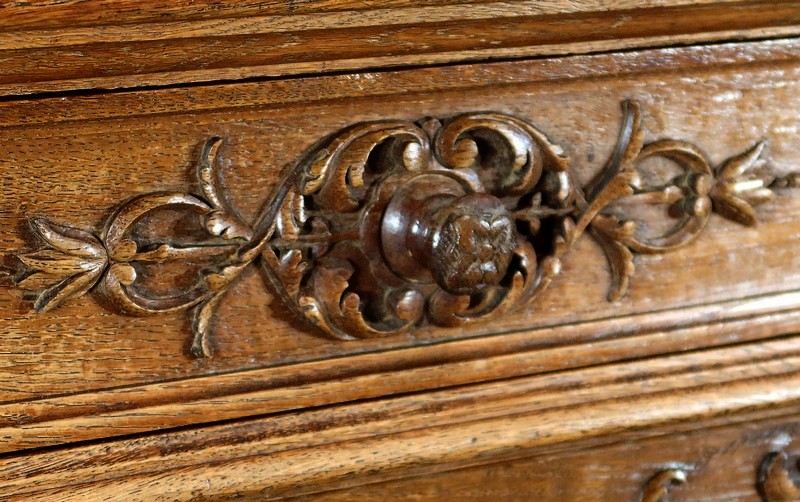 Cette façade, ainsi que les côtés arrondis de ce meuble, présentes d’importants décors sculptés. Les encadrements à défoncement sont moulurés façon chapeau de gendarme en partie haute, et garnis de motifs de rinceaux, de volutes et de fleurs dans les angles supérieurs.