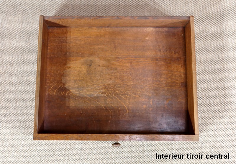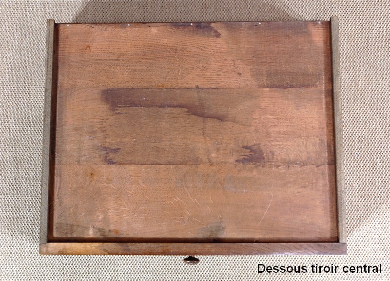 En ceinture, il ouvre par trois tiroirs à boutons bois festonné et à décors de coquilles. Les deux latéraux sont en trémie.