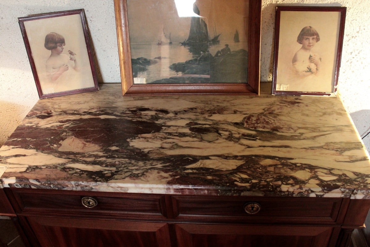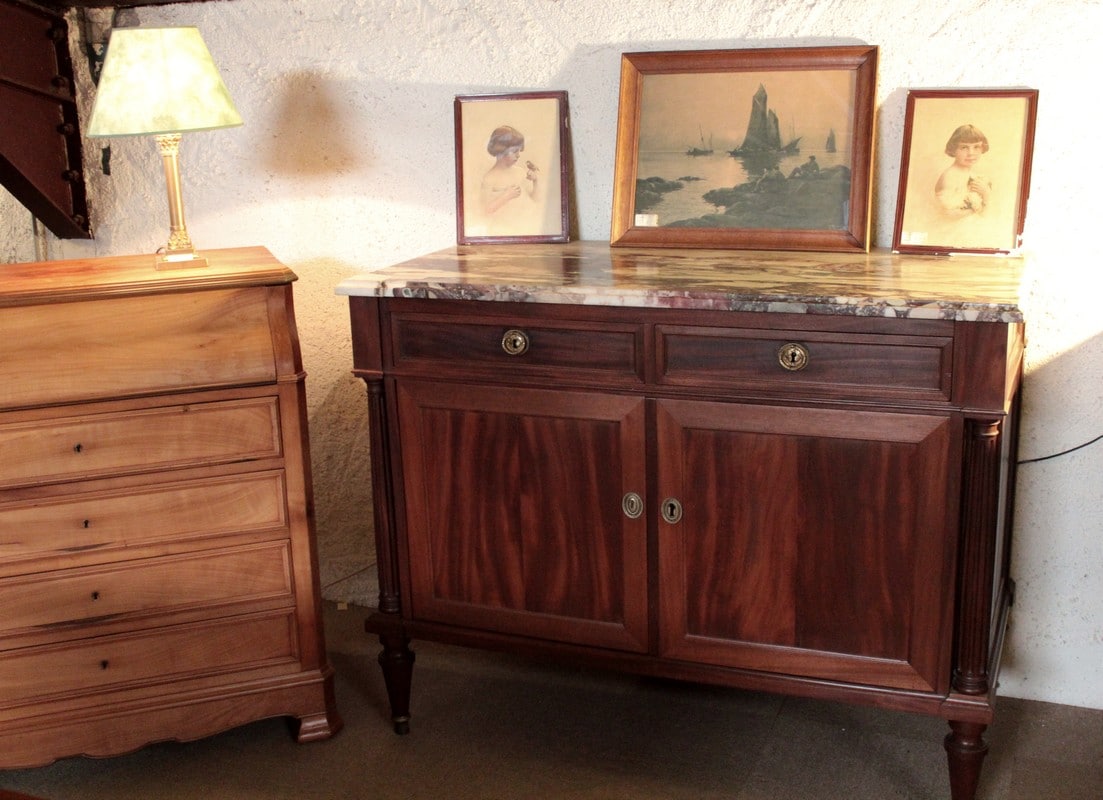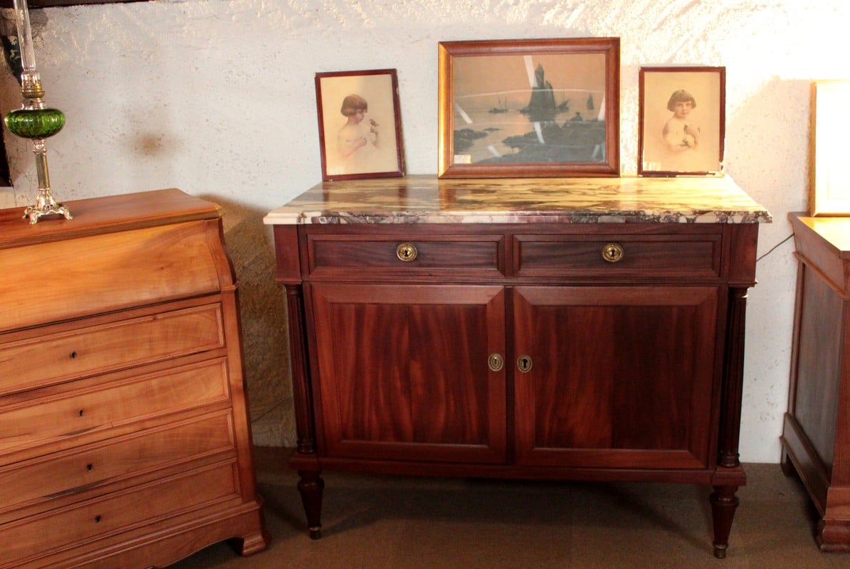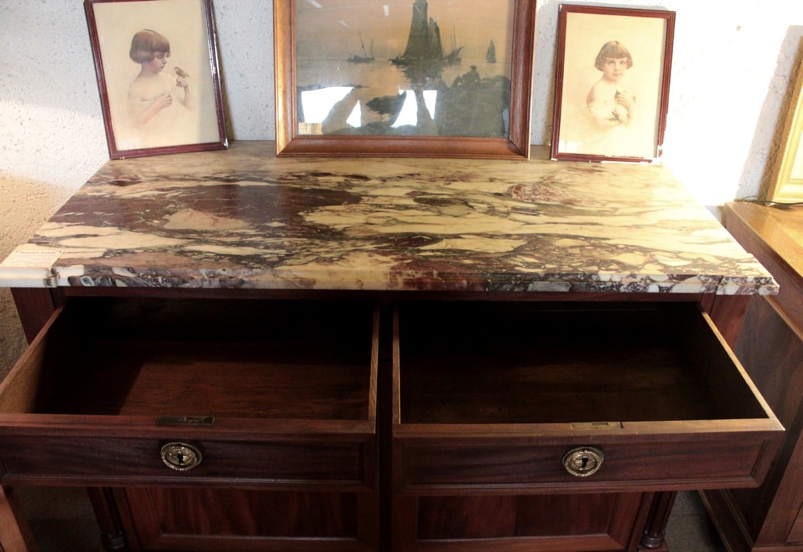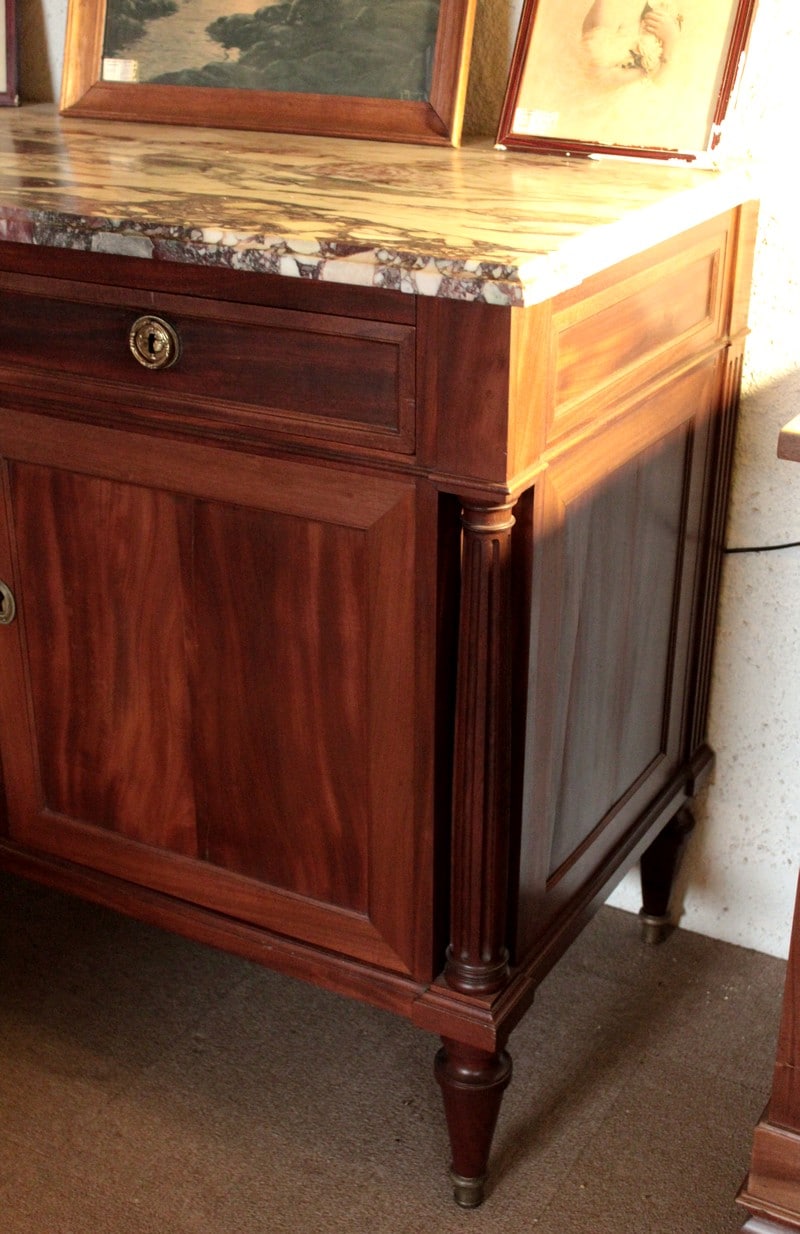 Buffet de style Louis XVI en acajou avec dessus de marbre veiné blanc/gris/bordeaux. Il ouvre par 2 tiroirs dans la ceinture et 2 portes. Les poignées et entrées de serrures sont en bronze. Il repose sur 4 pieds fuselés terminés par des sabots de bronze.