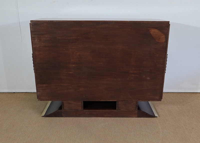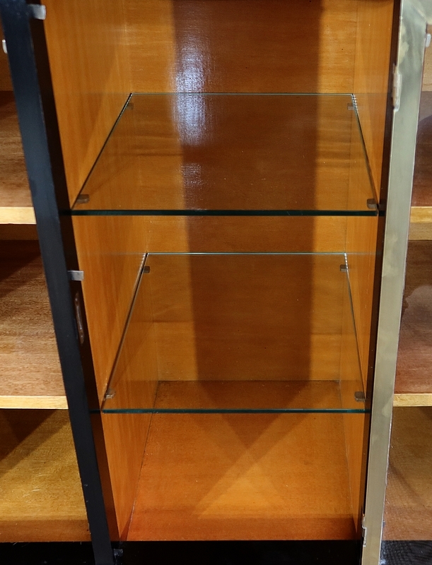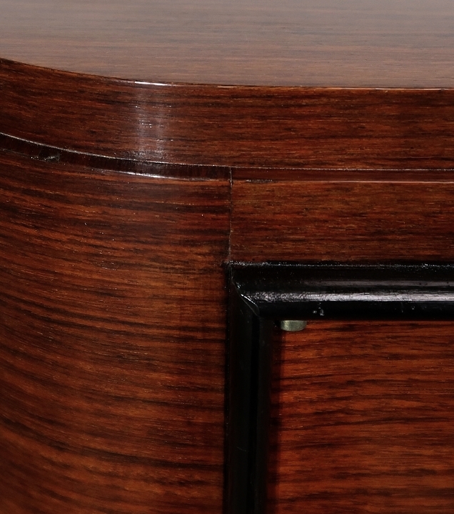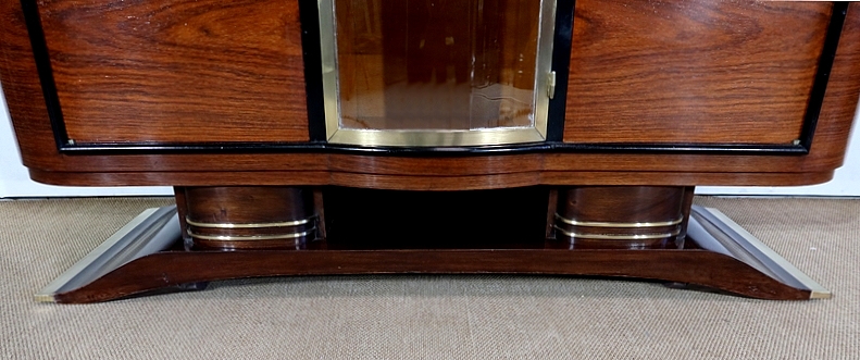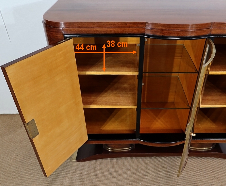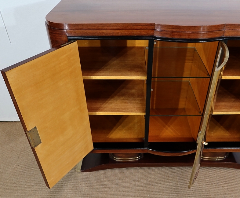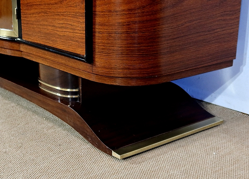 Ce Buffet d’entre-deux repose sur deux éléments en palissandre ornementés de bandes en saillies en laiton massif, surplombant un socle s’affinant dans les extrémités et se terminant par un élément de laiton.