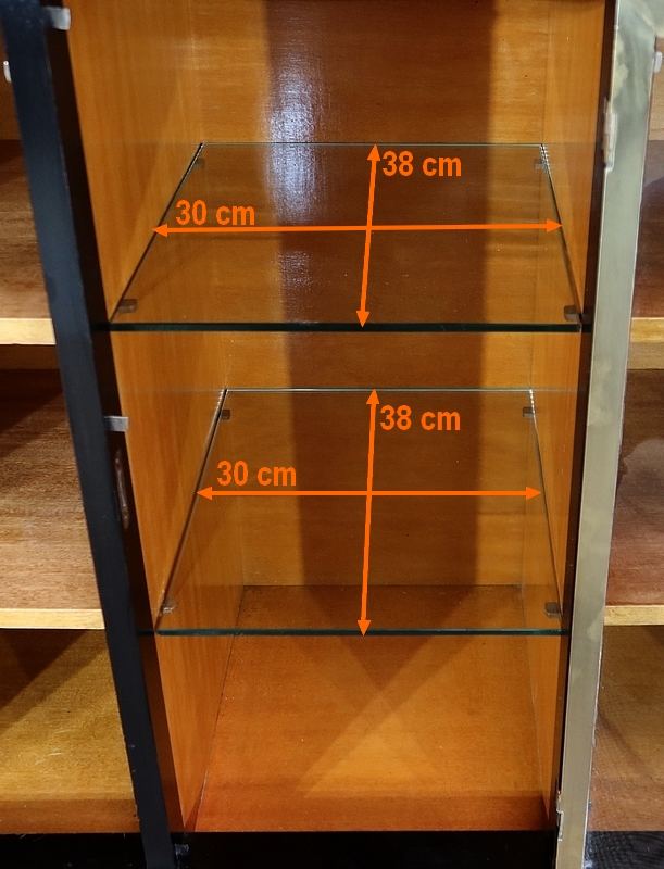 Ce mobilier aux formes galbées possède deux portes ouvrant par briquets déportés en laiton sur les côtés, et une porte vitrée cerclée de laiton et monté sur paumelles en laiton également. Cette vitrine centrale munie de deux étagères en verre donne la possibilité de mettre en valeur de belles pièces tout en leur permettant d’être protégées. Les deux portes pleines révèlent quant à elles, un espace de rangement spacieux munis d’étagères. L’intérieur en Satinwood apporte une finition élégante à ce buffet rare.