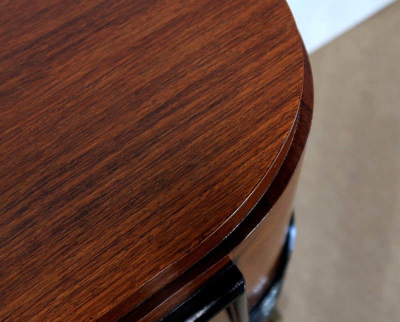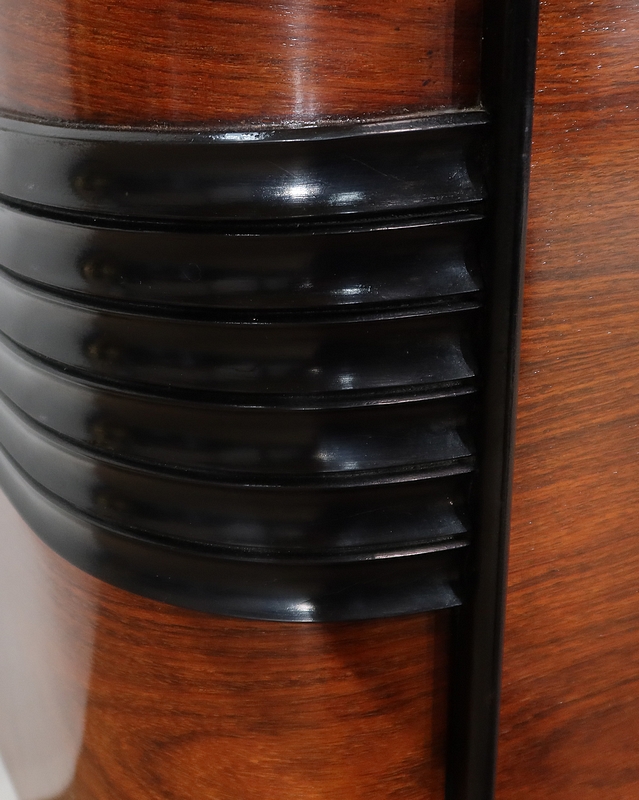 Ce meuble à la couleur chatoyante se caractérise notamment par ses côtés arrondis souligné d’un élément de bois façonné de 6 gorges. Les portes sont également agrémentées de cadres en bois noirci.