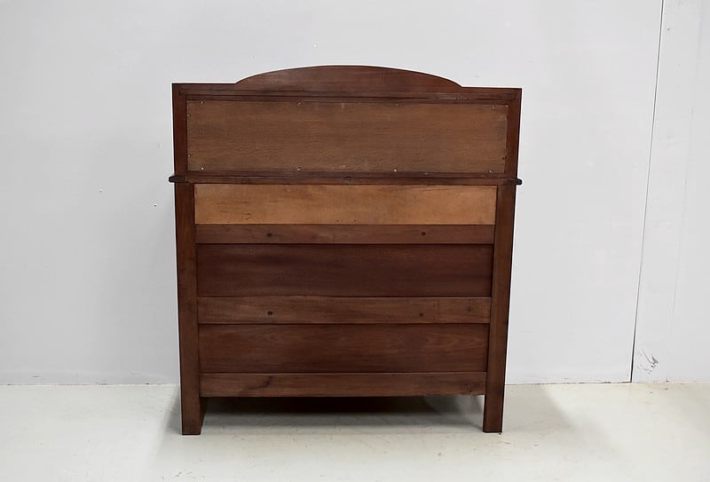 Sa rehausse est composée d’une tablette moulurée surmontée d’un petit fronton sculpté d’un cachet central. Le dessous dispose en fond d’une glace au mercure.