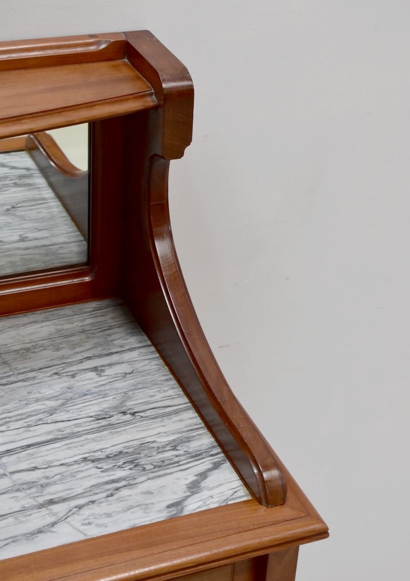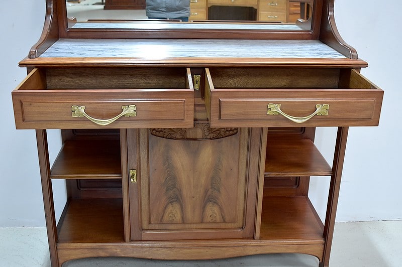 La partie basse du meuble est agrémentée d’un marbre sur le dessus blanc veiné de gris réparé. En dessous, il ouvre en ceinture par 2 tiroirs à poignées à décors de fleurs stylisées.