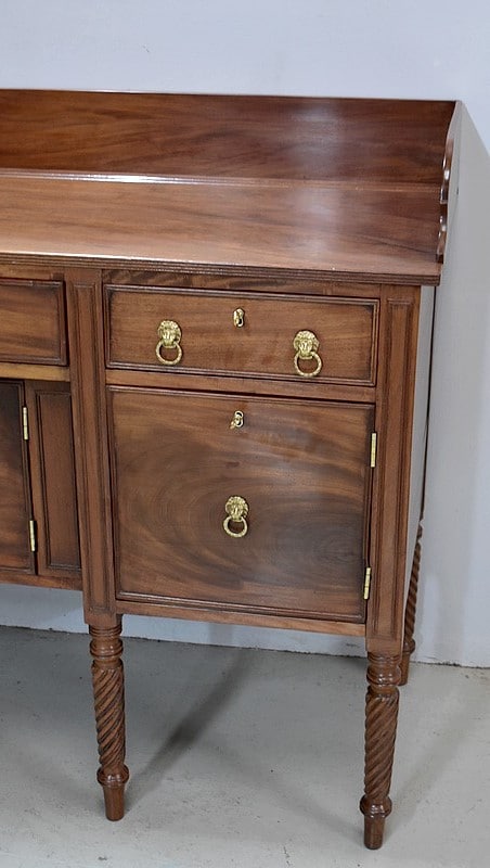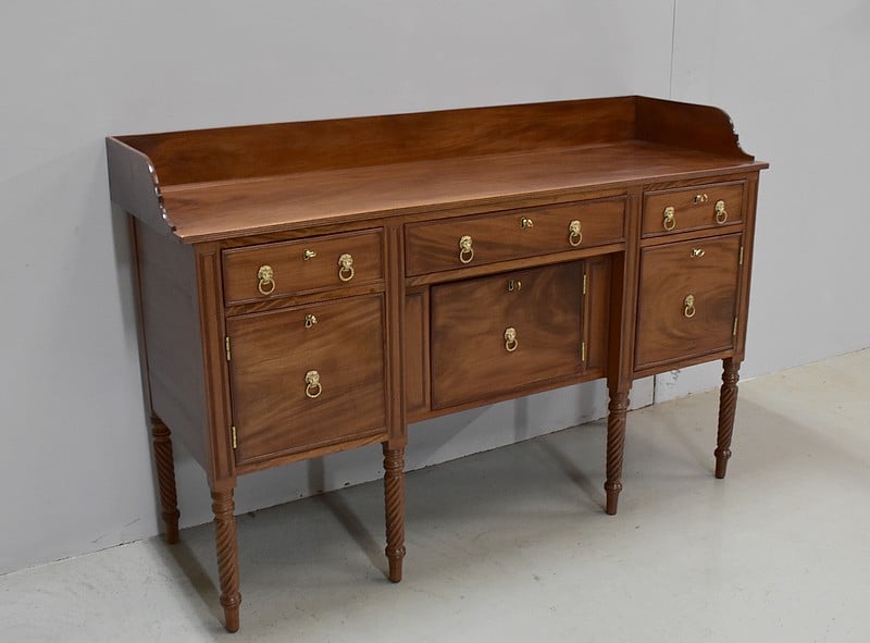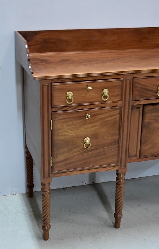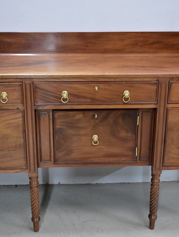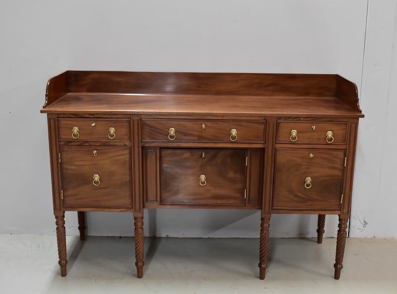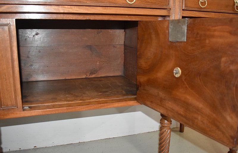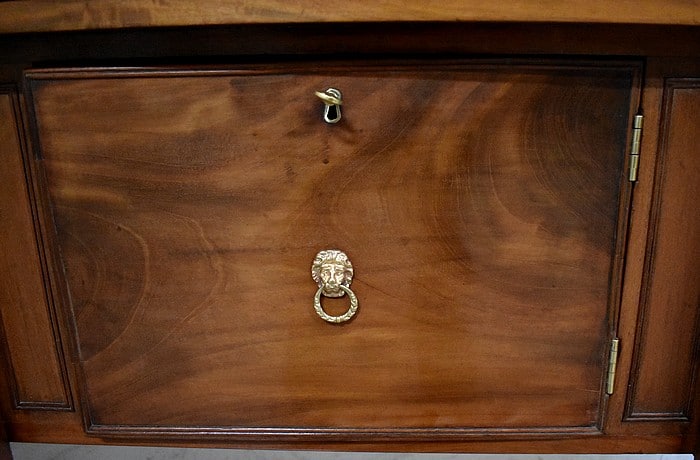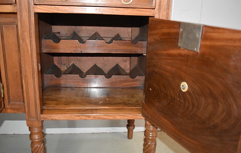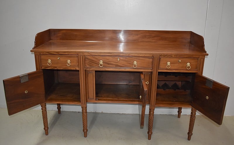 Grand Buffet-Desserte en acajou massif ouvrant par 3 tiroirs et 3 portes, tous fermant à clé (serrures en état) et ornés d’anneaux de tirage en mufles de lions – 2 pour les tiroirs et 1 pour les portes. Dans le compartiment de droite on remarquera des supports à bouteilles.
