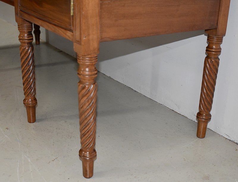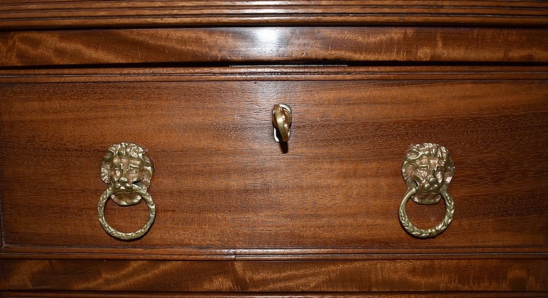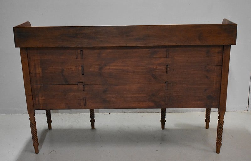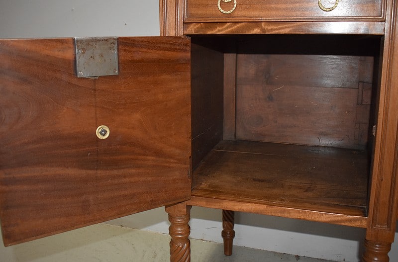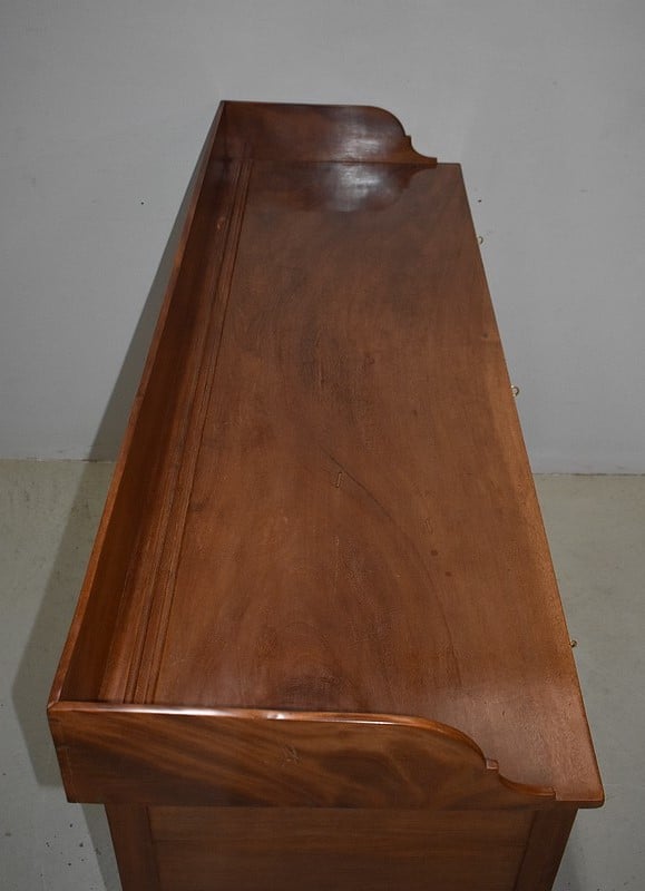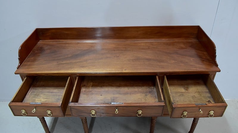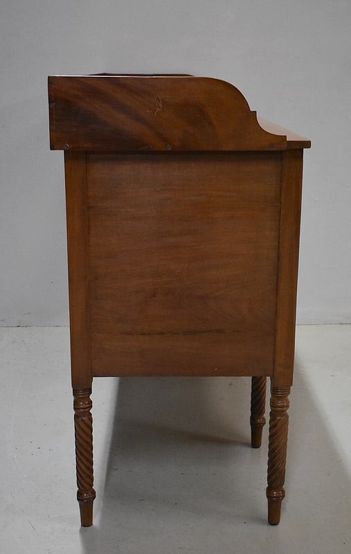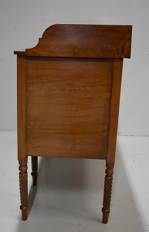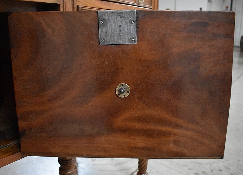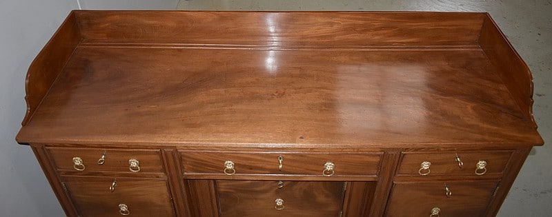 Grand Buffet-Desserte en acajou massif ouvrant par 3 tiroirs et 3 portes, tous fermant à clé (serrures en état) et ornés d’anneaux de tirage en mufles de lions – 2 pour les tiroirs et 1 pour les portes. Dans le compartiment de droite on remarquera des supports à bouteilles.
