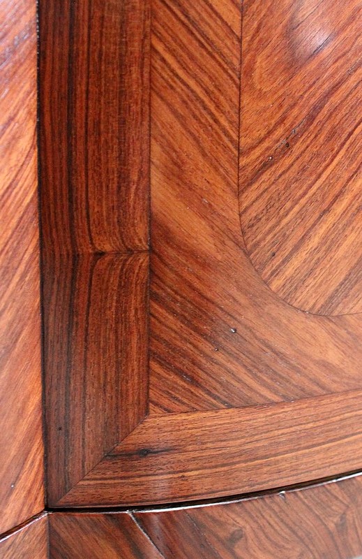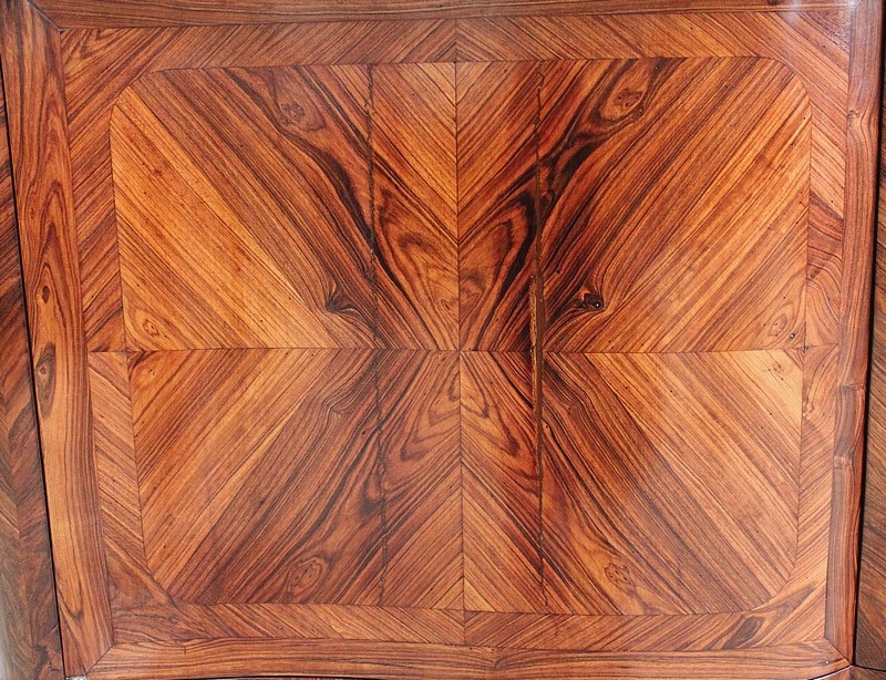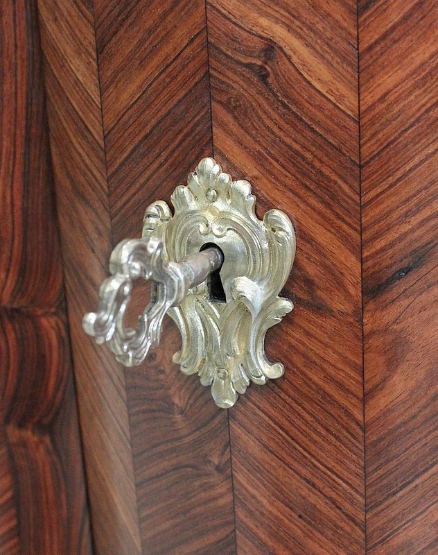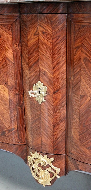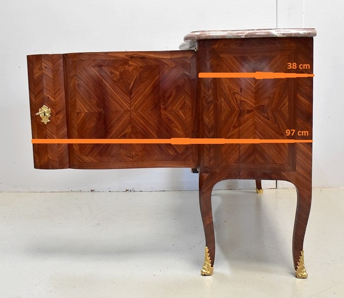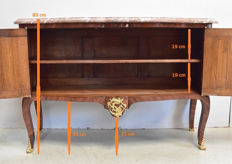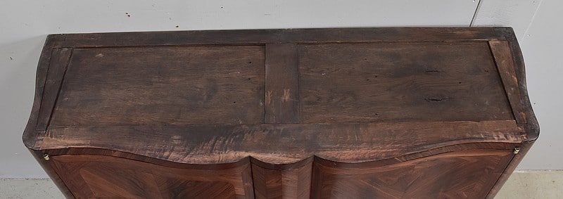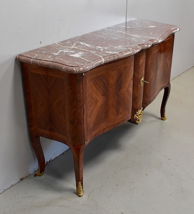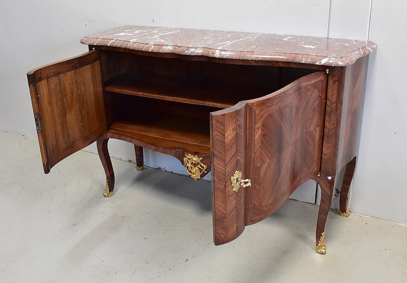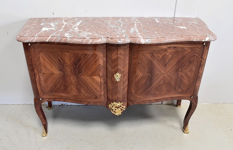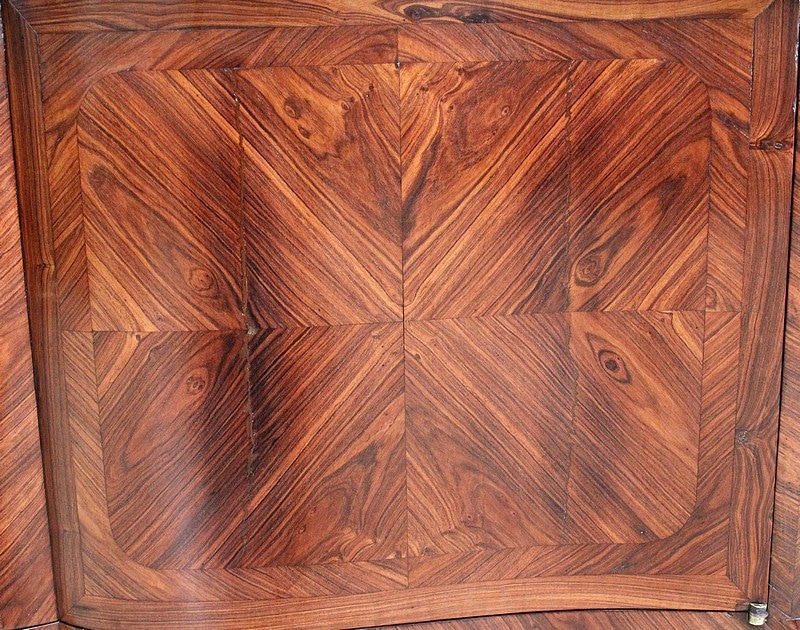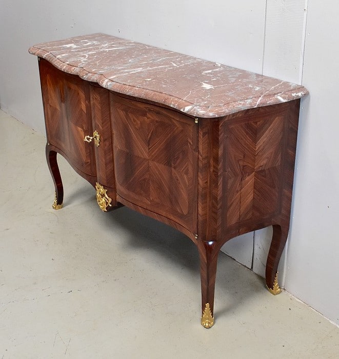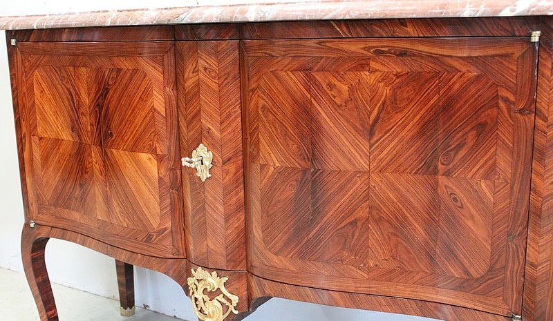 Buffet Desserte en Placage de Bois de Violette, de style Louis XV, à façade Arbalète ouvrant par deux portes. Ces dernières – tout comme les côtés – sont enjolivées de Marqueteries en Ailes de Papillons, avec encadrements en double frises, les premières en Chevrons, les secondes en fil, ou inversement. L’élément central, bombé, est partie intégrante de la porte de droite. Elle est décorée de quatre bandes verticales en Chevrons et dotée d’une entrée de serrure d’origine en Bronze découpé. Le meuble est fourni avec sa clé, d’époque également. La porte de gauche est pourvue de fermoirs Métal haut et bas. On notera que ces deux vantaux mouvementés sont montés sur des briquets en laiton déportés.