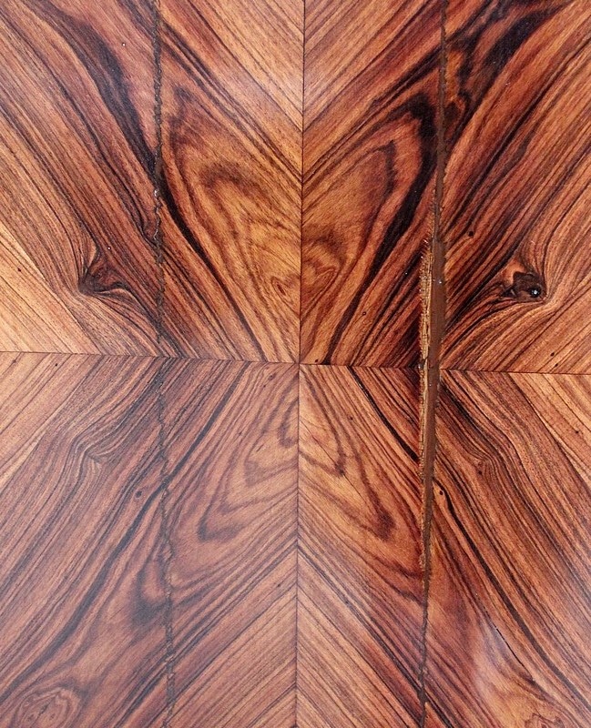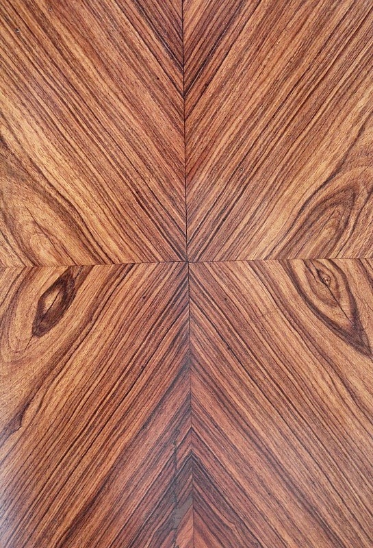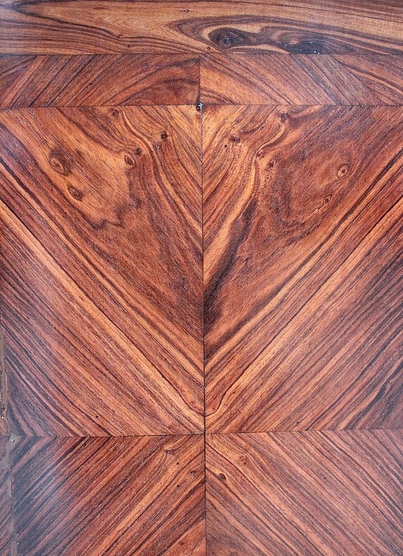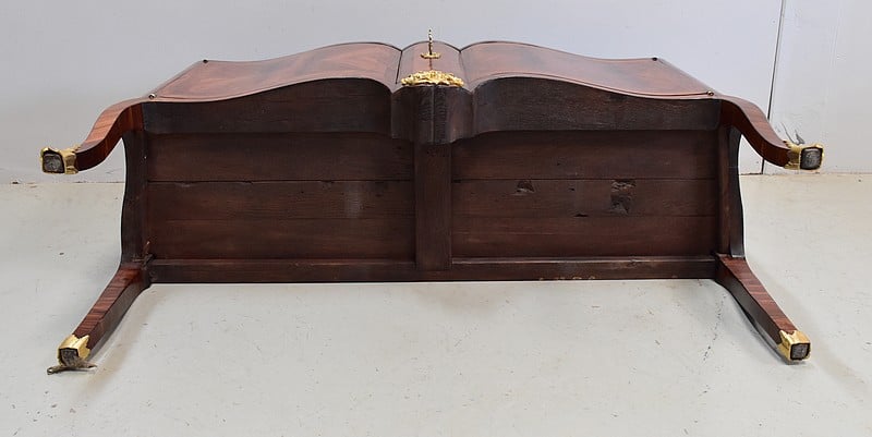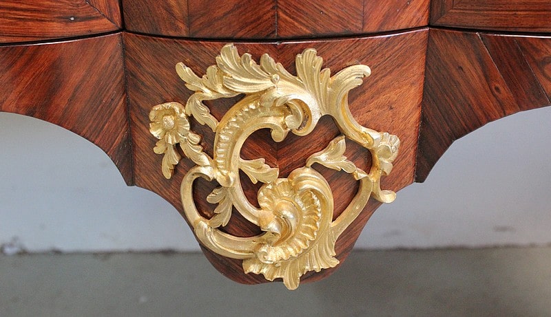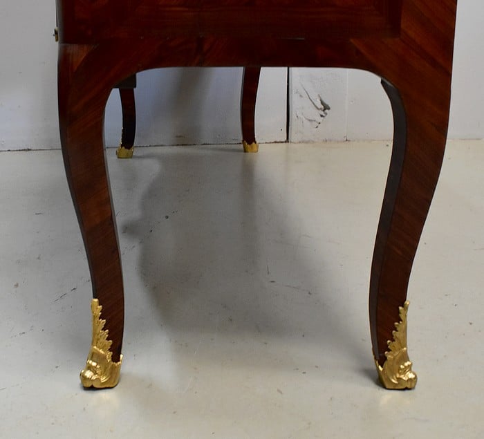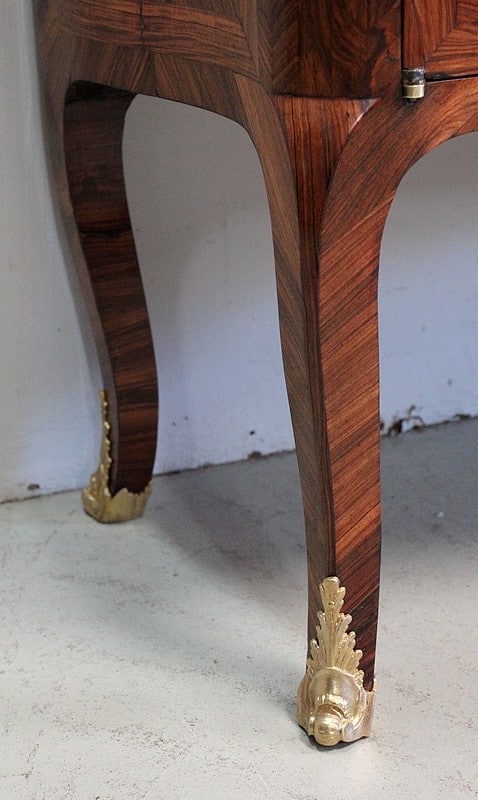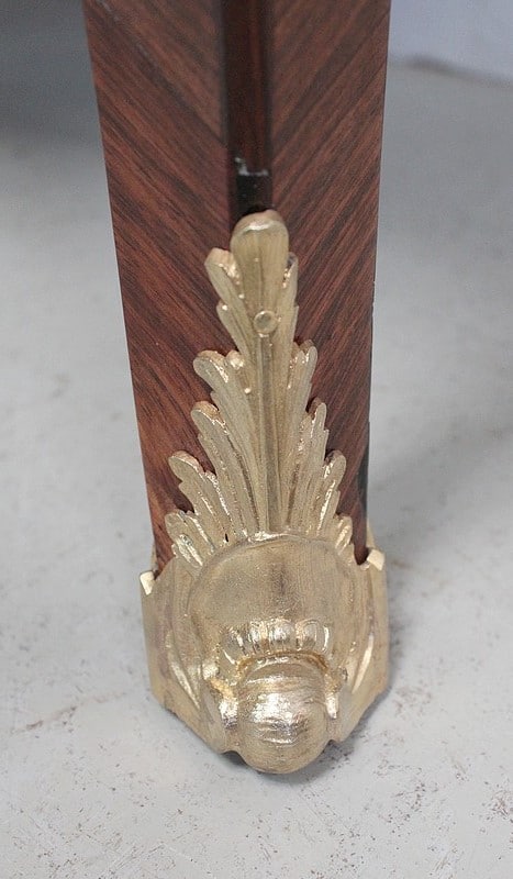 L’ensemble repose sur quatre pieds galbés, Marquetés de Bois de Violette en Chevrons et terminés par quatre sabots laiton.