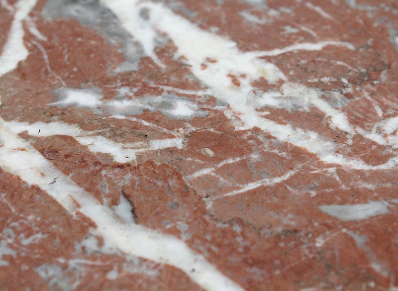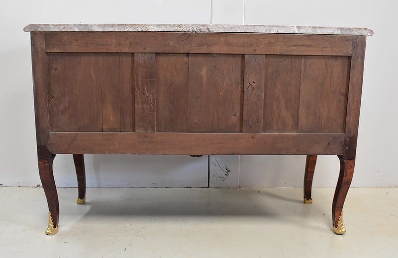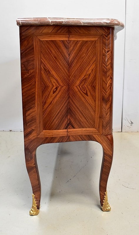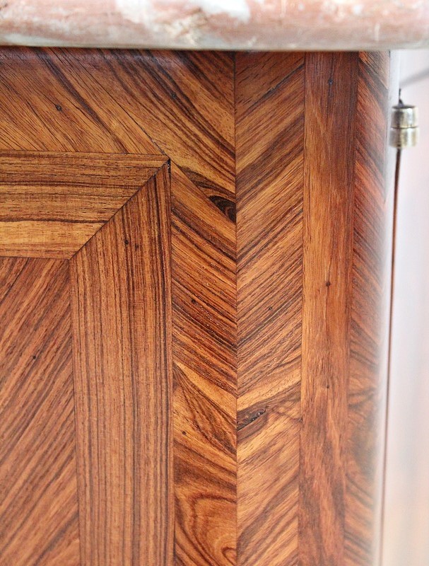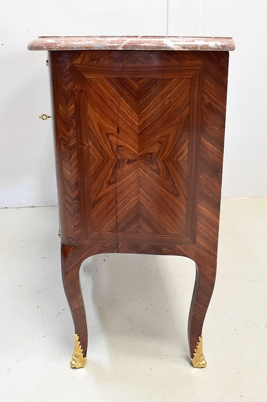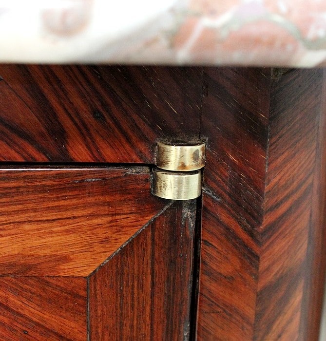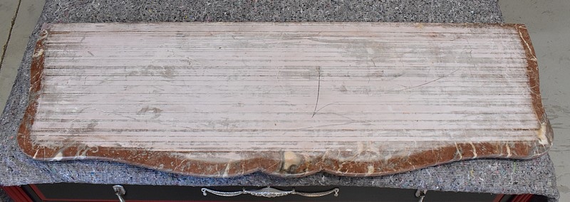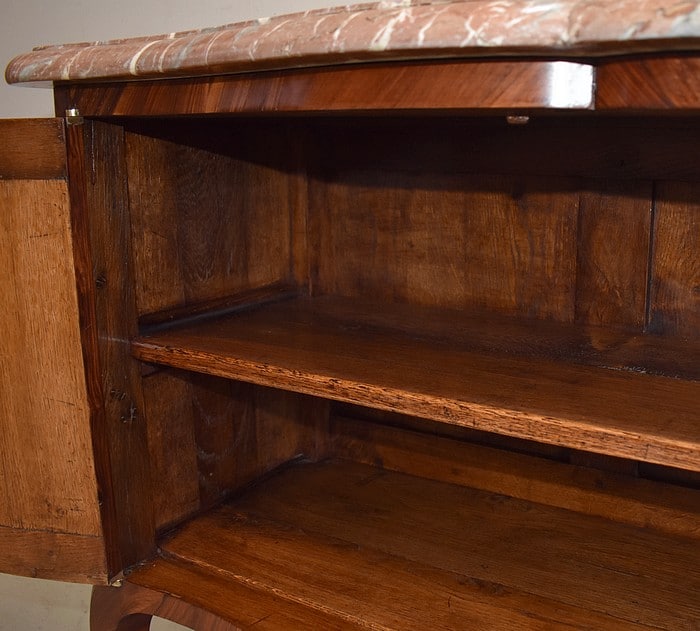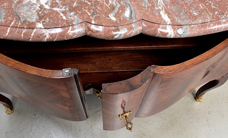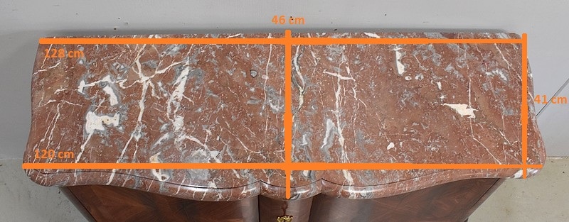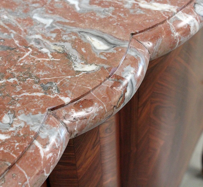 Le dessus est un Marbre des Pyrénées granité à dominante Rouge avec des nuances de Gris et de Blanc. Il est taillé à l’avant, aux angles et sur les côtés selon les lignes du meuble et il est mouluré sur son pourtour.