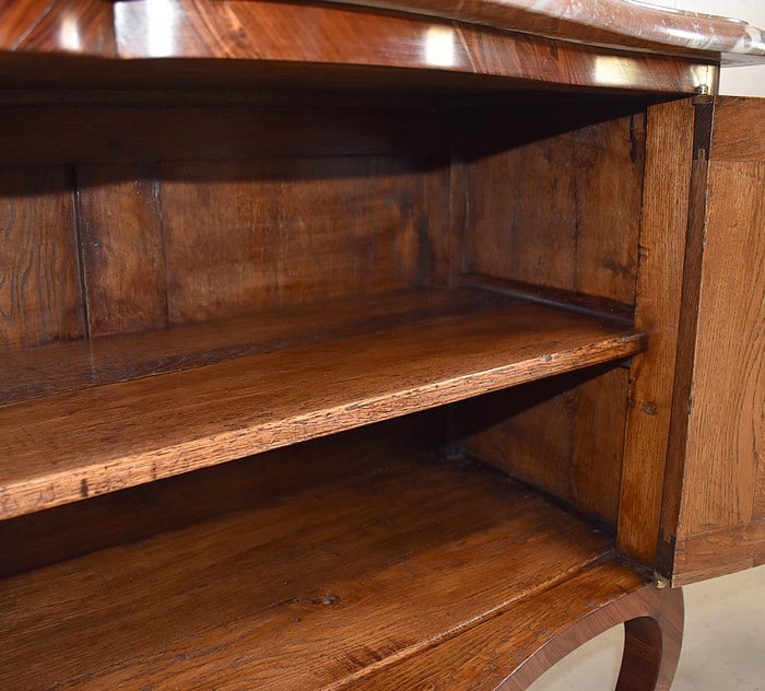 Les montants avants de ce Buffet Commode sont en demi-ronds et le cul-de-lampe est garni d’un Bronze feuillagé.