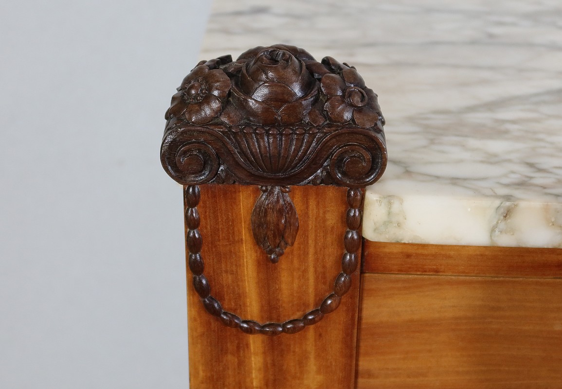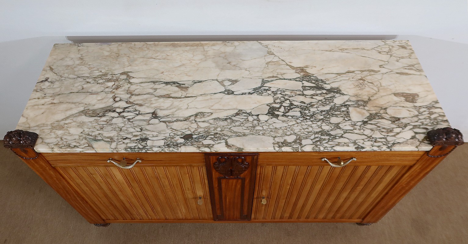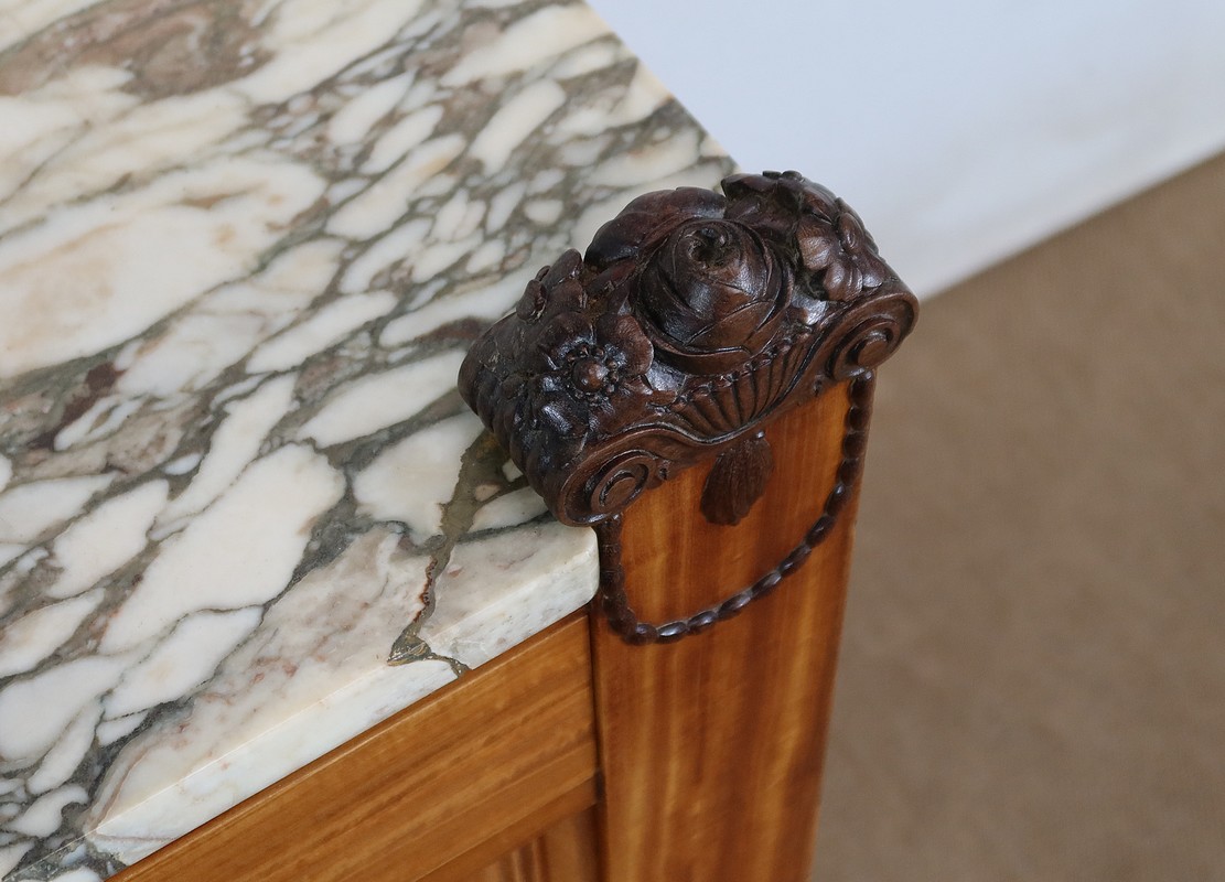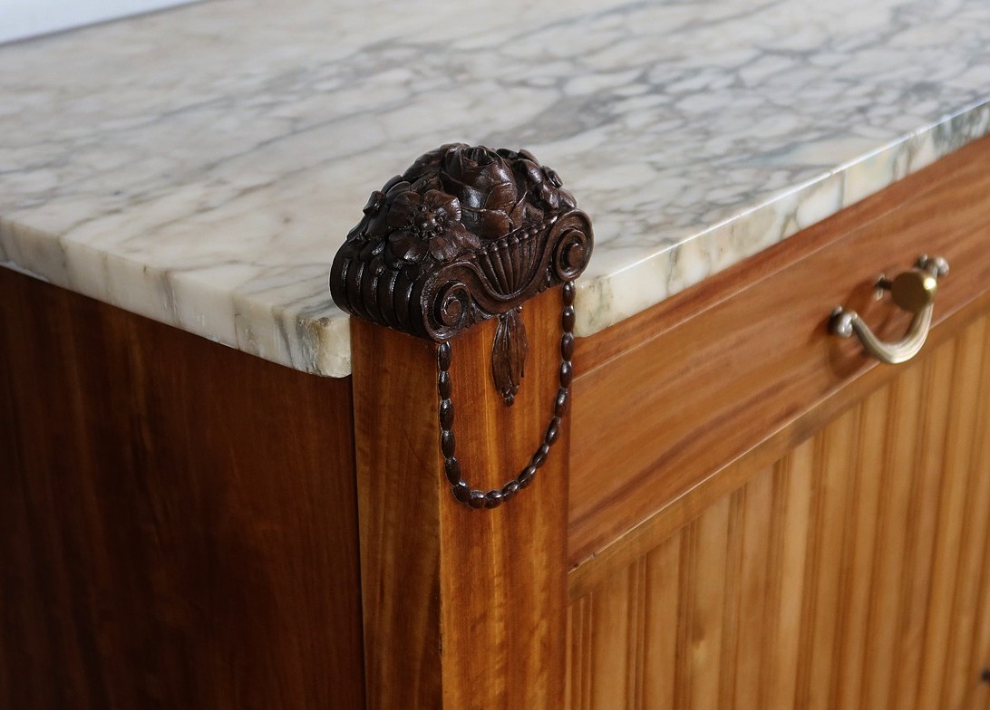 Rare meuble Art Déco de Fabrication Parisienne sommé d’un épais marbre aux tons nuancés et d’ornementations sculptées.