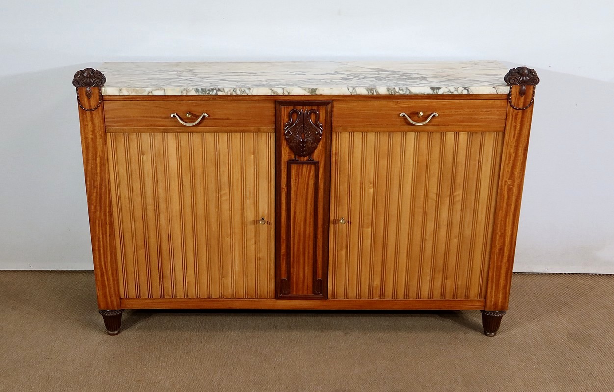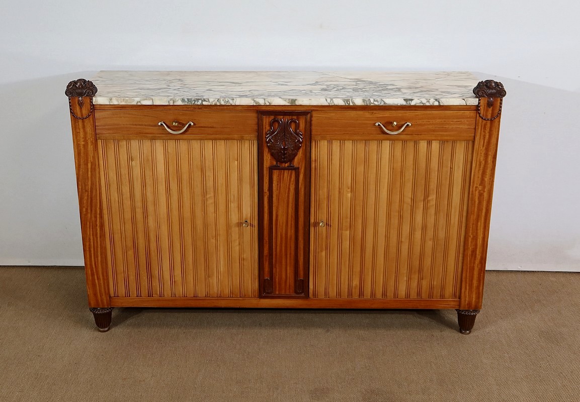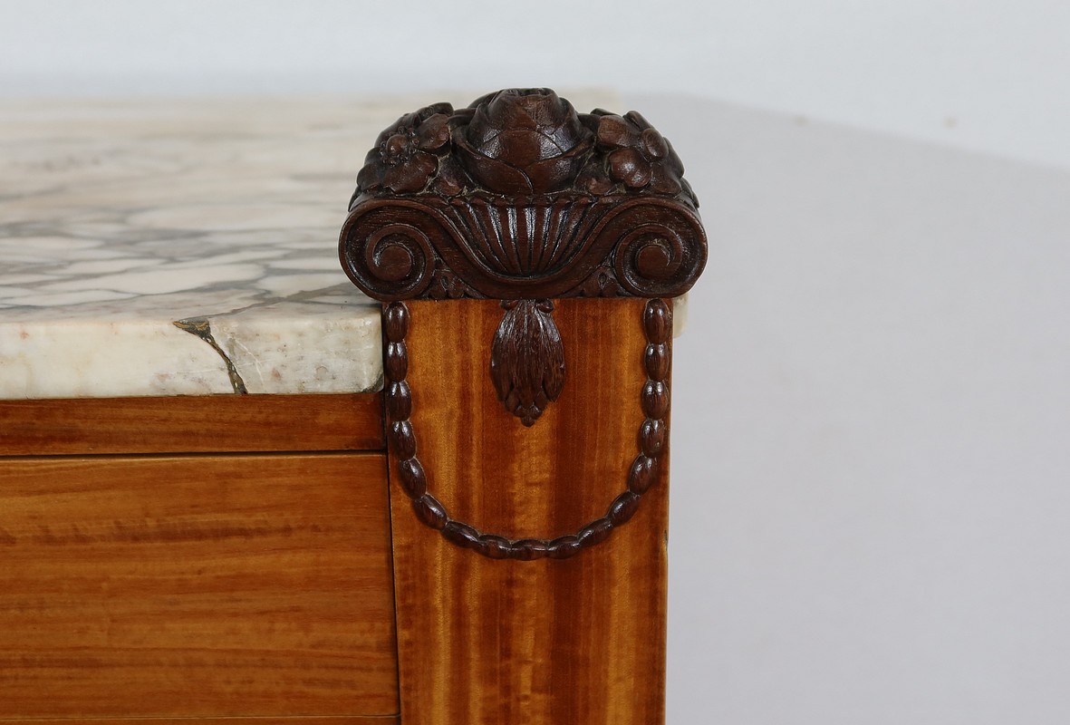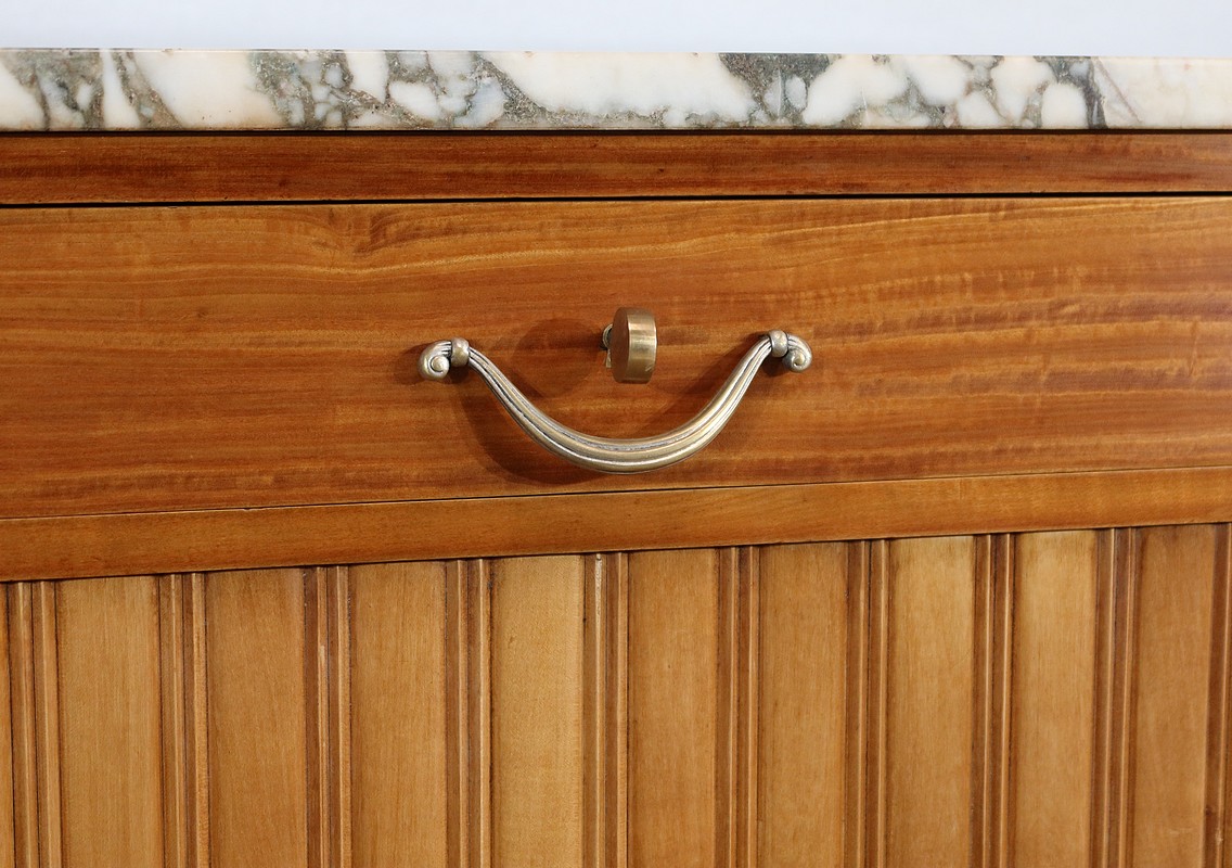 Rare meuble Art Déco de Fabrication Parisienne sommé d’un épais marbre aux tons nuancés et d’ornementations sculptées.