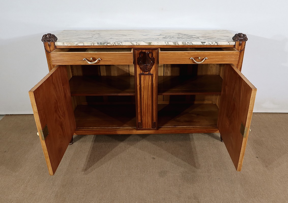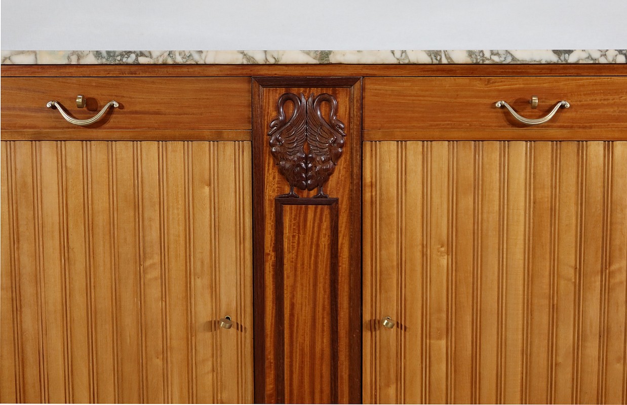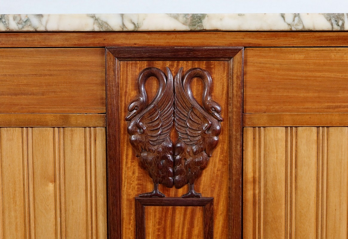 Séparant verticalement les tiroirs et les portes, nous retrouvons au centre un large pilastre avec encadrement et sculptures en palissandre. En partie haute, un couple de cygnes délicats, déploient leurs ailes et recourbent leur cou.