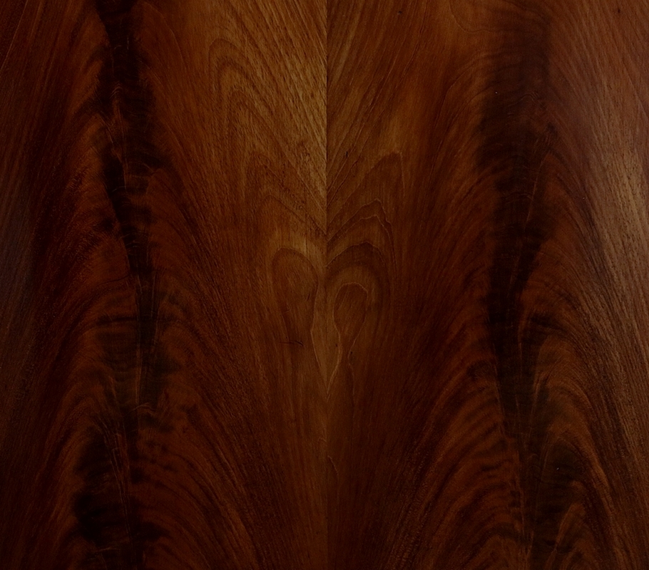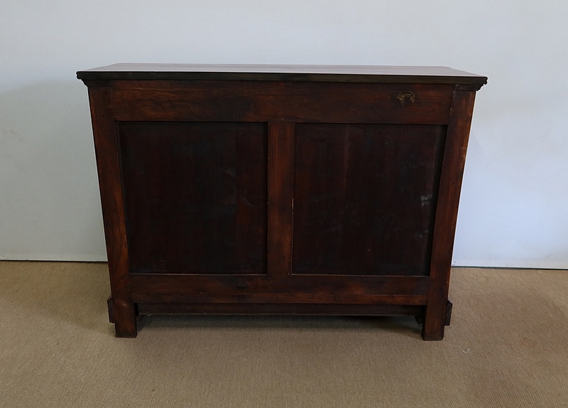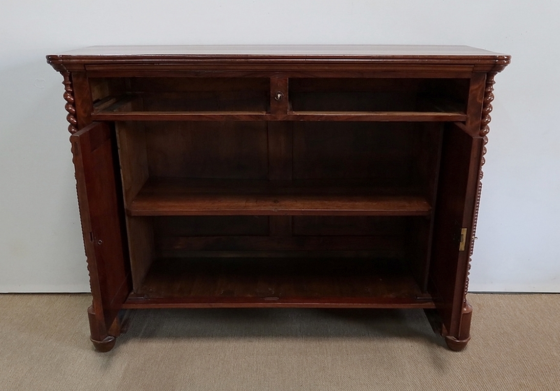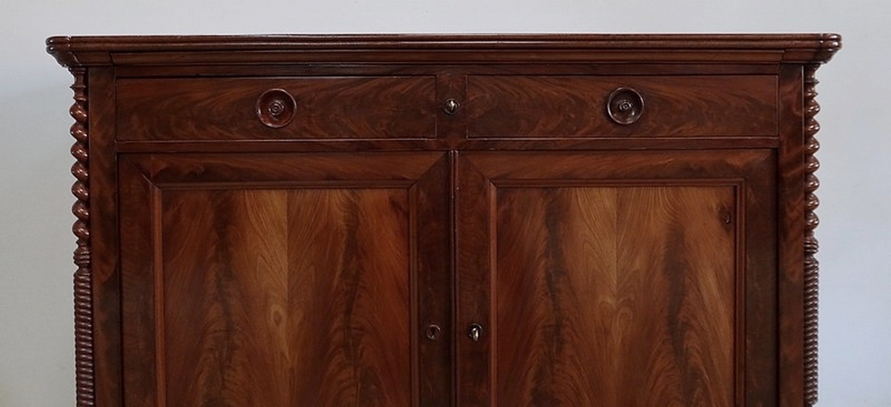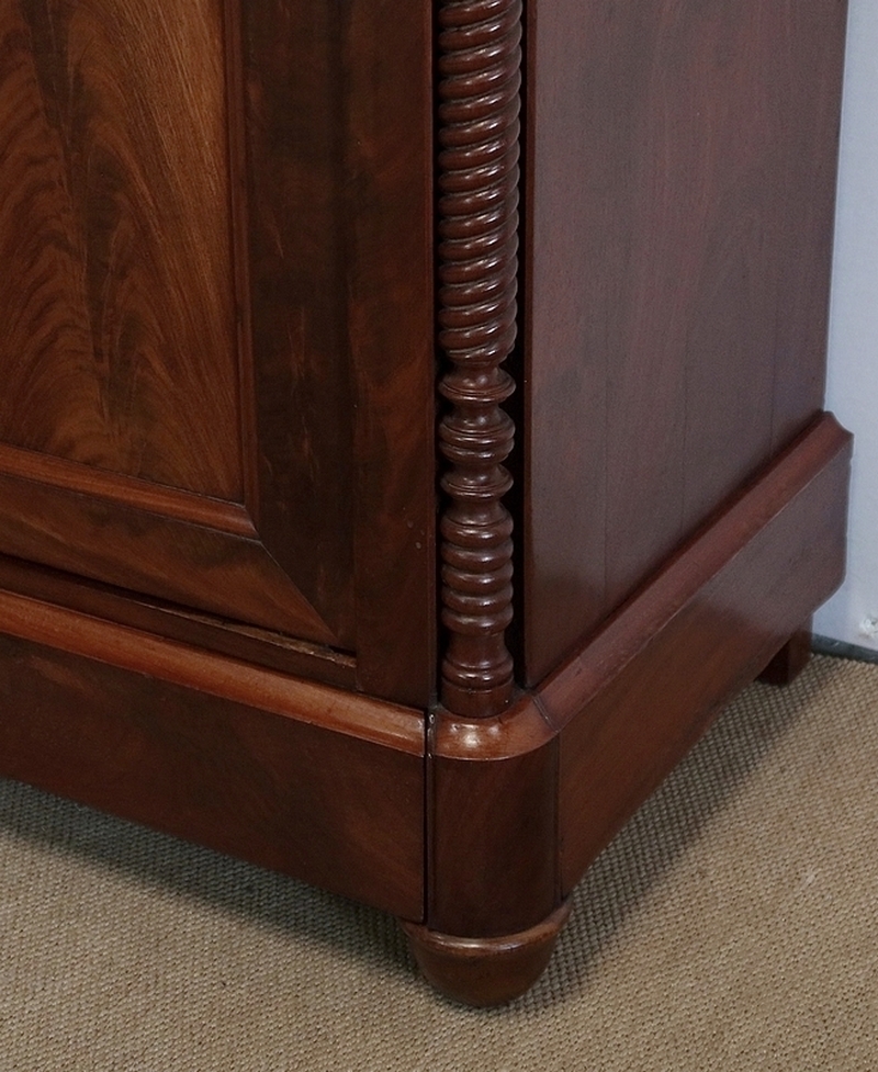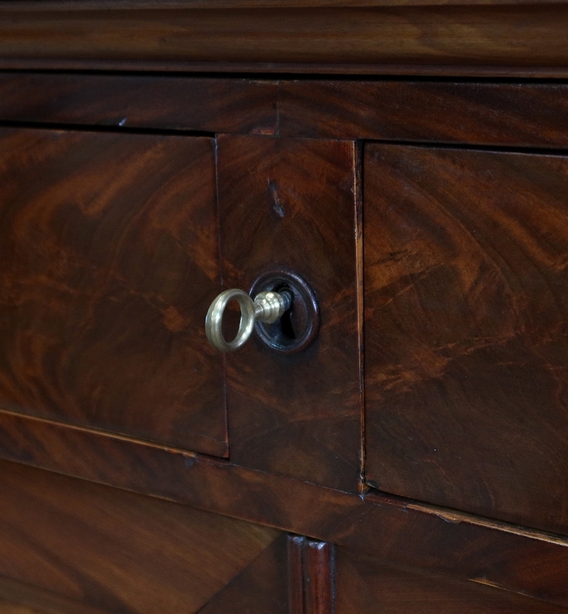 En partie basse, deux portes à encadrement à coupe d’onglet très léger sont munies dans le pourtour intérieur d’une moulure à doucine. Au centre, un panneau de ronce d’acajou développé est accompagné d’un centre joint dans le même goût que le pourtour du dessus. Deux entrées bois et une serrure d’origine en état de fonctionnement avec sa clé sont positionnées sur ces portes qui ont été conçues d’origine rentrantes de chaque côté.