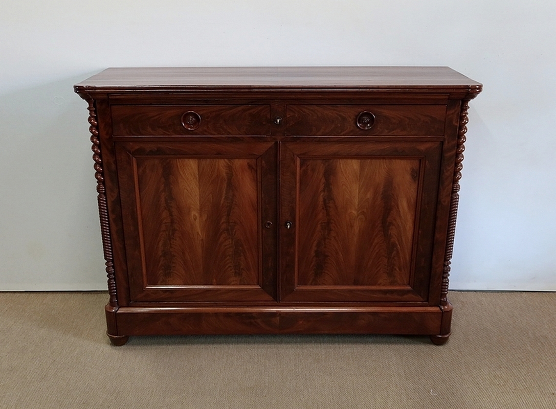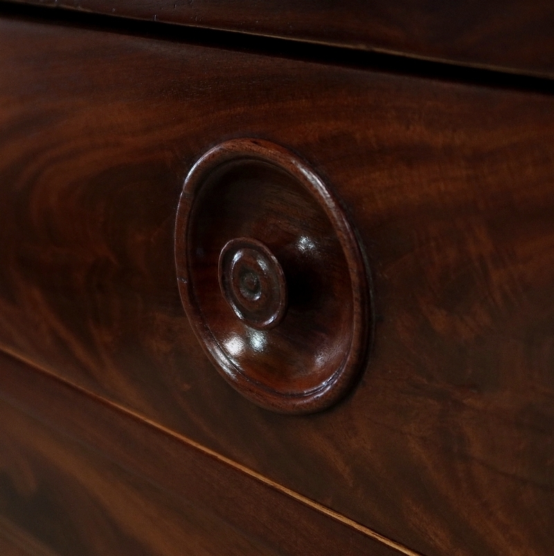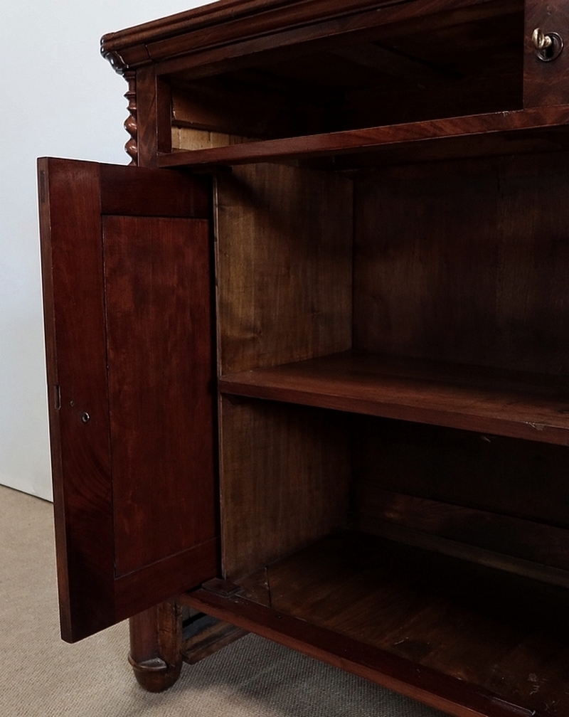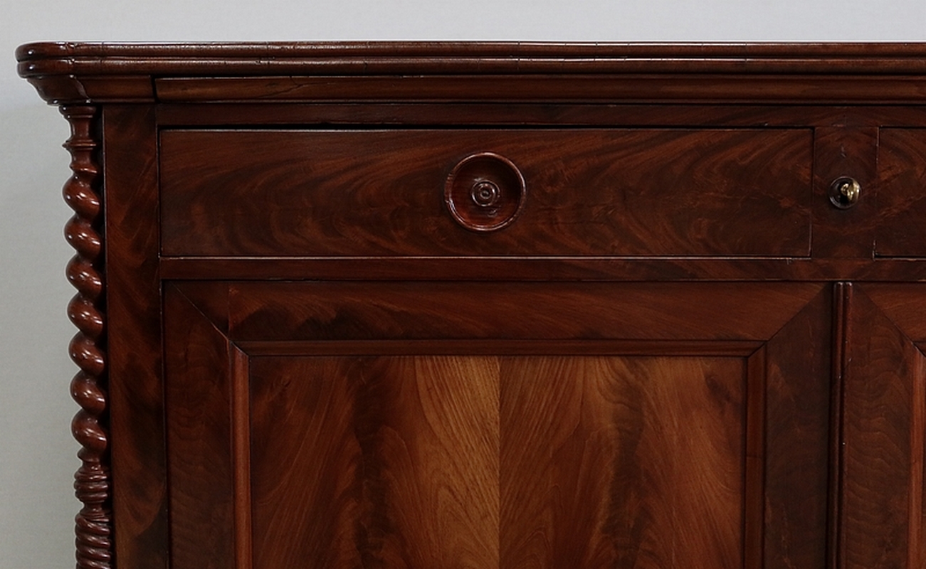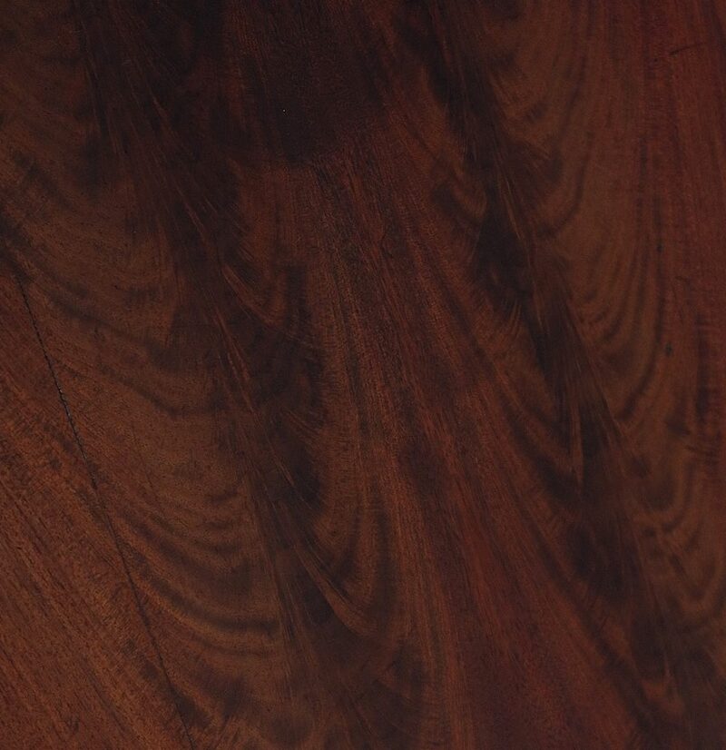 Buffet en Acajou conçu au début du XIXe siècle, composé d’un dessus de bois en placage de ronce d’acajou doté dans son pourtour d’une double moulure en demi-rond avec ressaut aux angles.