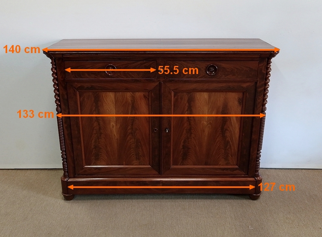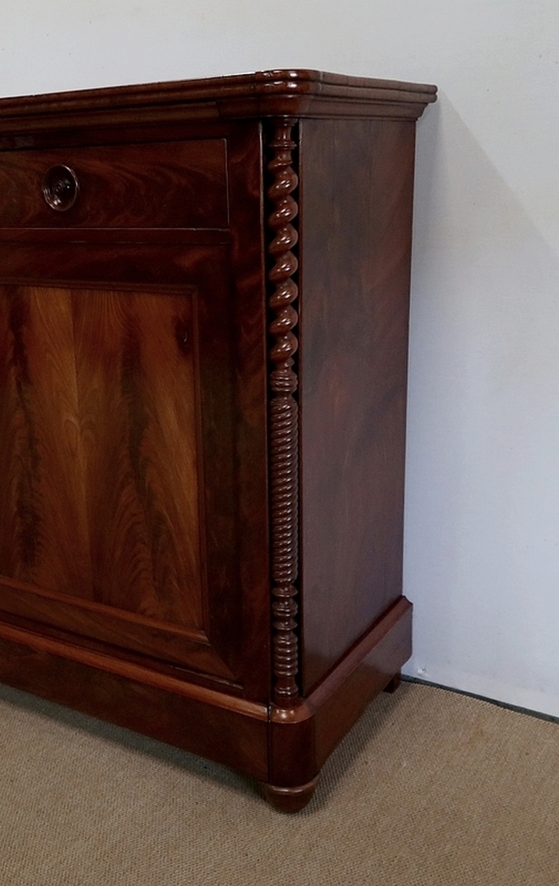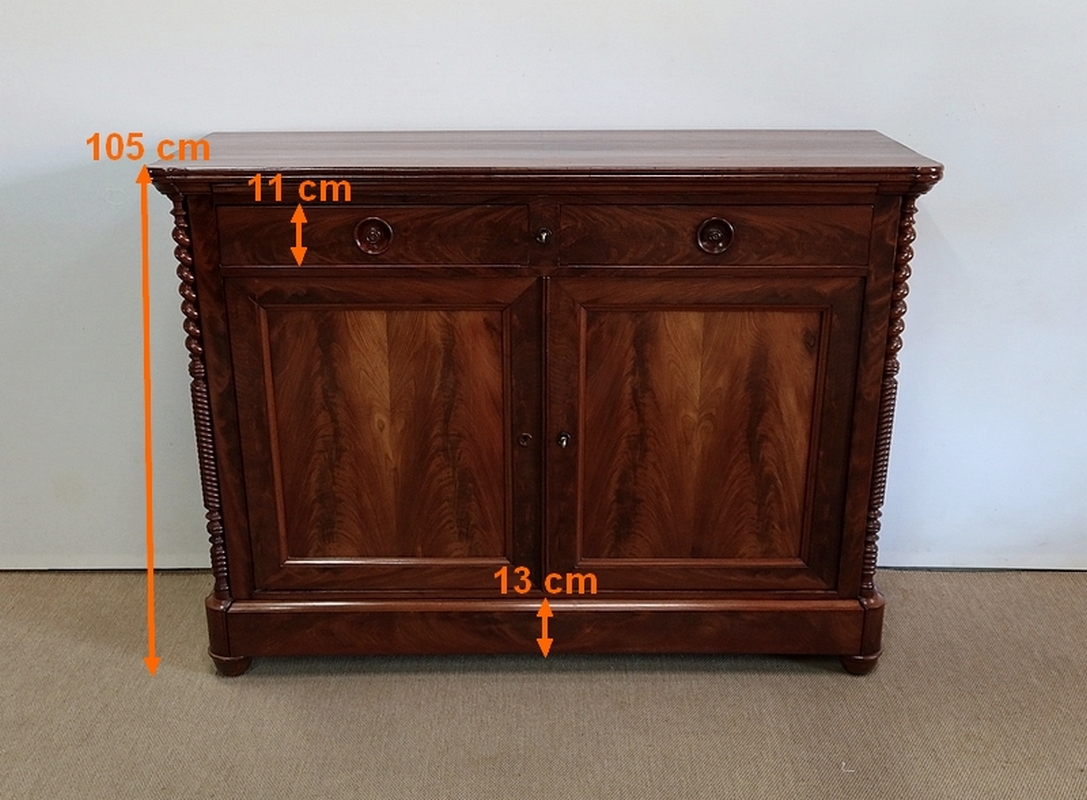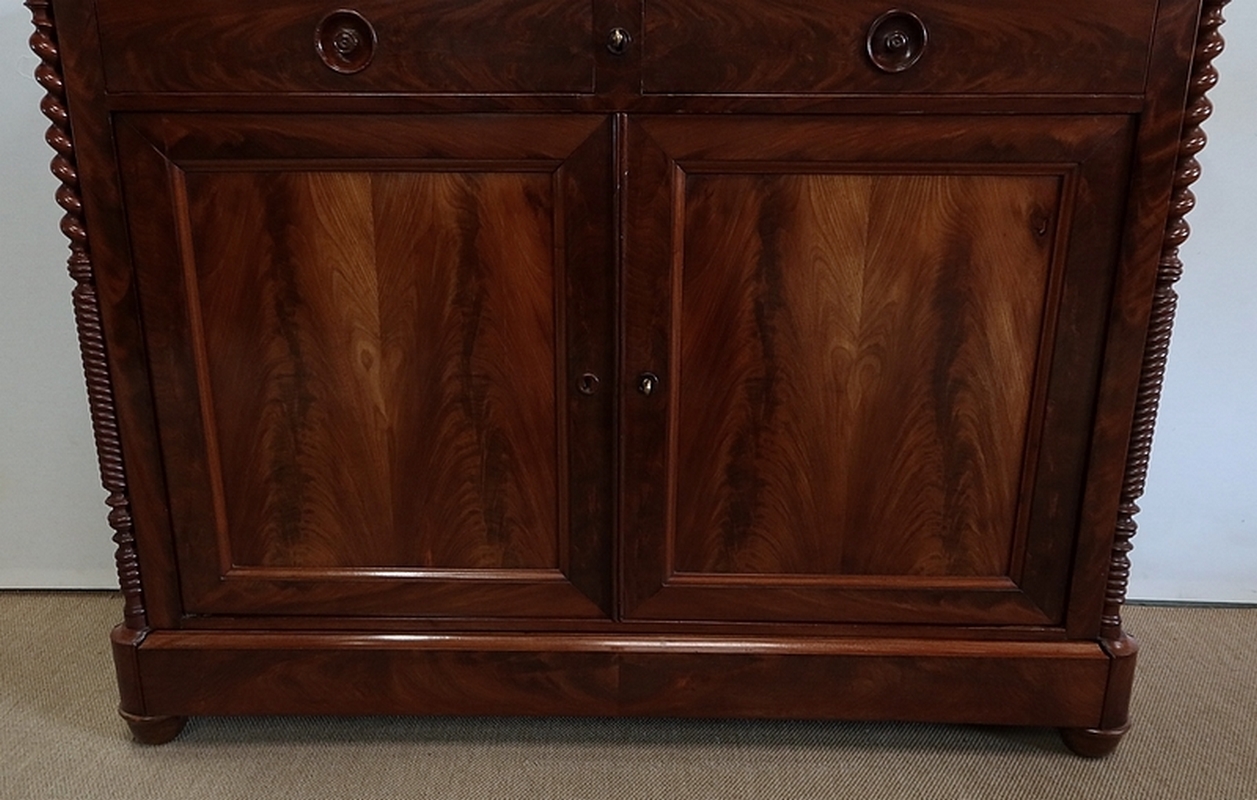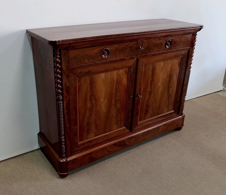 Buffet en Acajou conçu au début du XIXe siècle, composé d’un dessus de bois en placage de ronce d’acajou doté dans son pourtour d’une double moulure en demi-rond avec ressaut aux angles.