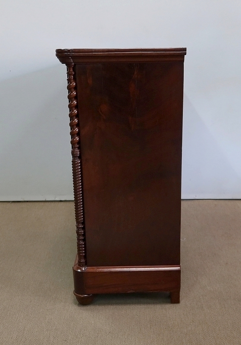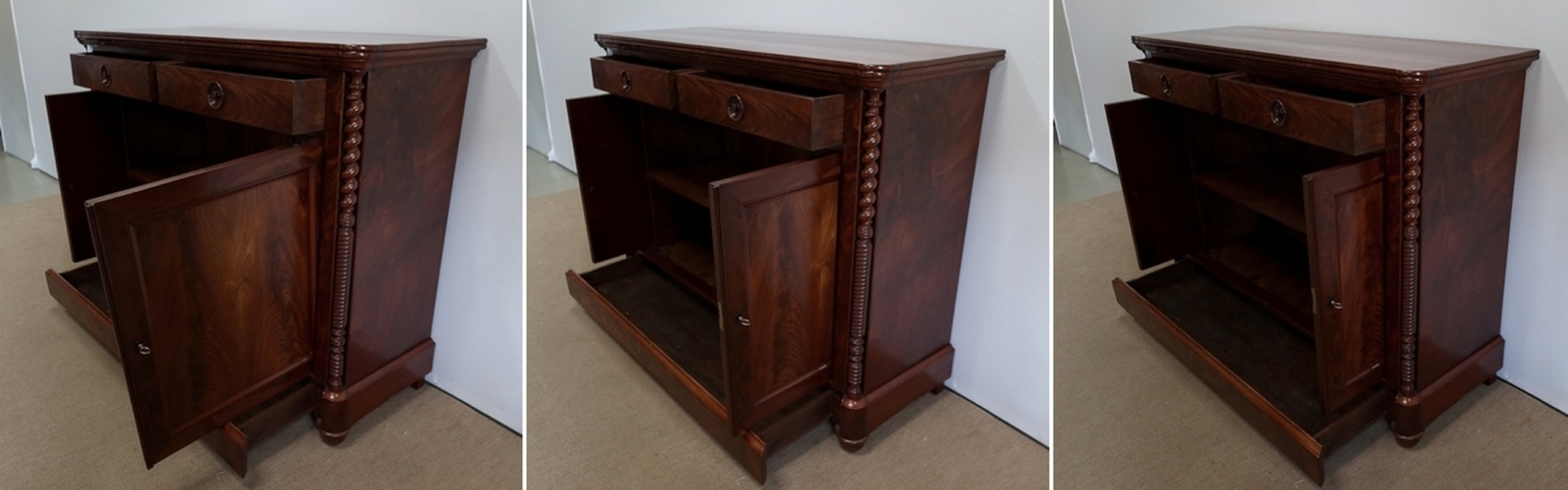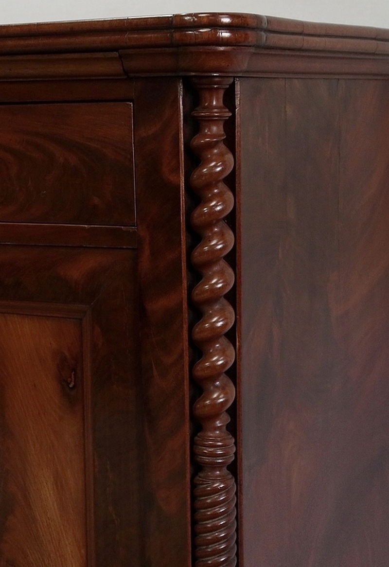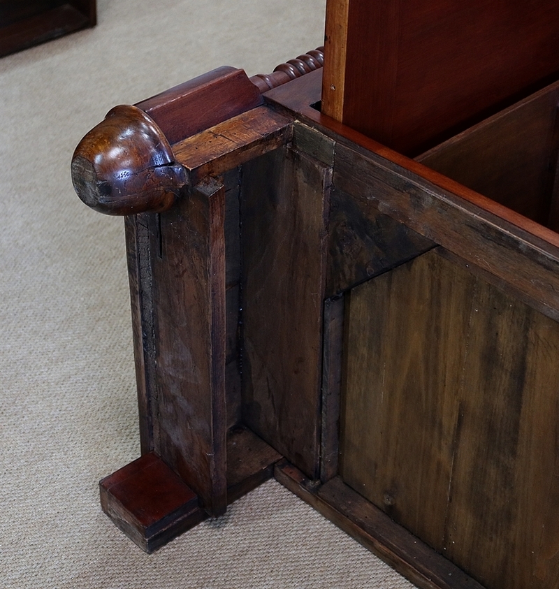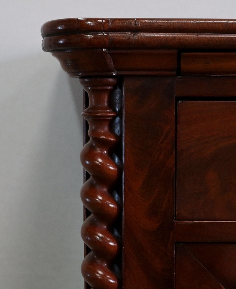 Logée dans chaque pied, une colonne à grosse torsade dans la partie haute et une plus petite torsade en partie basse surplombe une plinthe avec gorge en ronce d’acajou dissimulant un grand tiroir qui repose sur des pieds bas Restauration.