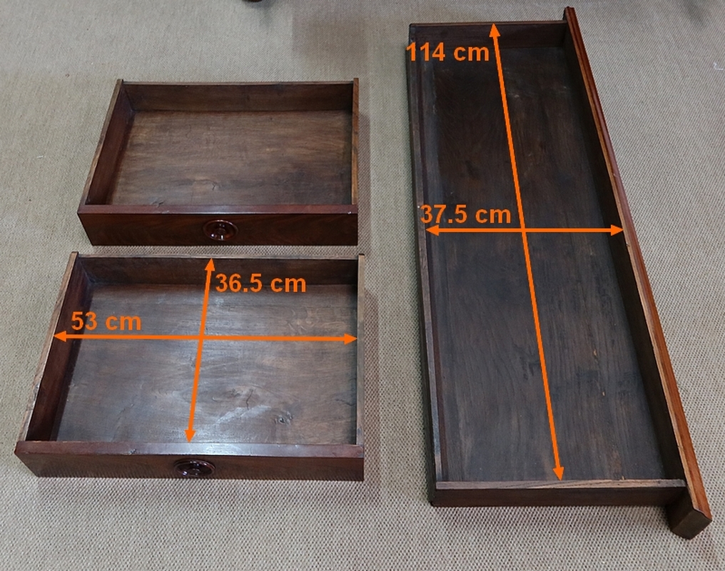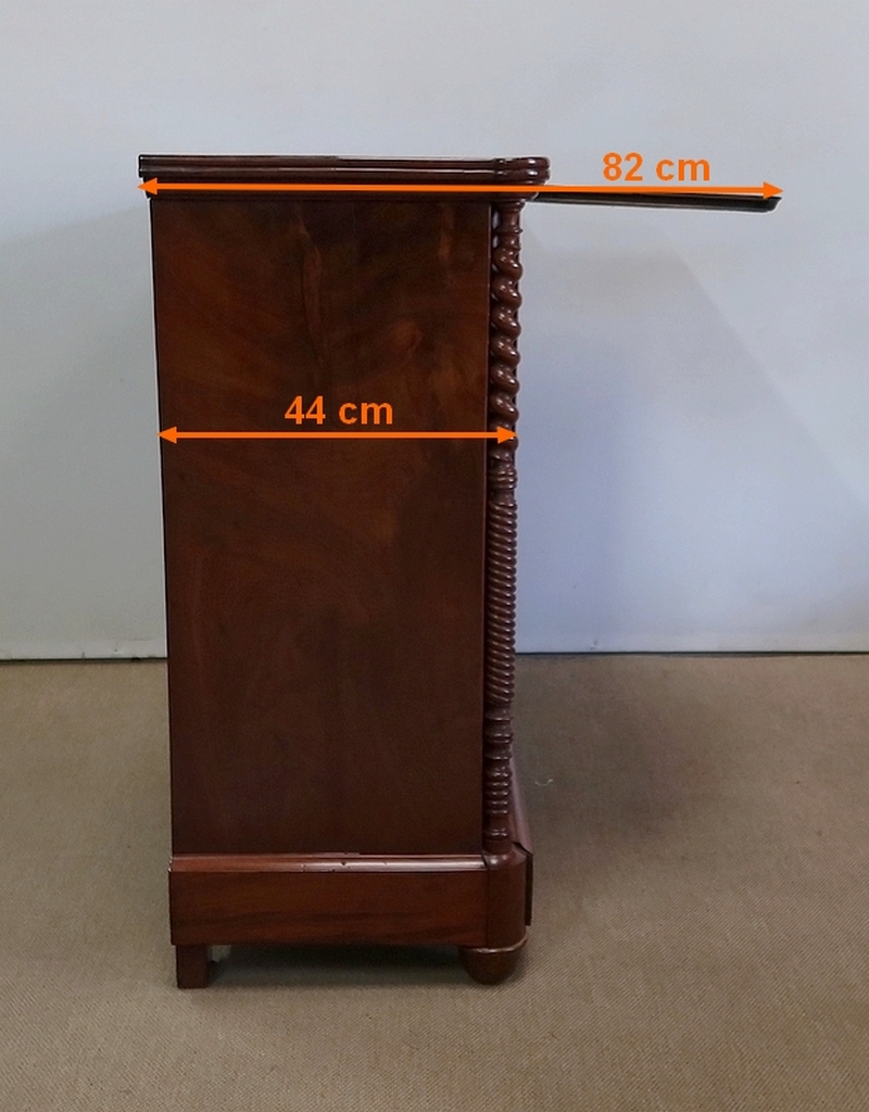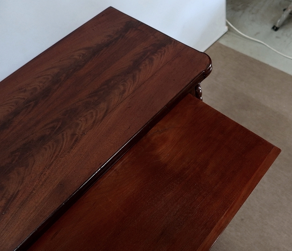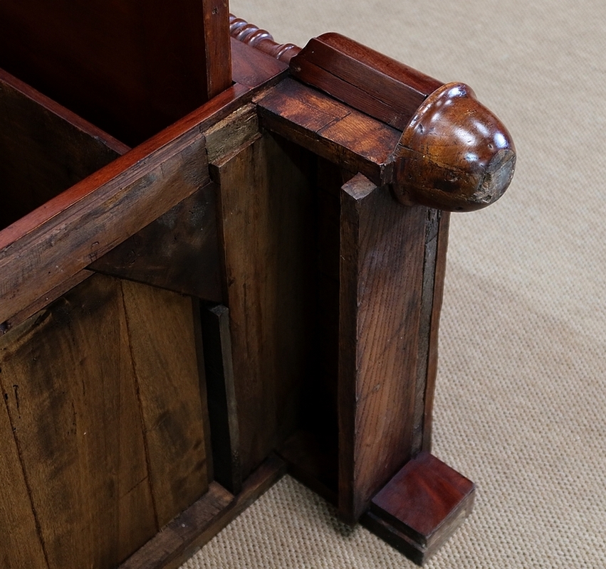 En dessous, dissimulée, nous avons une tablette en placage d’acajou de fil se tirant grâce à deux encoches avec butée.