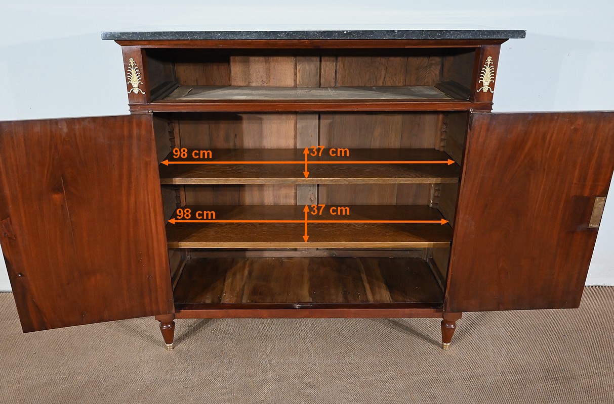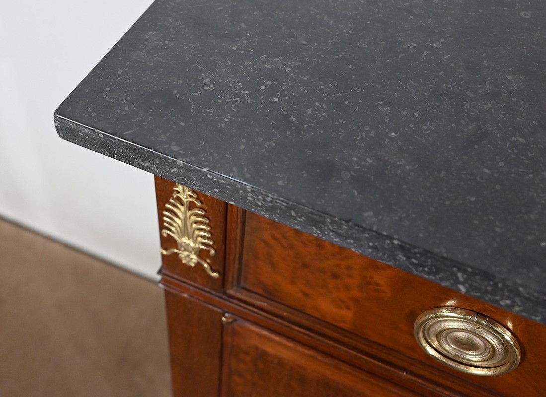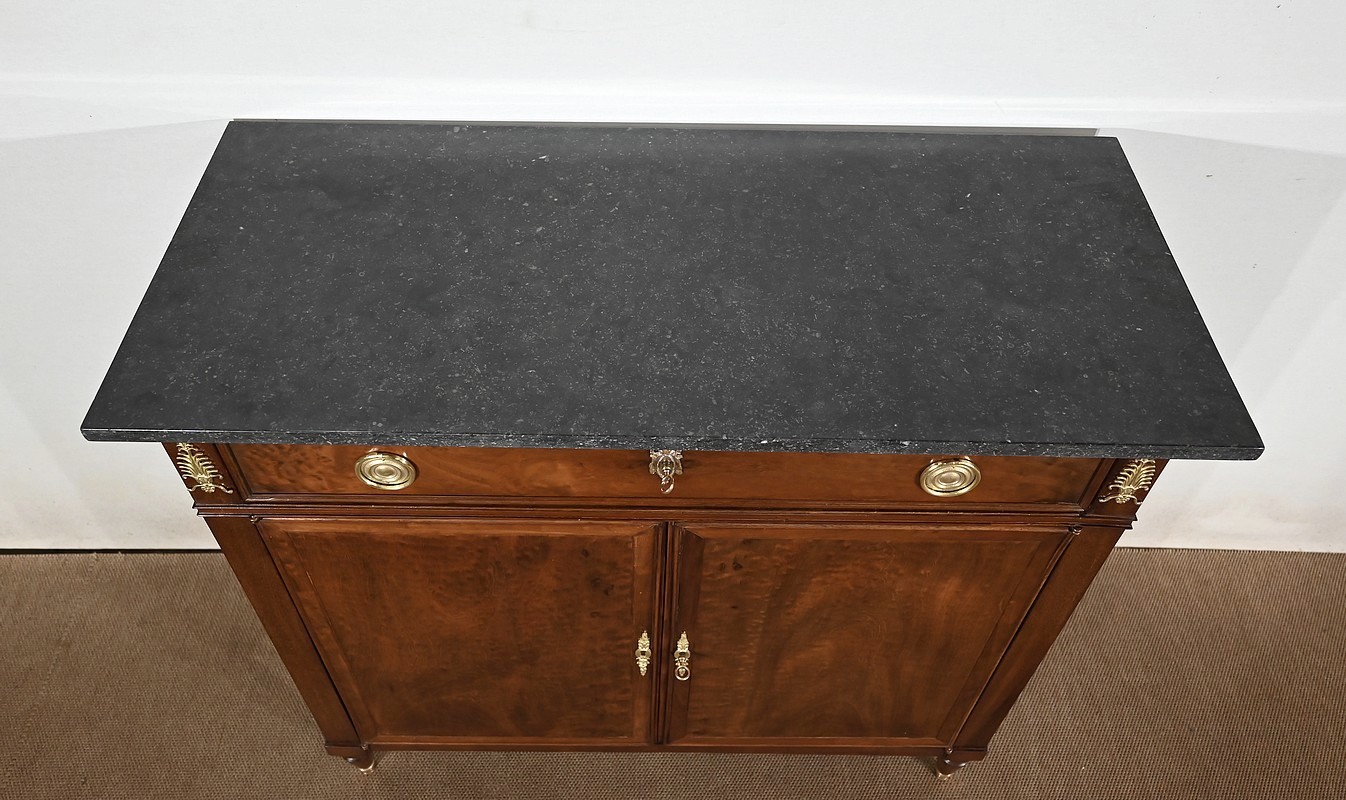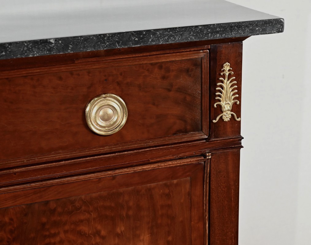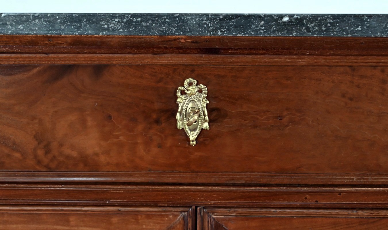 Ce magnifique buffet à la teinte profonde et chatoyante est sommé d’un marbre granité belge de couleur gris anthracite moucheté.