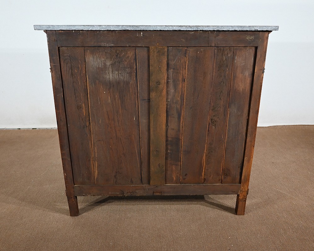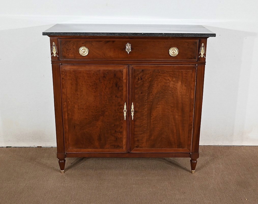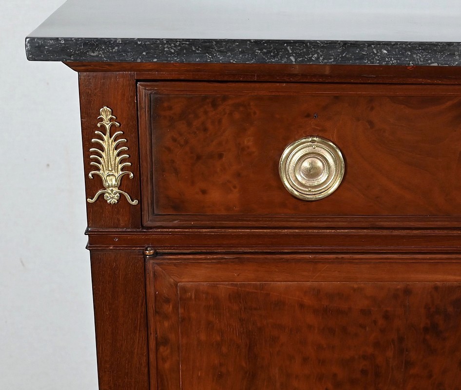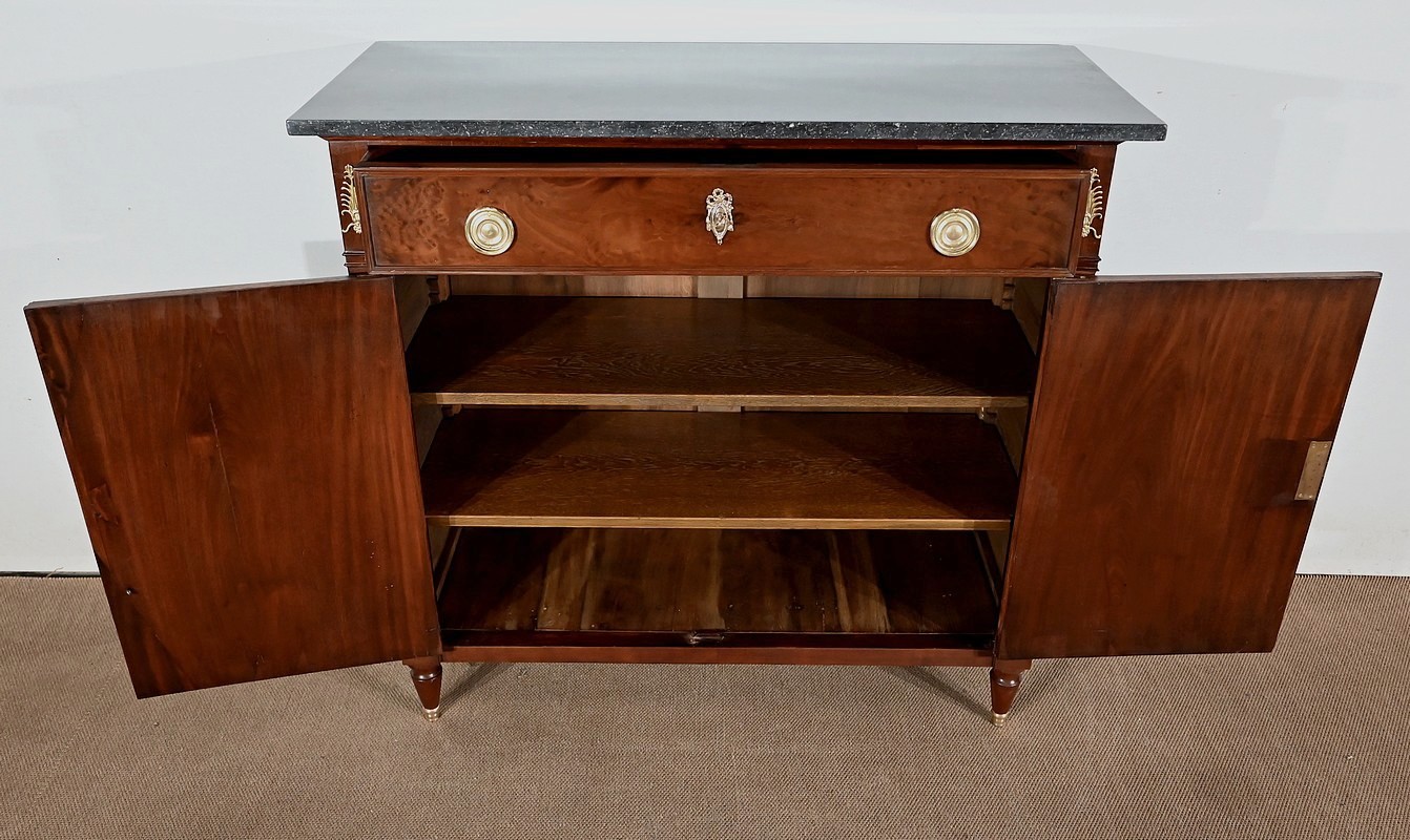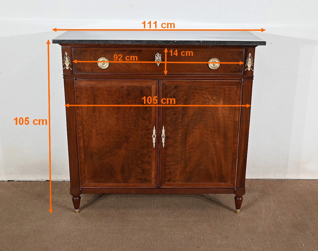 Ce magnifique buffet à la teinte profonde et chatoyante est sommé d’un marbre granité belge de couleur gris anthracite moucheté.
