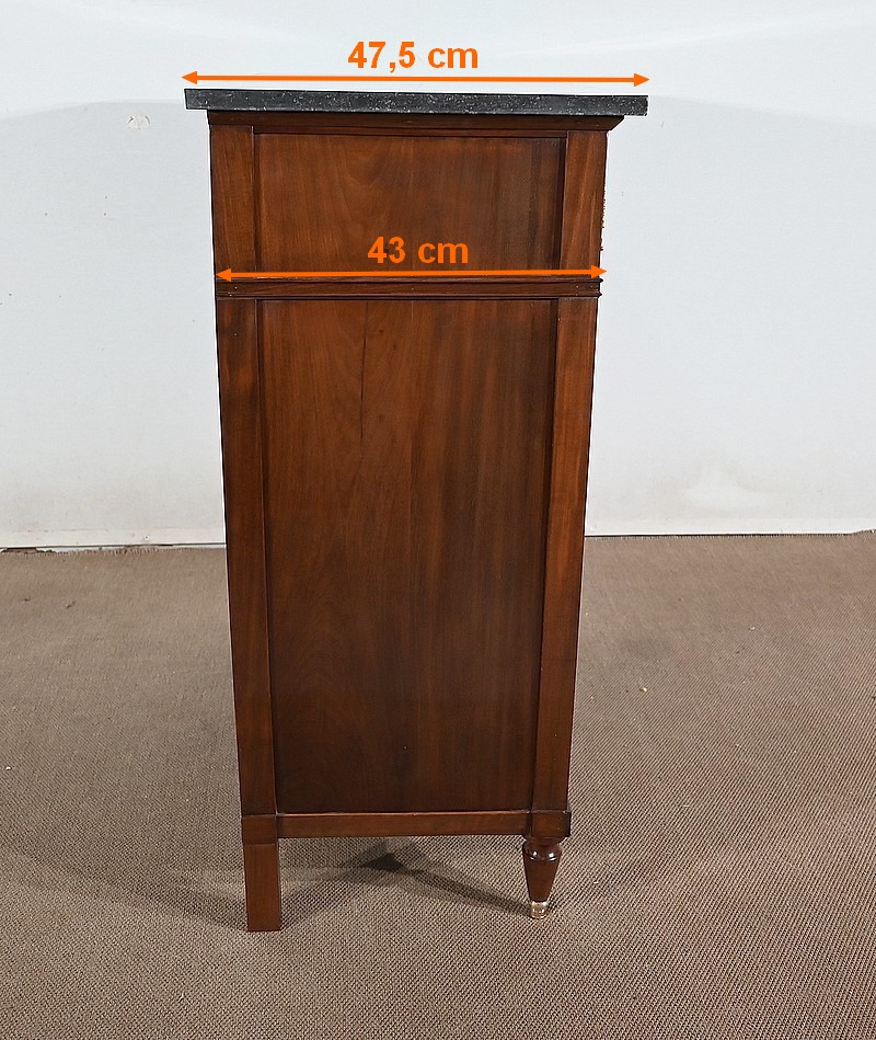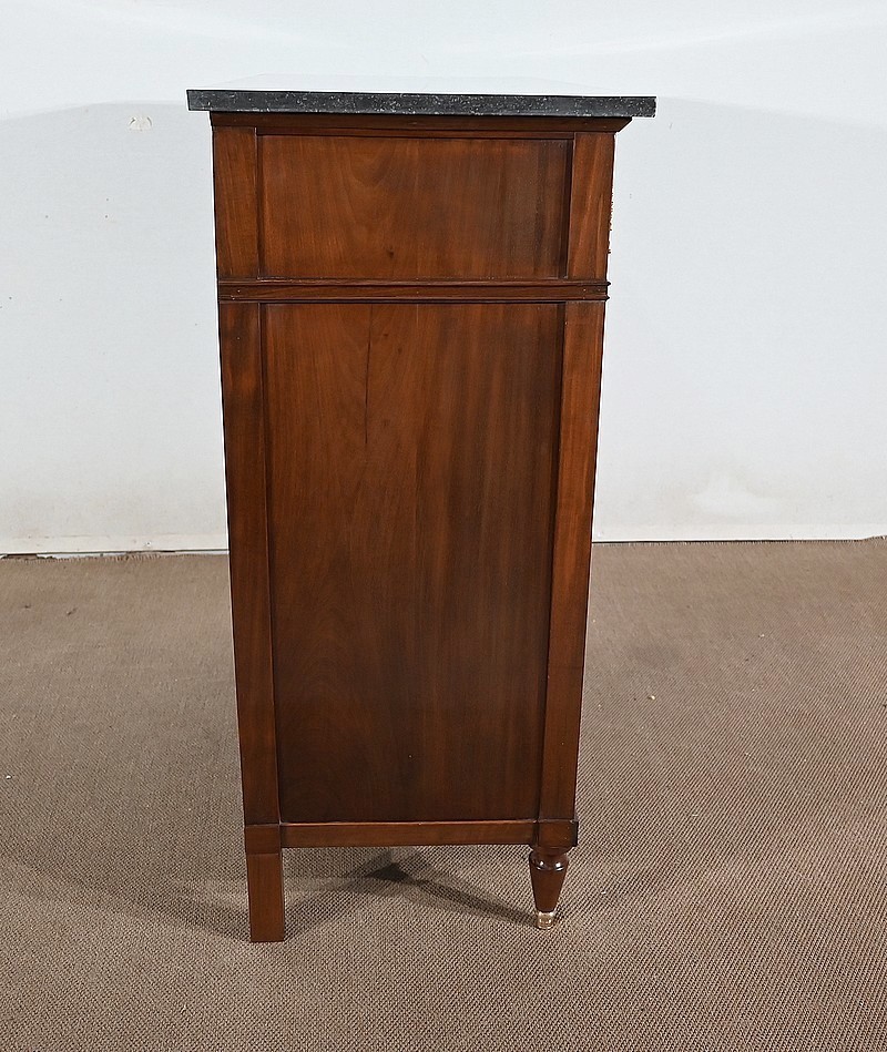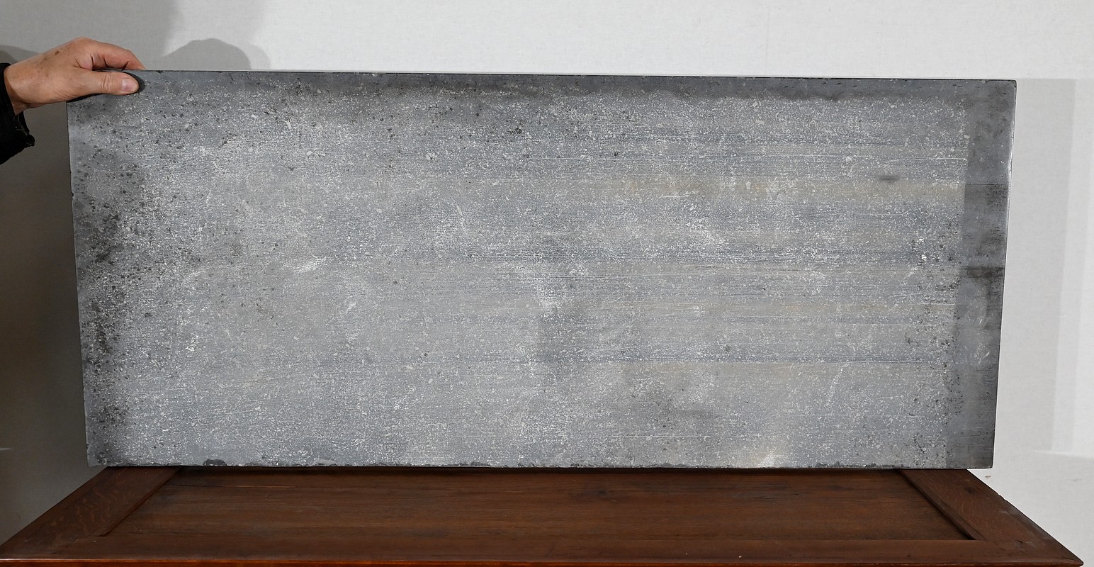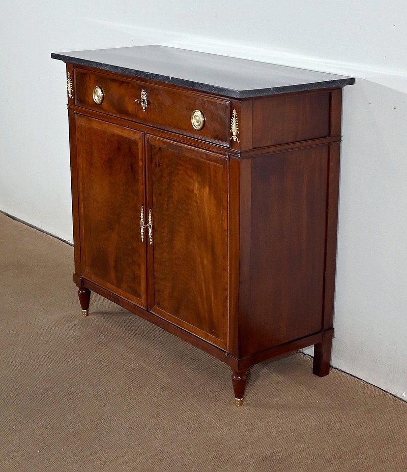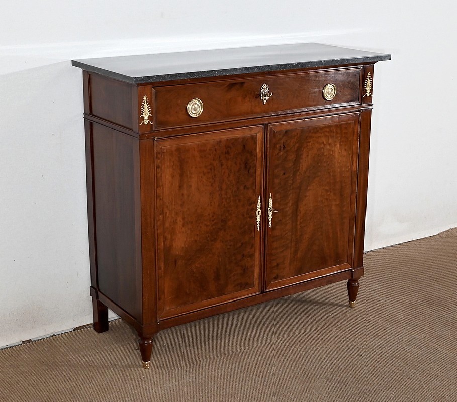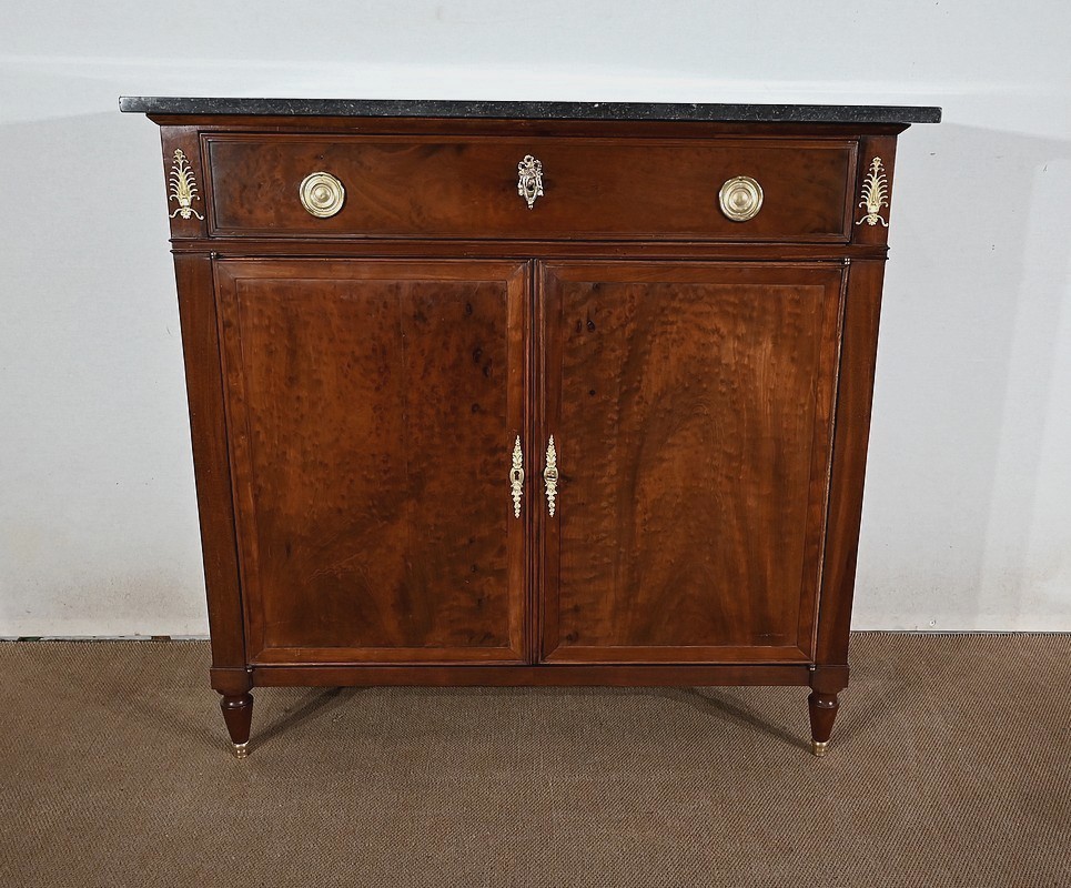Ce magnifique buffet à la teinte profonde et chatoyante est sommé d’un marbre granité belge de couleur gris anthracite moucheté.