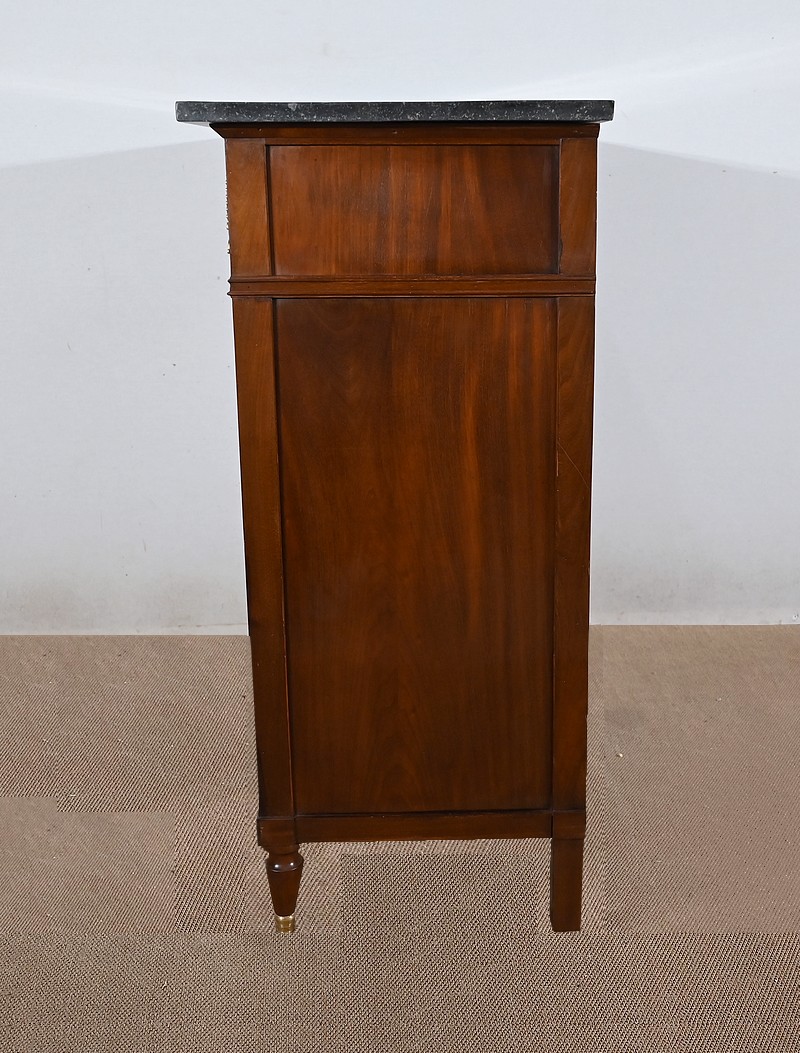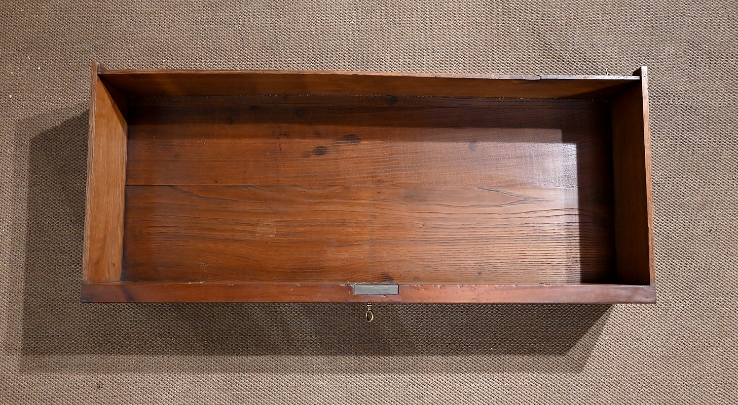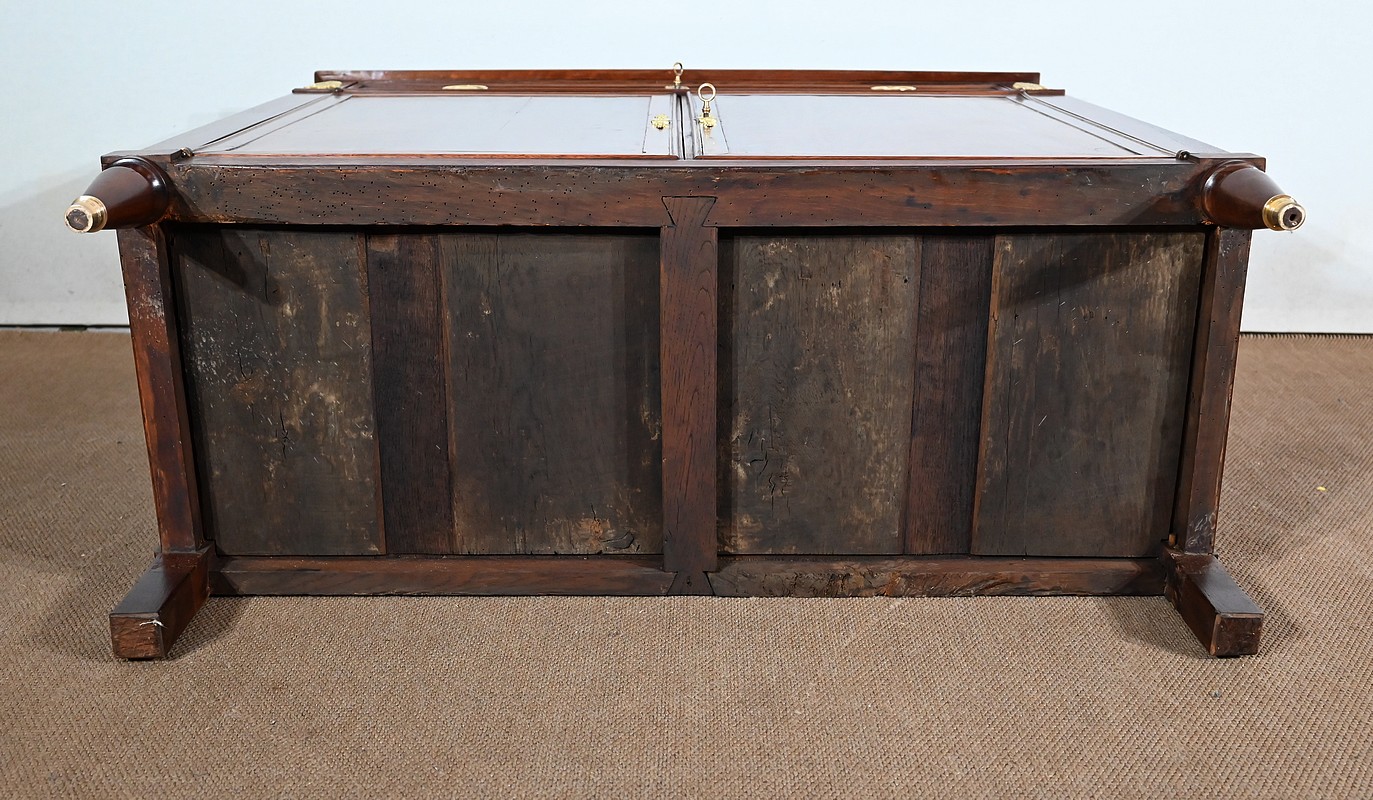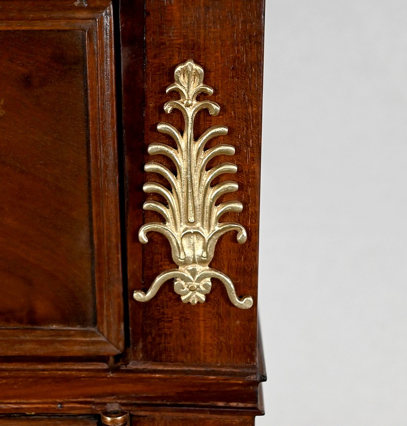 En ceinture, nous retrouvons un large tiroir équipé de deux anneaux de tirage en bronze avec macaron, et d’une entrée en bronze sommée d’un nœud Louis XVI. La serrure est d’origine, sa clé, en état de fonctionnement. Sa façade en acajou moiré est entourée d’une petite moulure en acajou.