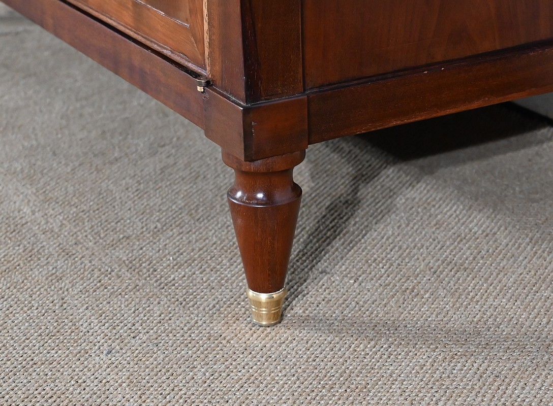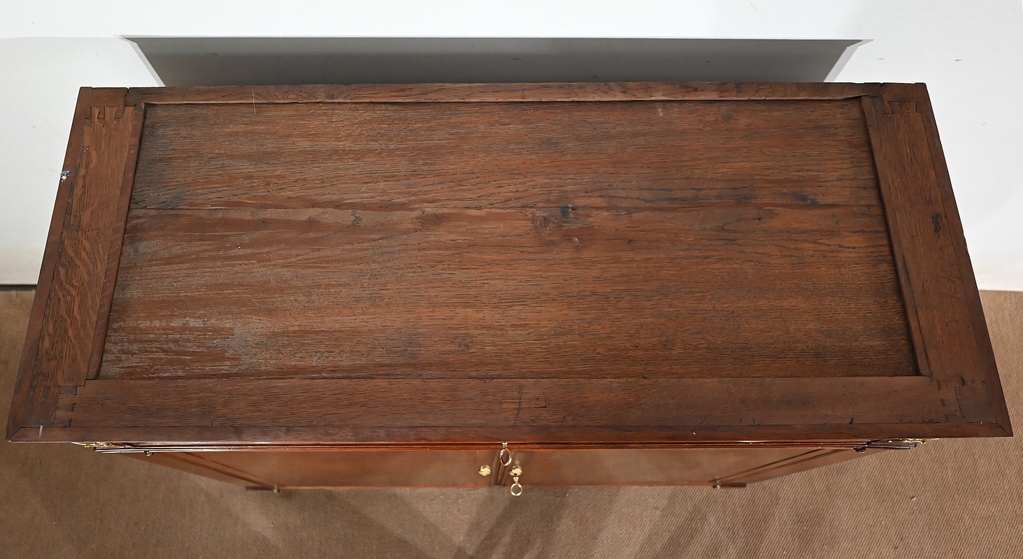 Ce Buffet Louis XVI en acajou et placage d’acajou comprend deux portes, habillées dans le pourtour d’acajou de fil à coupe d’onglet. Au centre, nous retrouvons un grand panneau en acajou moiré. Chaque porte s’ouvre sur pivot déporté en laiton et possède une entrée en bronze délicatement ciselée installée postérieurement. La serrure est d’origine avec sa clé en état de fonctionnement.