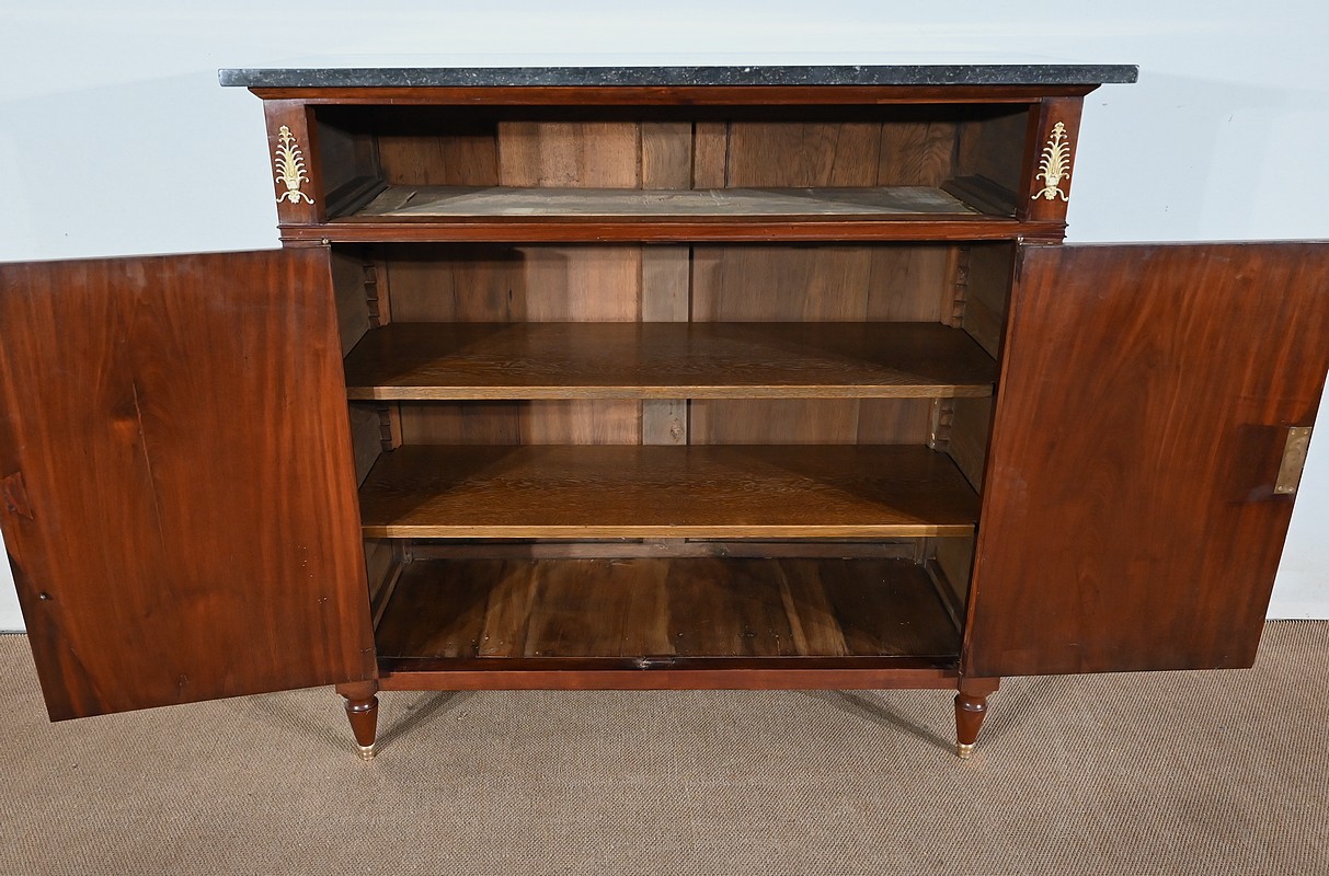 Les montants de ce buffet sont à angles vifs et décorés d’une palmette en bronze. Ils reposent sur des pieds tournés fuseau avec sabot laiton.