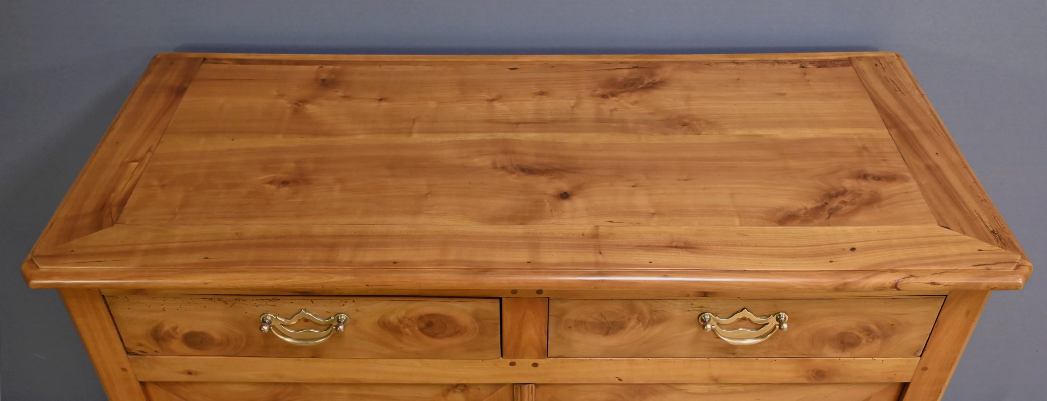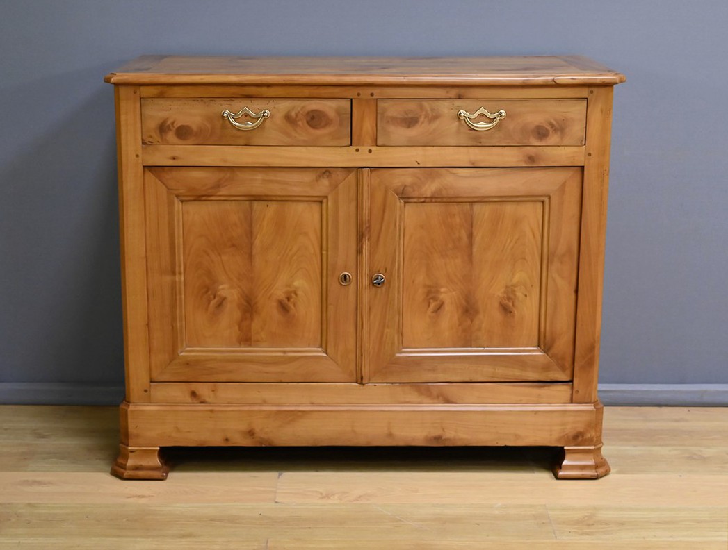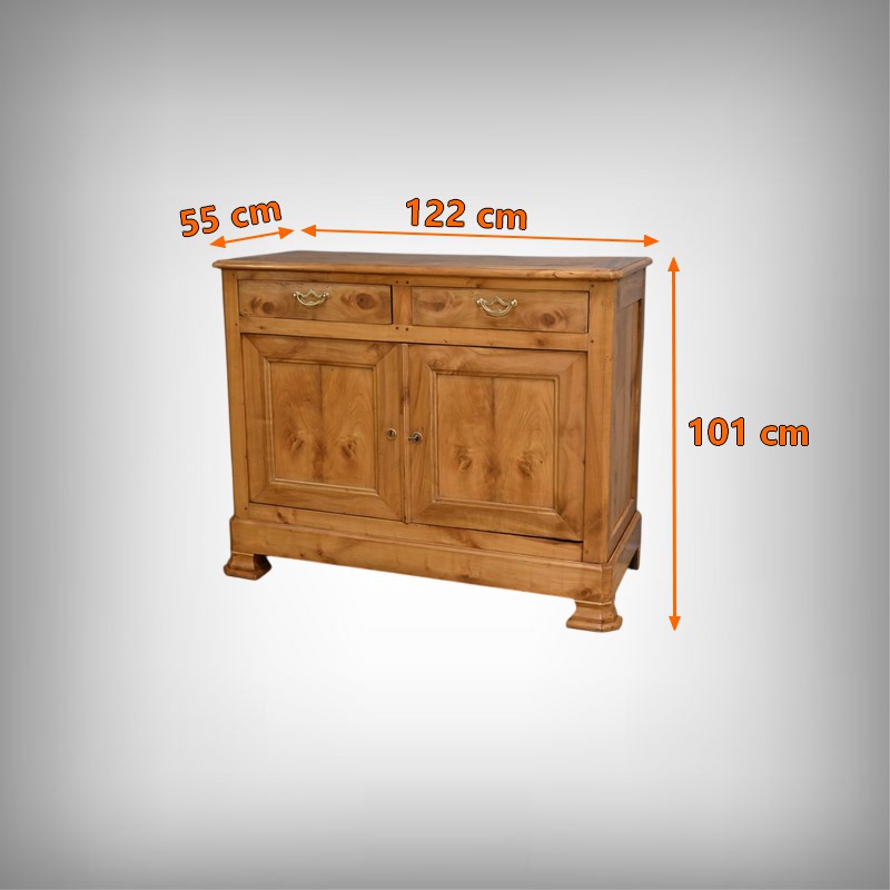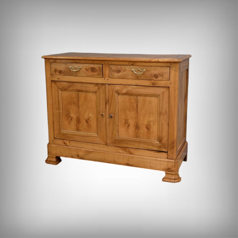 Buffet en merisier massif réalisé dans le style Louis-Philippe. Son plateau présente des angles antérieurs à pans coupés et un entourage en bec de corbin. Ce meuble est doté de deux tiroirs en ceinture, équipés de poignées tombantes en laiton. Sous les tiroirs, deux portes encadrées de moulures s’ouvrent sur un espace de rangement doté d’une étagère. La porte de droite est équipée d’une serrure en état de fonctionnement, également fournie avec sa clé. Le bas du buffet est souligné par une plinthe et l’ensemble repose sur des pieds moulurés à l’avant et droits à l’arrière.