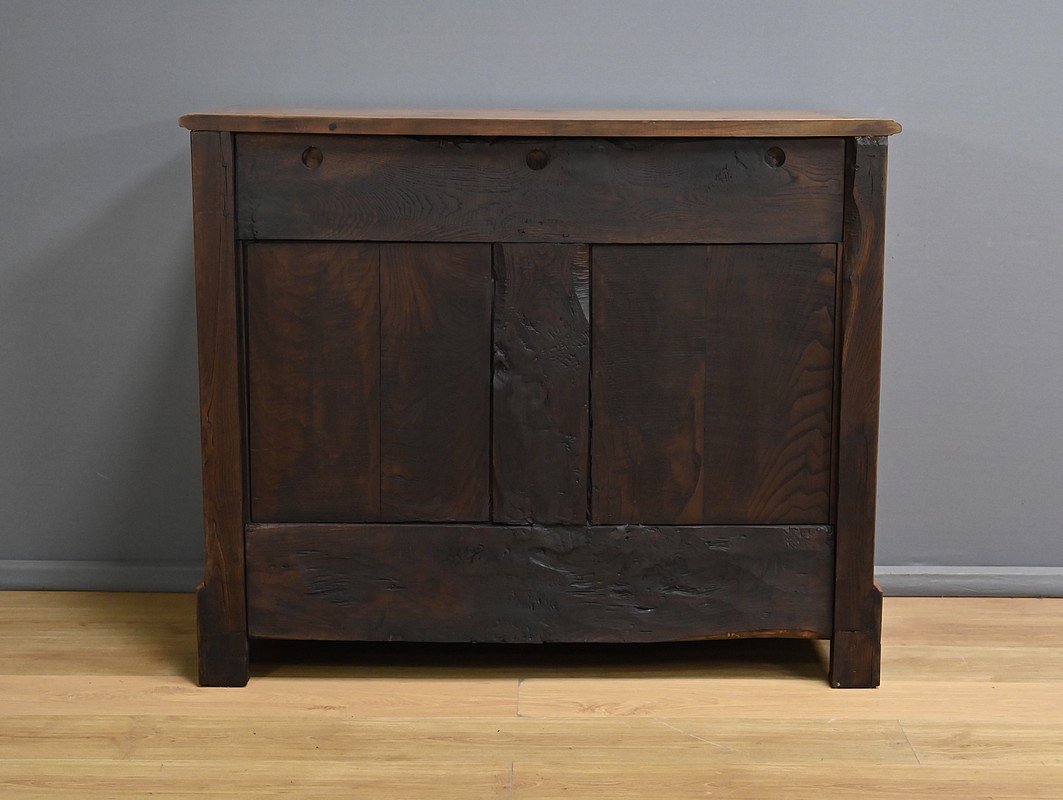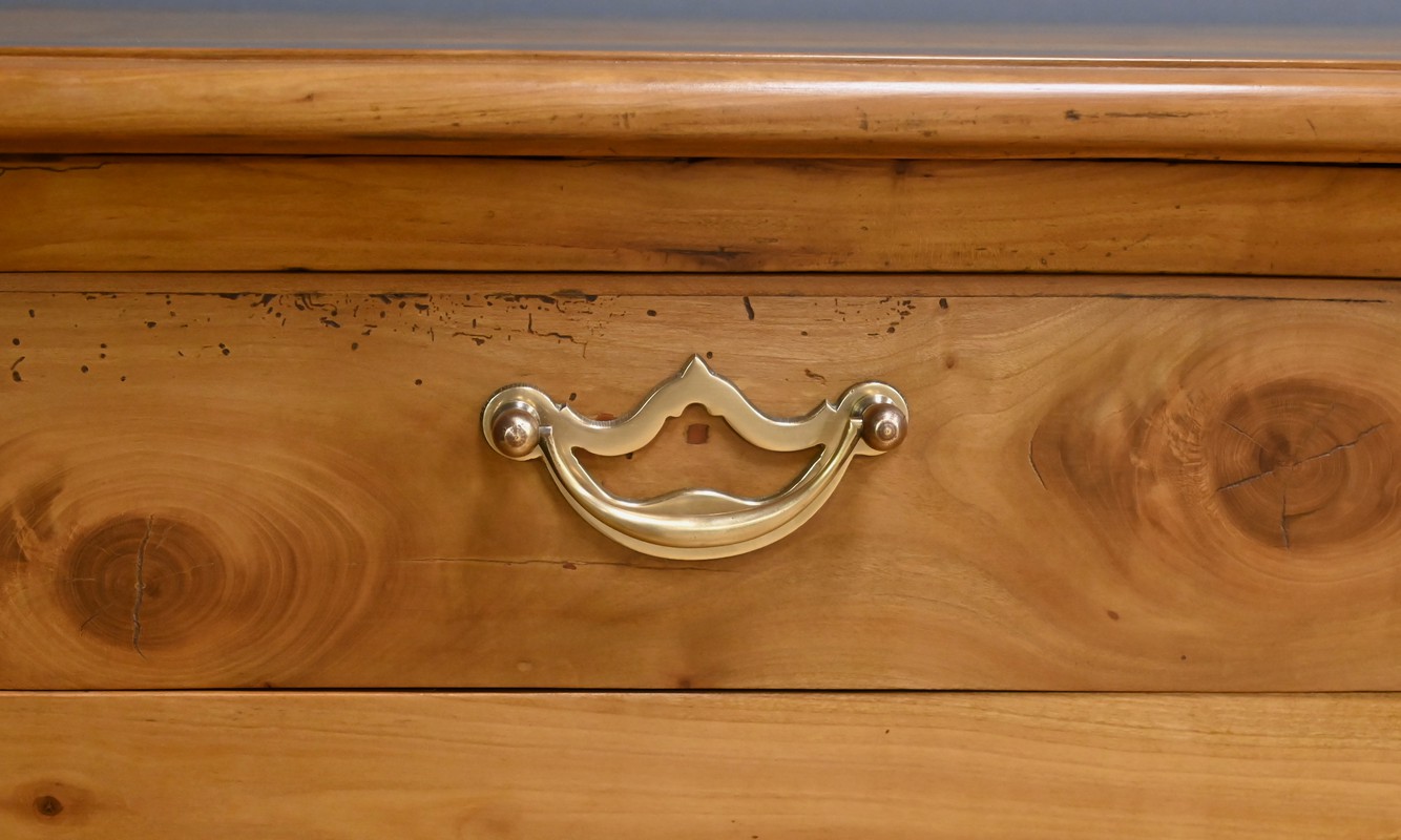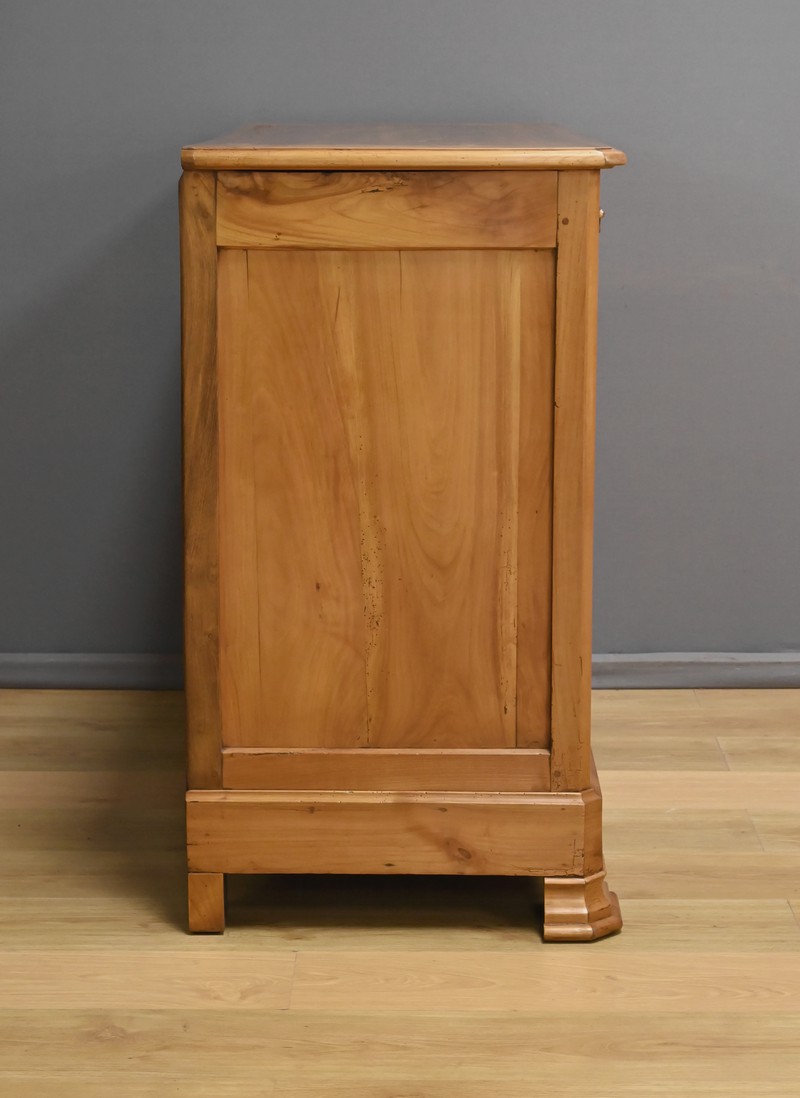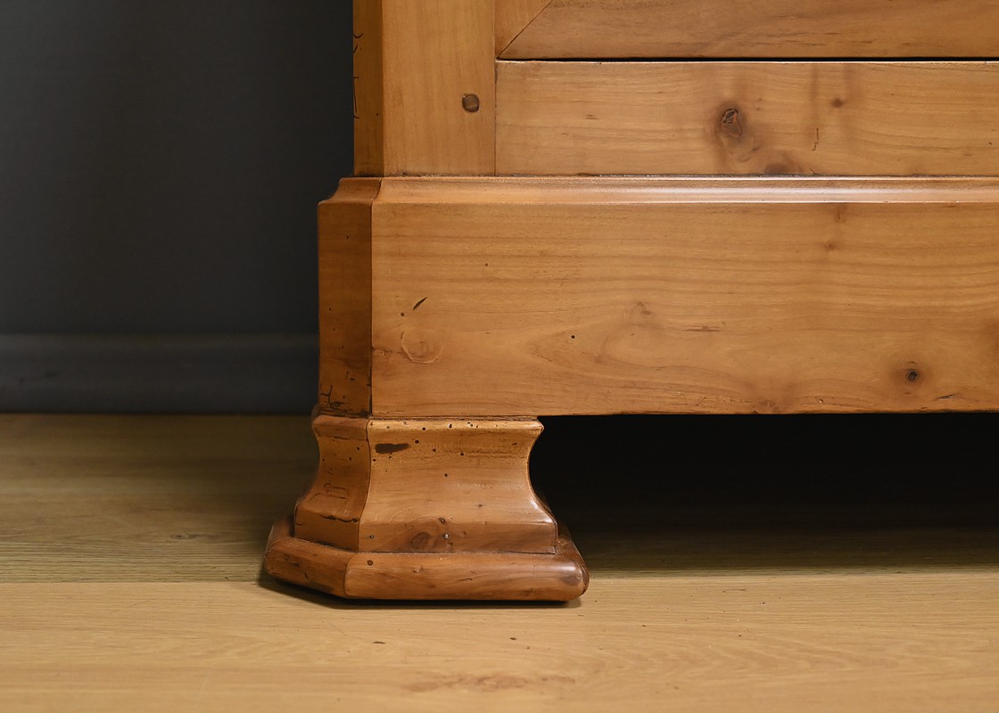 Buffet en merisier massif réalisé dans le style Louis-Philippe. Son plateau présente des angles antérieurs à pans coupés et un entourage en bec de corbin. Ce meuble est doté de deux tiroirs en ceinture, équipés de poignées tombantes en laiton. Sous les tiroirs, deux portes encadrées de moulures s’ouvrent sur un espace de rangement doté d’une étagère. La porte de droite est équipée d’une serrure en état de fonctionnement, également fournie avec sa clé. Le bas du buffet est souligné par une plinthe et l’ensemble repose sur des pieds moulurés à l’avant et droits à l’arrière.