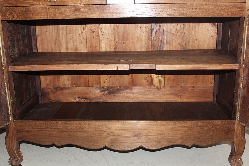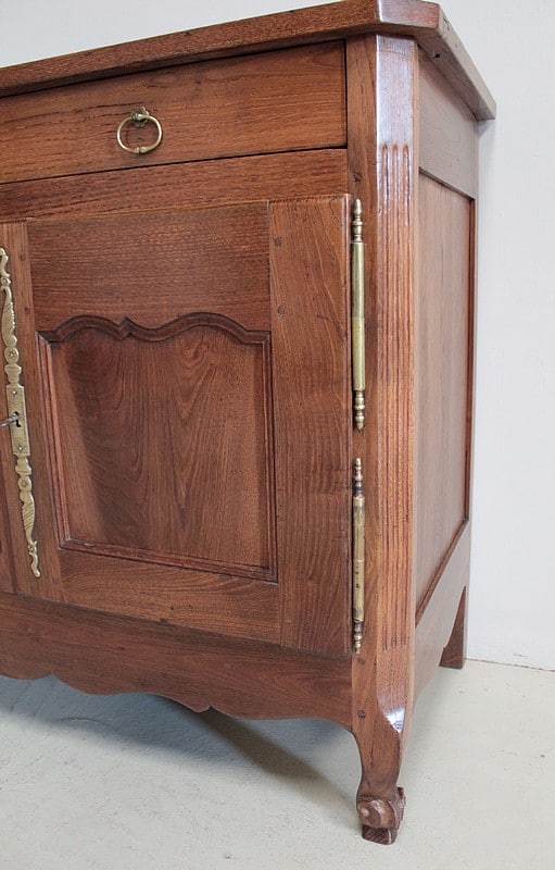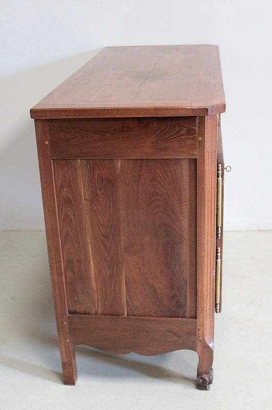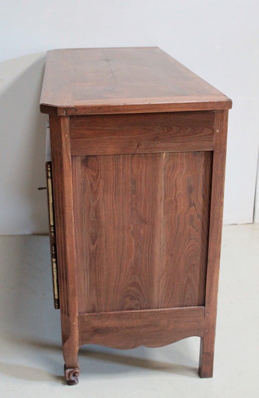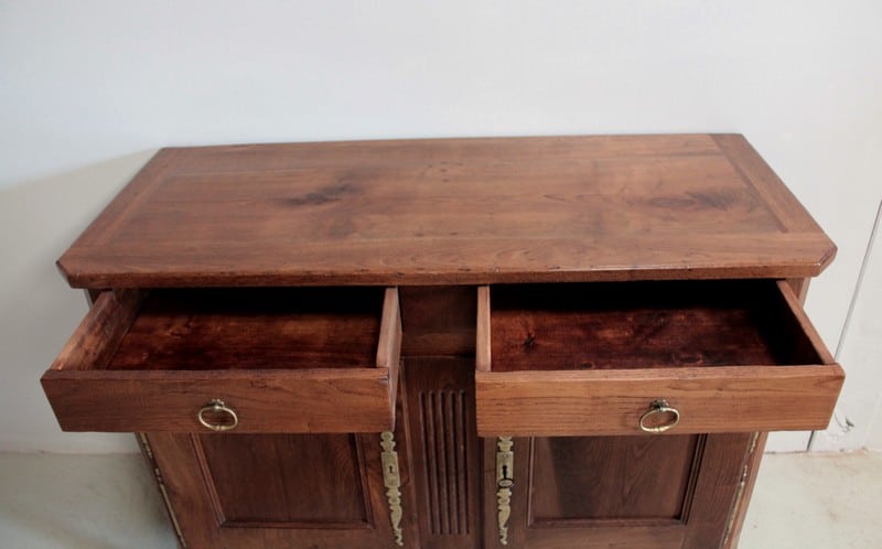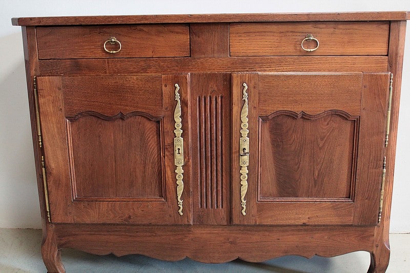Buffet bas de style Louis XV en châtaignier ouvrant par 2 portes à découpe et 2 tiroirs avec anneaux de tirage en cuivre.