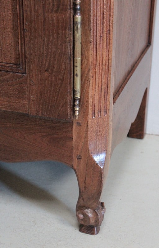 La traverse est chantournée et il repose sur des pieds antérieurs à enroulement et des pieds arrières droits.