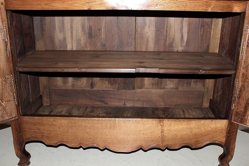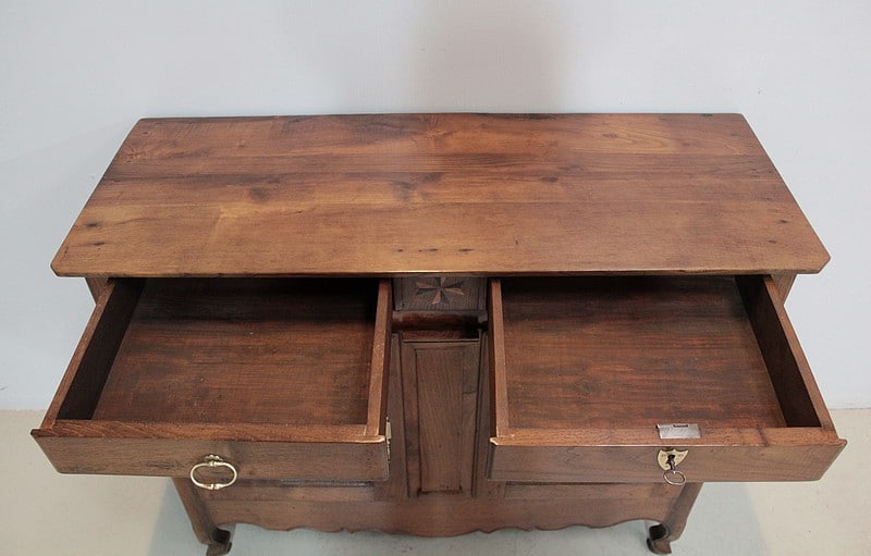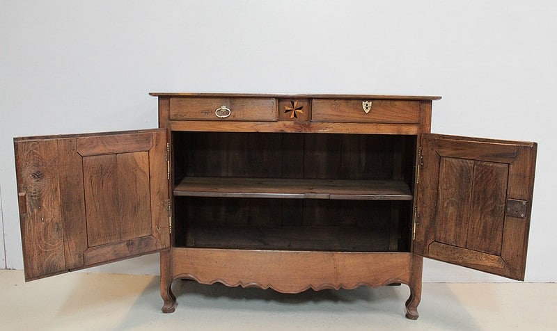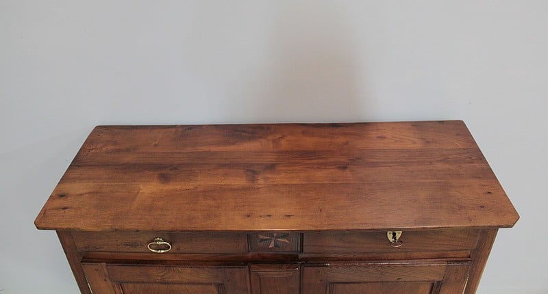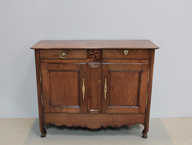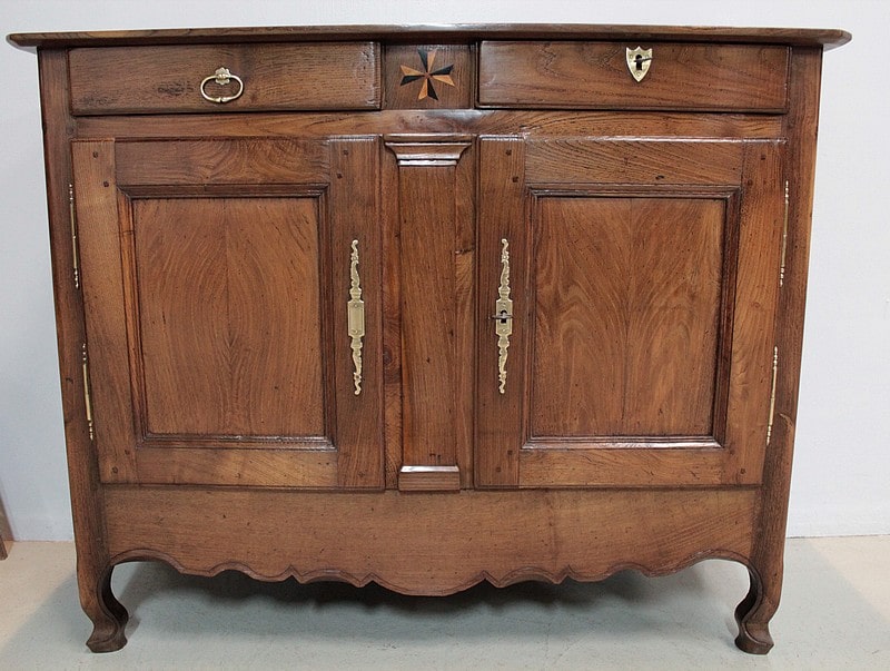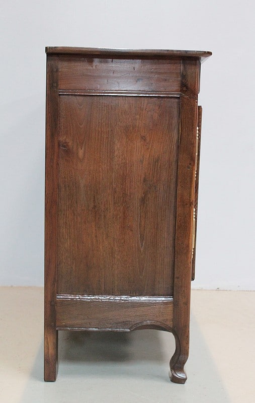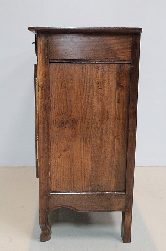Buffet de style Louis XV en chêne doré ouvrant par 2 portes à découpe droite et 2 tiroirs dans la ceinture, l’un garni d’une poignée de tirage en cuivre, l’autre d’une serrure et d’une clé (en état de fonctionnement).