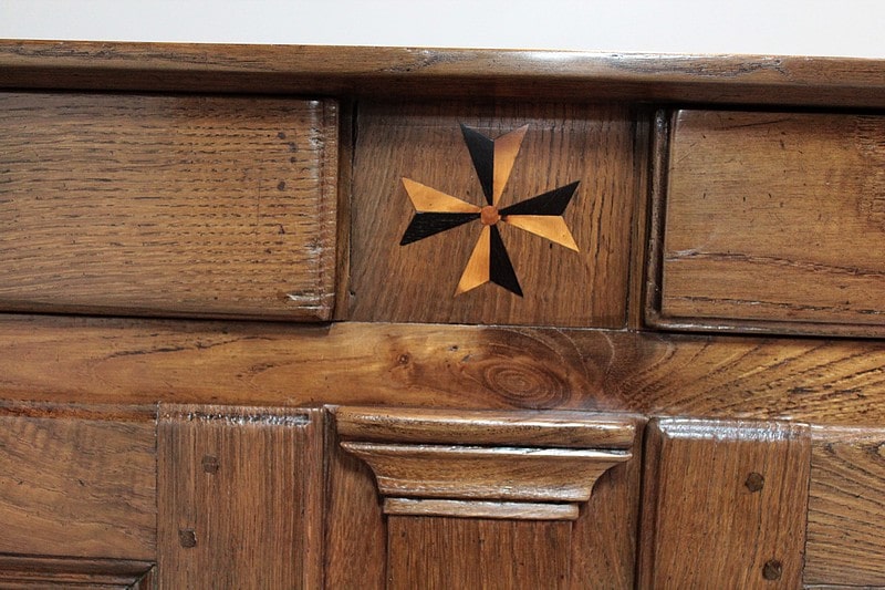 Entre les tiroirs, une croix de Malte en marqueterie d’ ébène et bois clair.