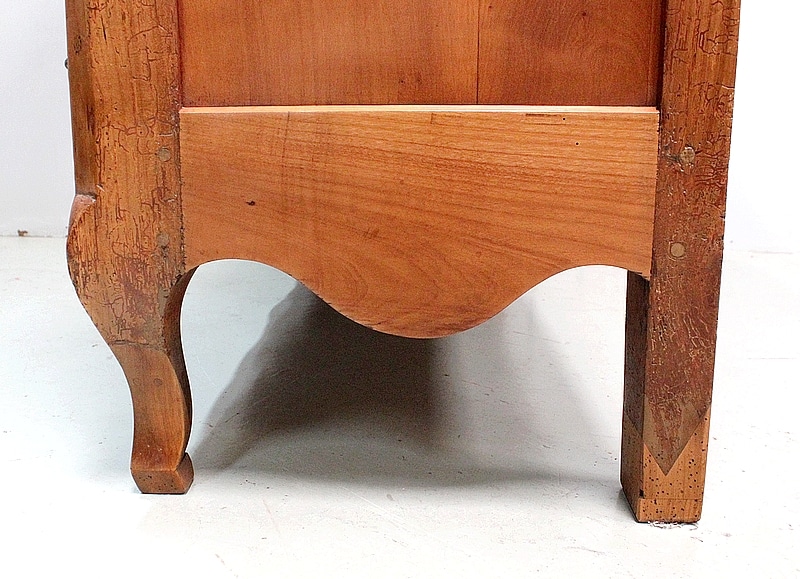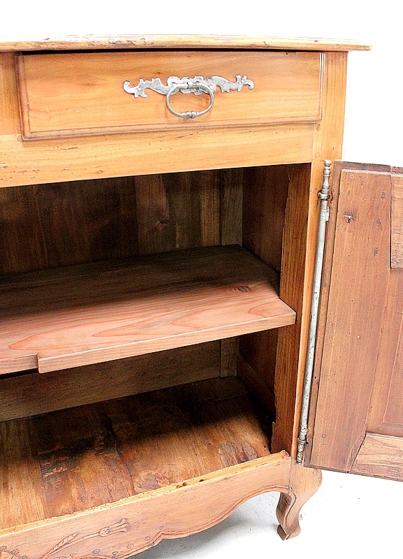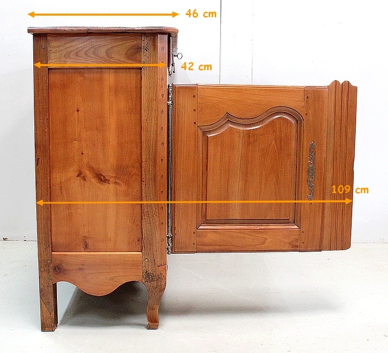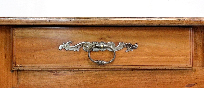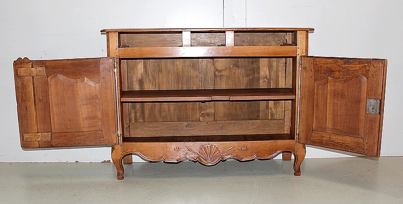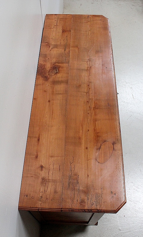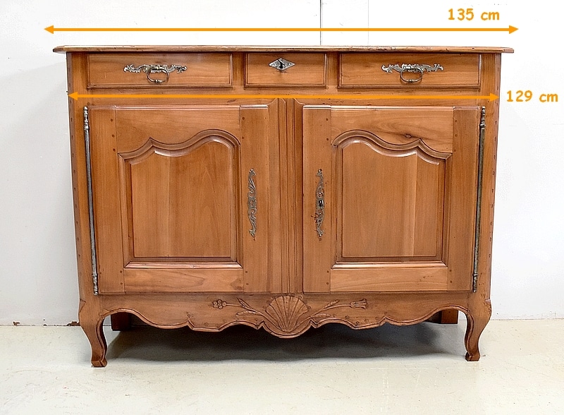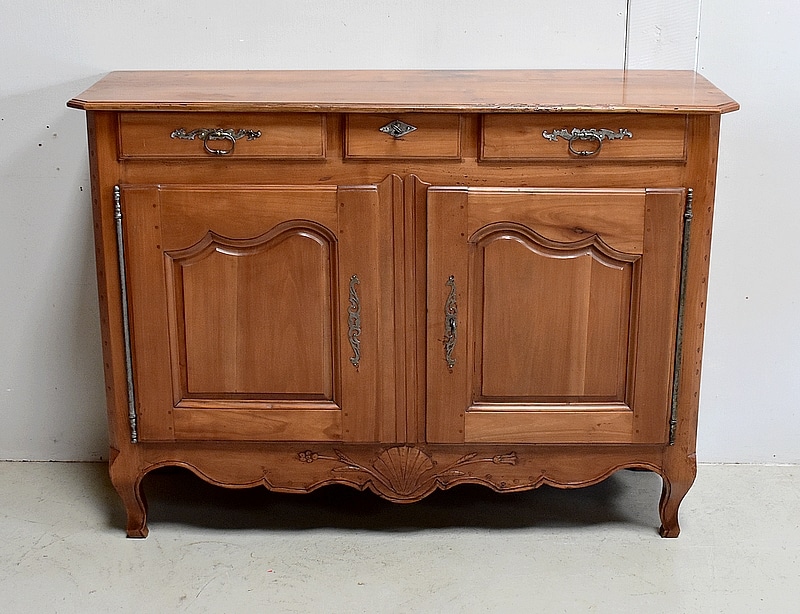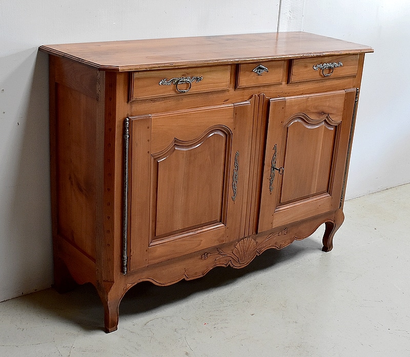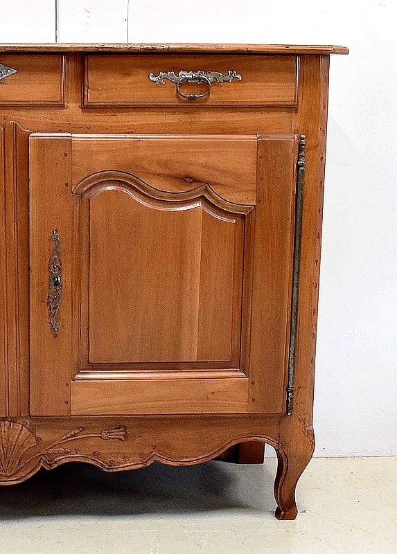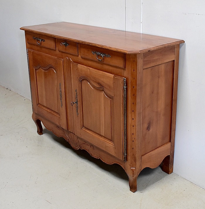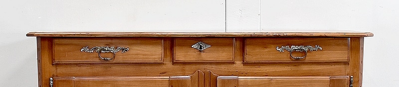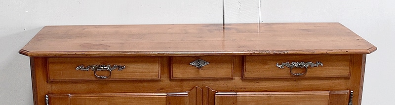 Charmant Buffet Louis XV en Merisier massif, avec Dessus Bois finement Mouluré dans son Pourtour et aux Angles avant Coupés.