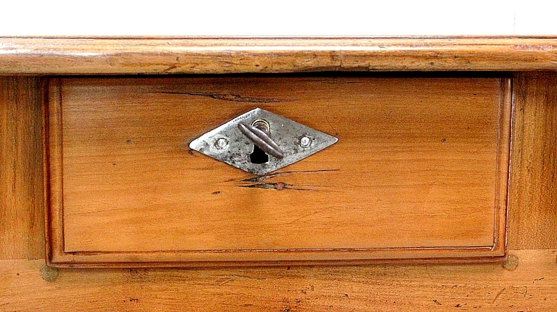 En ceinture, il offre trois tiroirs aux façades Discrètement Moulurées, d’une profondeur identique de 7.5 cm. Celui du centre, plus étroit que ses attenants, se verrouille. Ceux de droite et de gauche sont dotés de Poignées de tirage en Fer.
