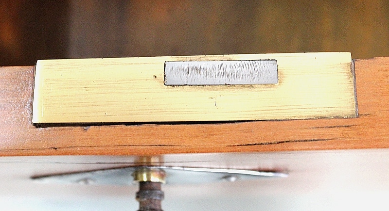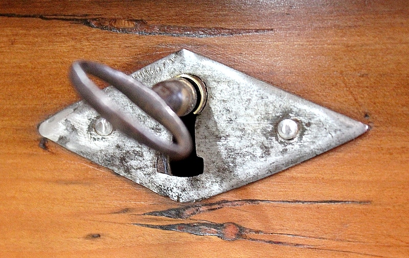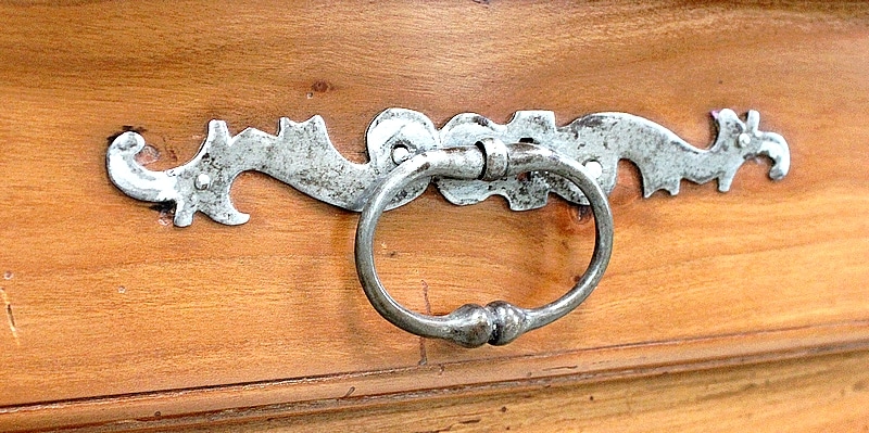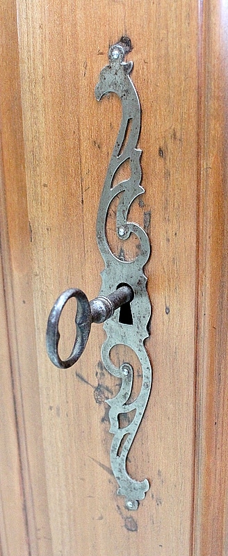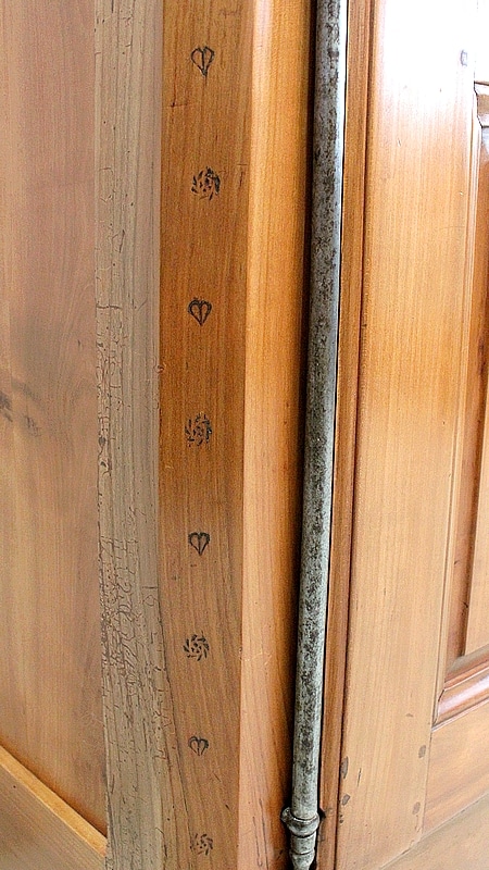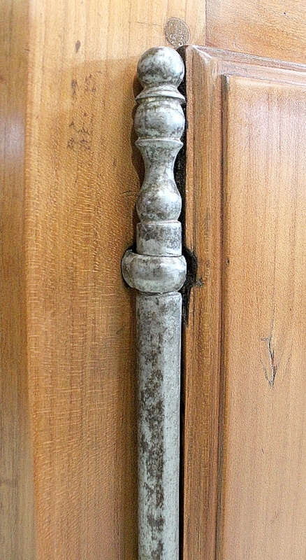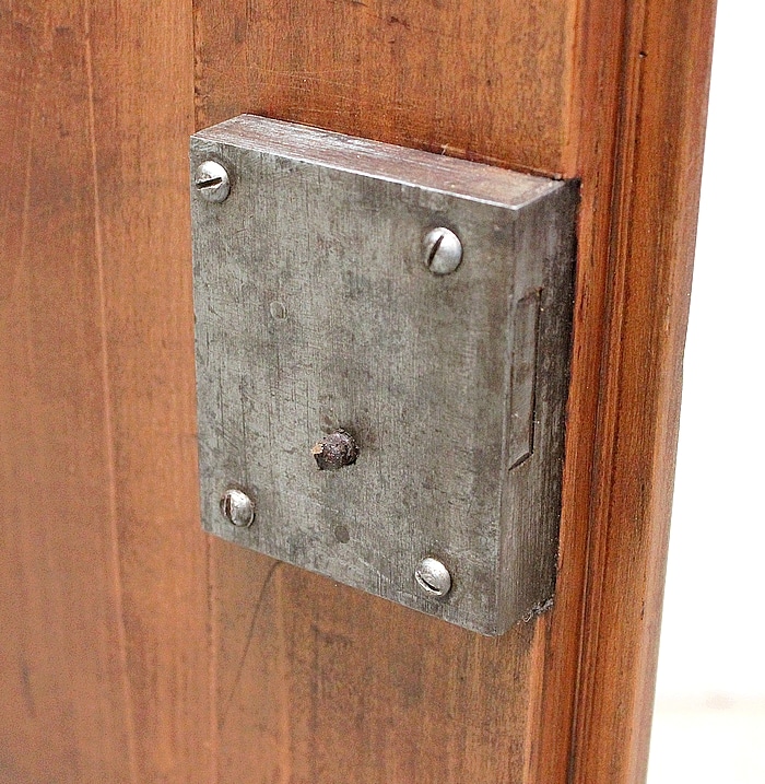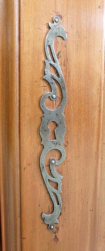 Chaque Vantail est fixé sur une longue Fiche, et est garni d’une Entrée de serrure Découpée. Celle de gauche est factice tandis que celle de droite est en état de fonctionnement.