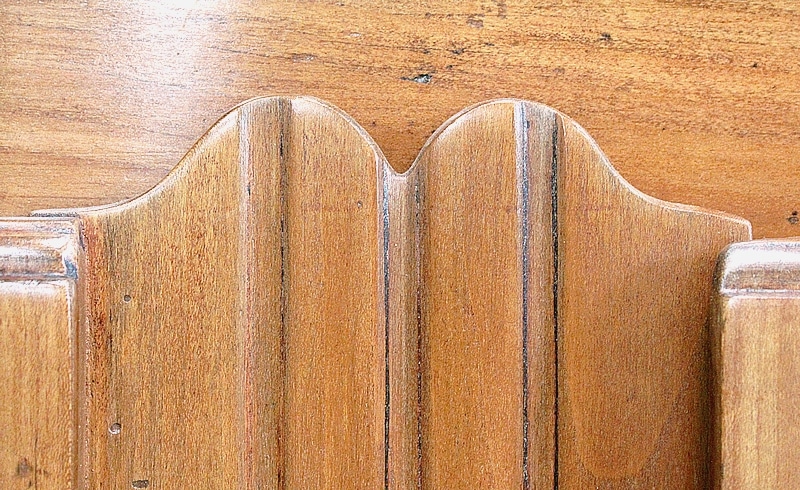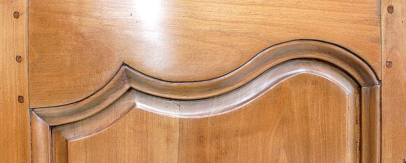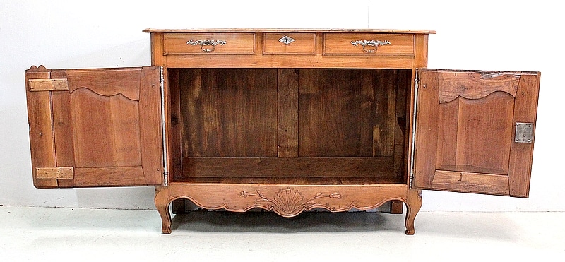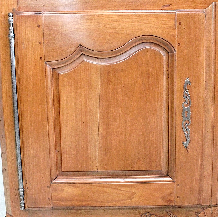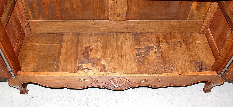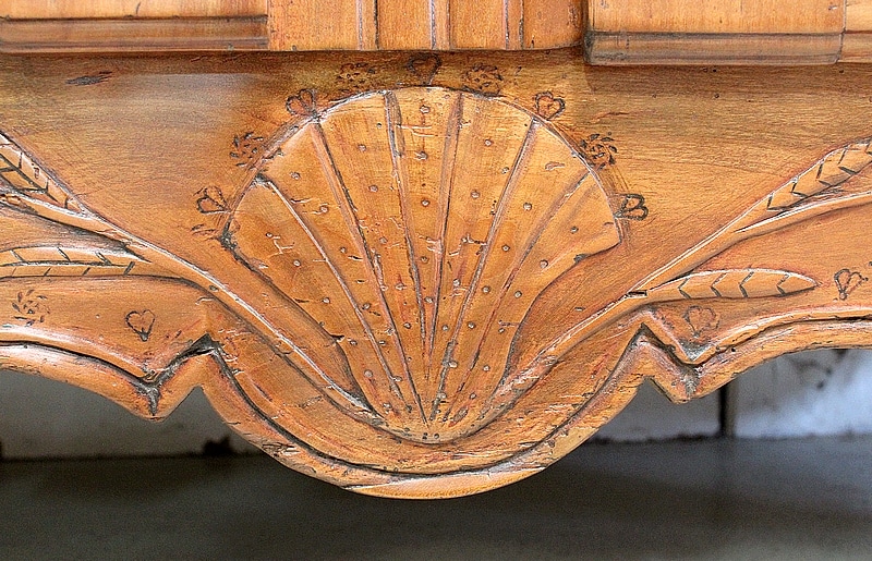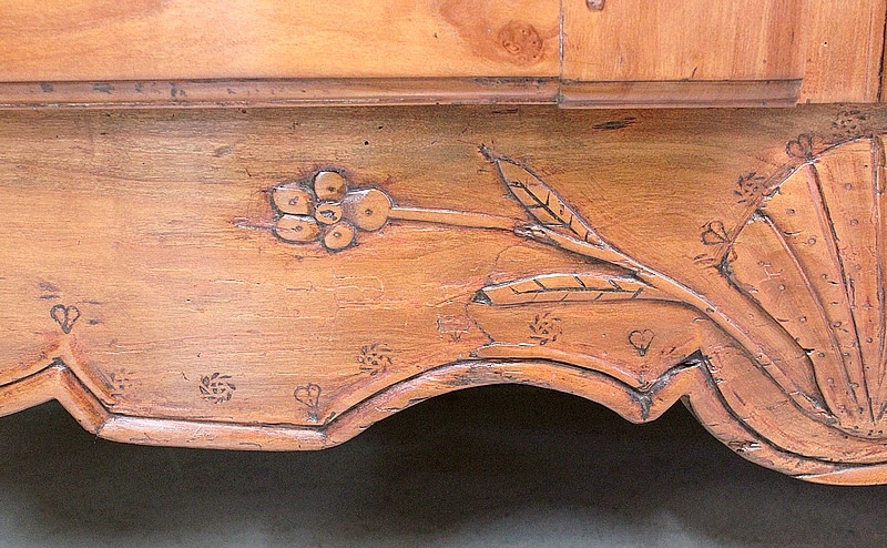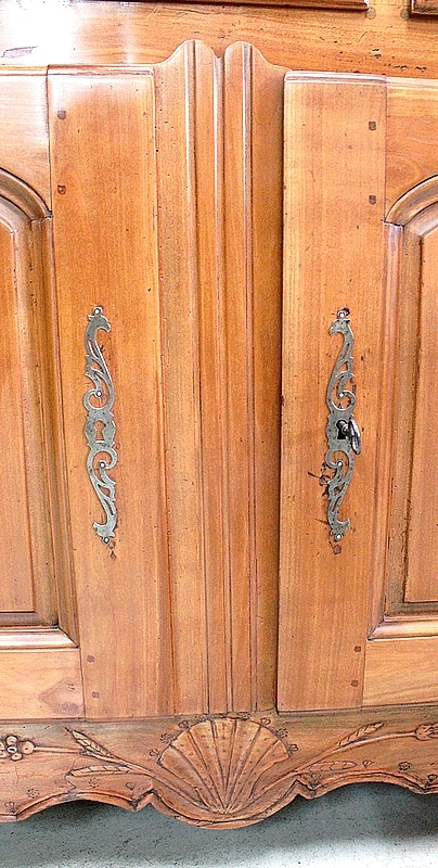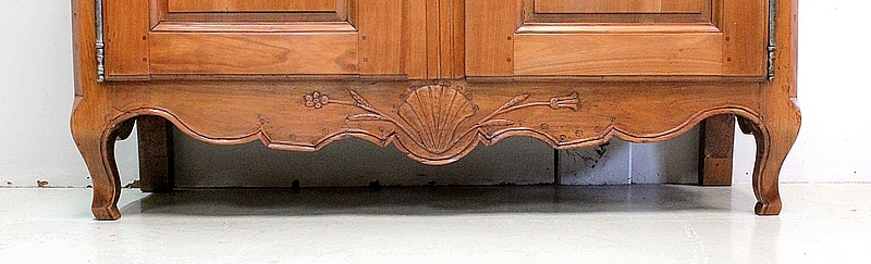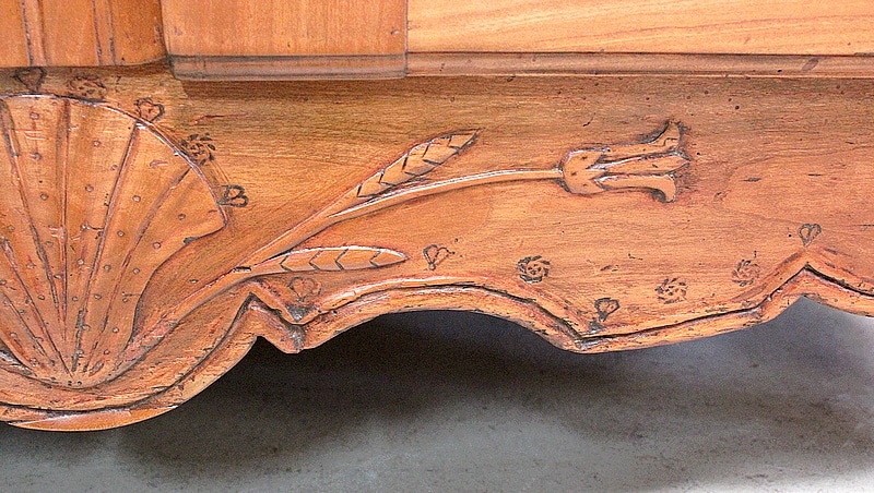 La Traverse basse est Mouvementée et Sculptée d’une Coquille St-Jacques, de Fleurs et d’Épis de blé. On notera que les gravures décrites dans les Montants sont reproduites dans la partie Inférieure de ce Meuble.