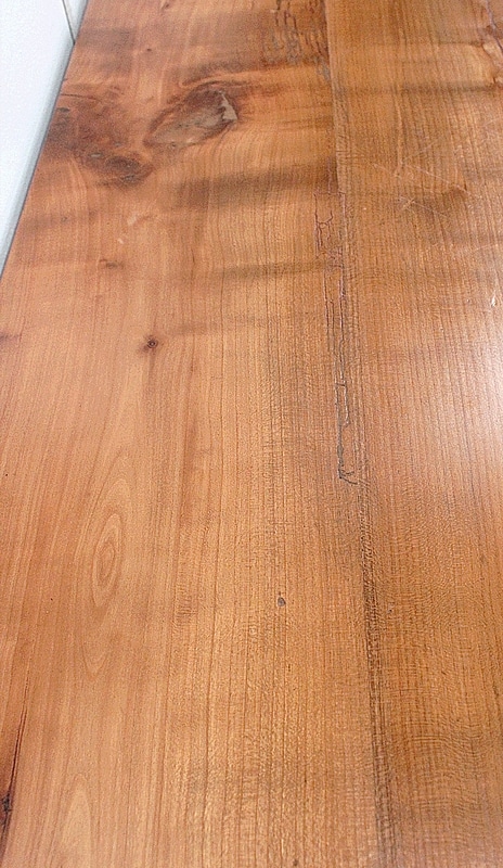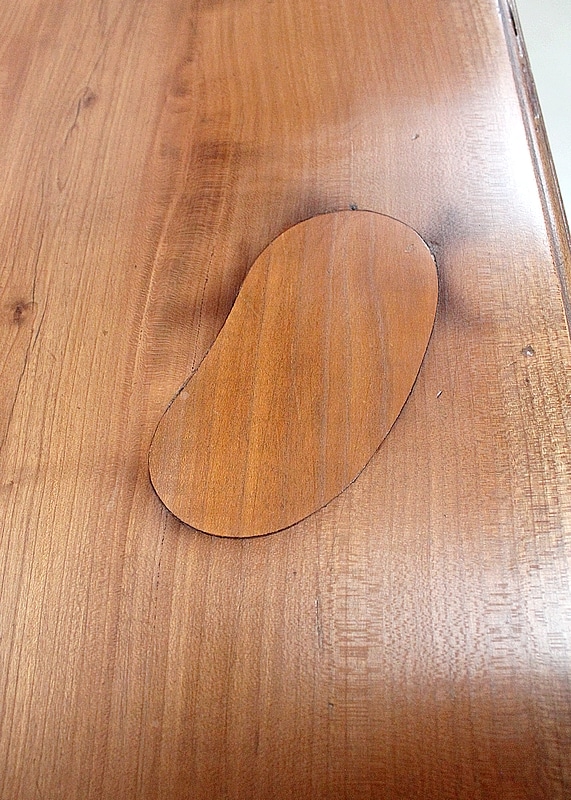 On précisera que le Plateau s’ajuste de deux planches et que sa partie gauche a nécessité une réparation, pratiquée avec soin, d’où l’ajout d’une pièce de Bois à cet endroit.