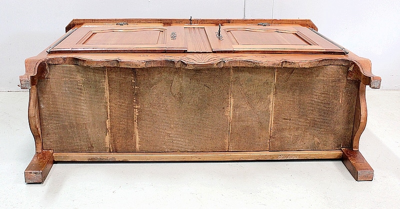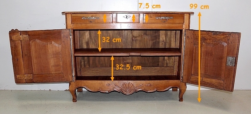 En dessous, ce Meuble ouvre par deux portes. Chacune d’elle est constituée d’un panneau central à Plates Bandes, et d’un encadrement Chantourné en partie haute.