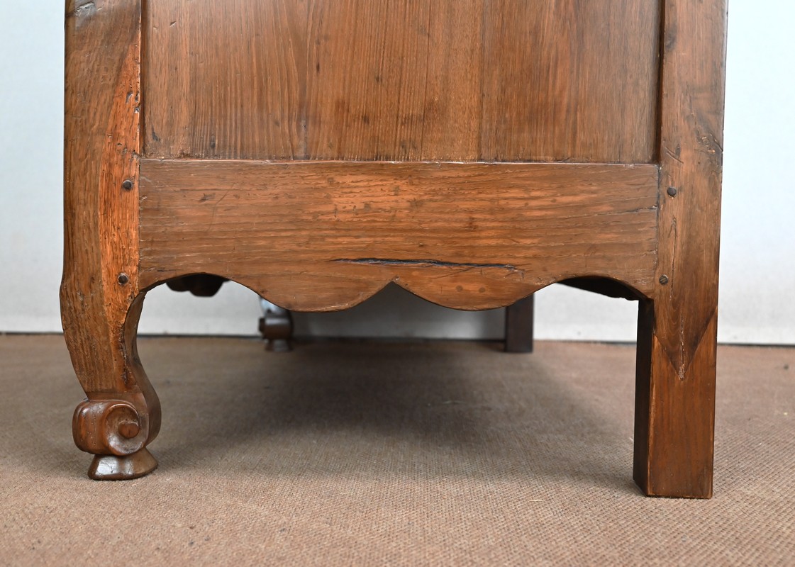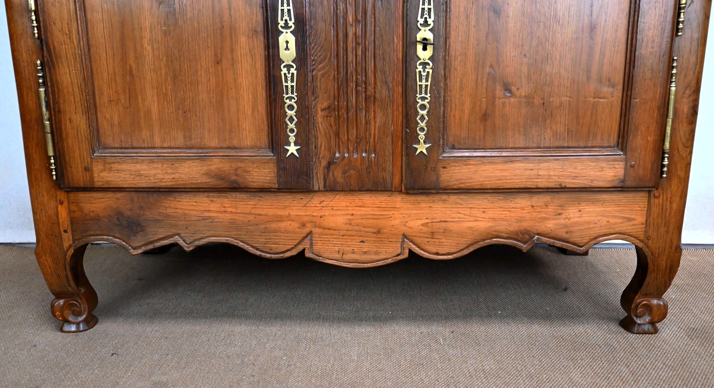 En dessous, ses deux portes à traverse haute sont mouvementées et à encadrement intérieur mouluré.