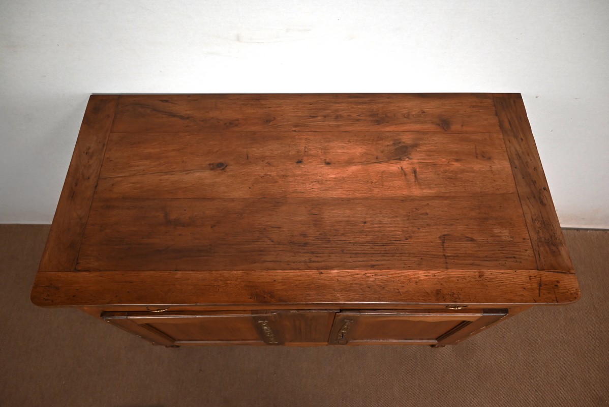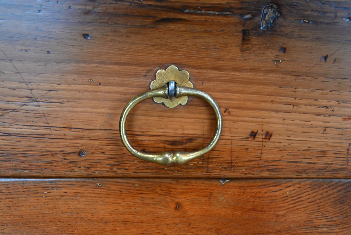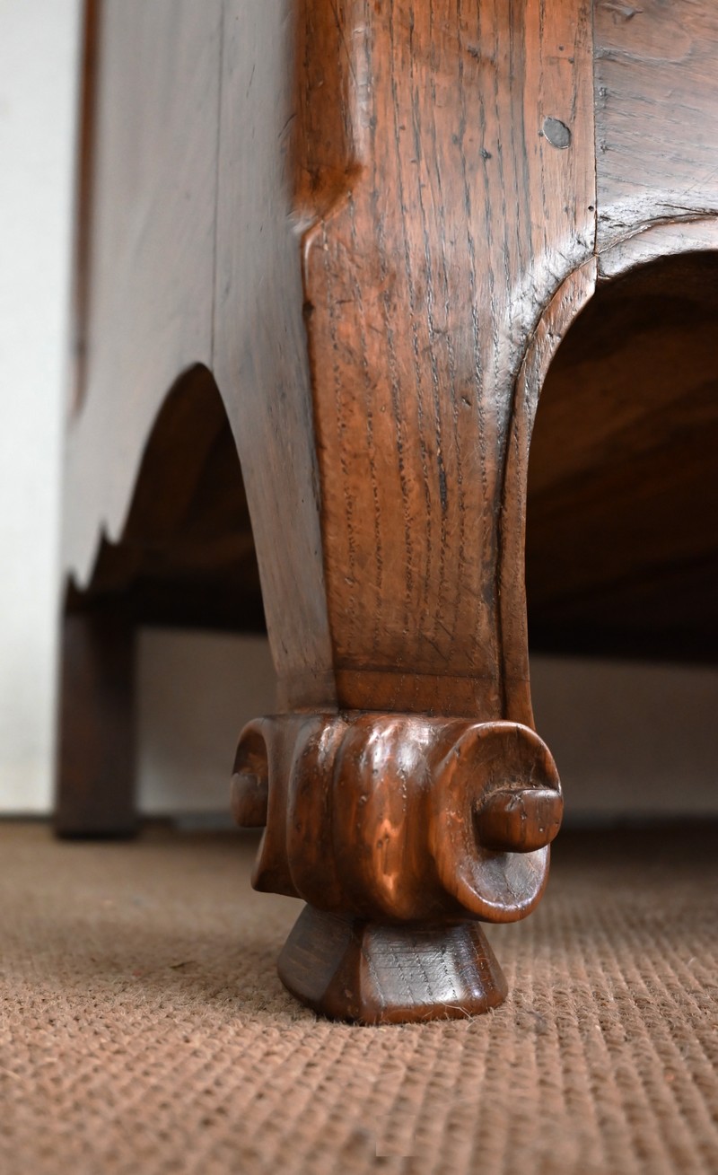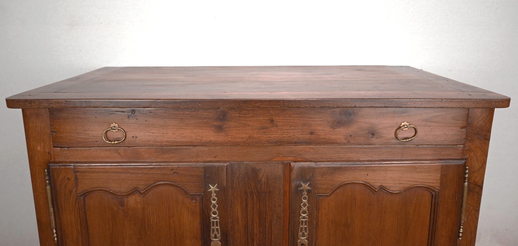 Ce buffet régional, en chêne clair massif, comporte en ceinture un long tiroir s’ouvrant par deux poignées anneaux en laiton.