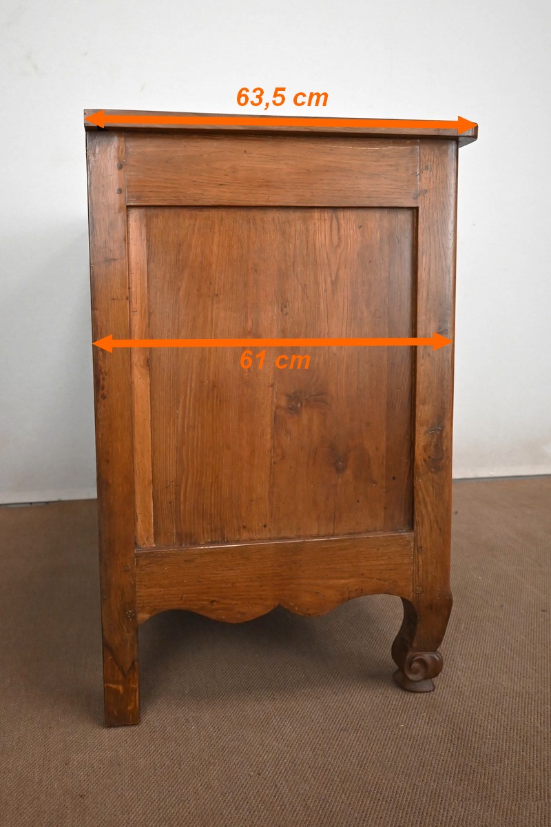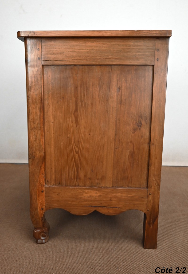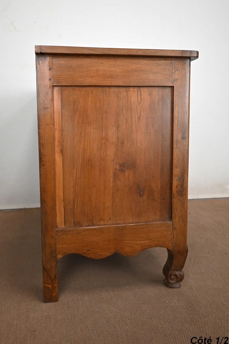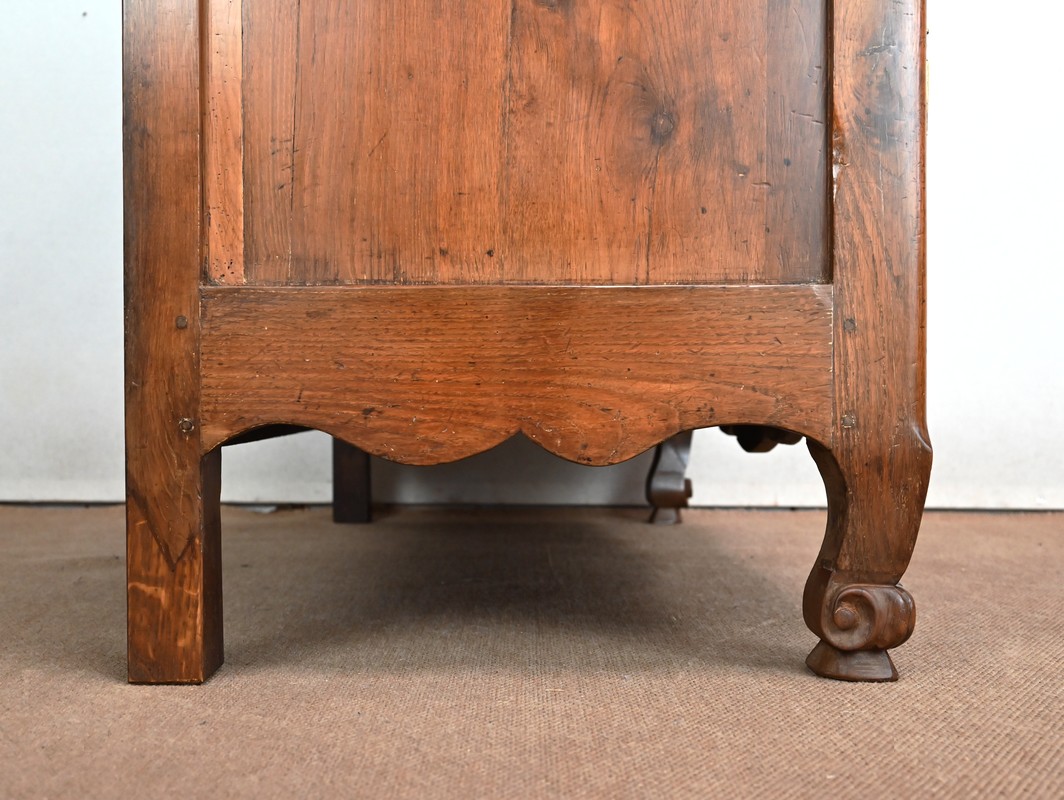 Ce buffet régional, en chêne clair massif, comporte en ceinture un long tiroir s’ouvrant par deux poignées anneaux en laiton.