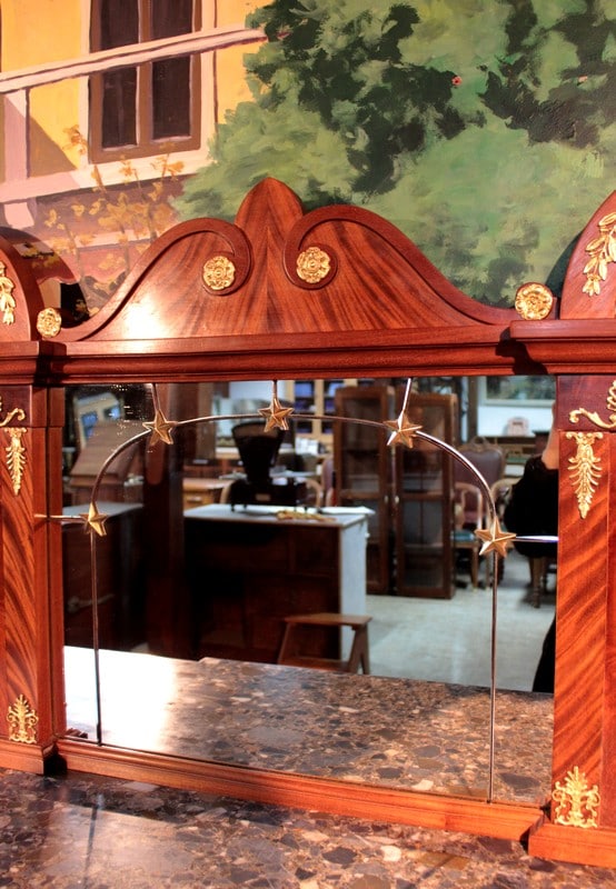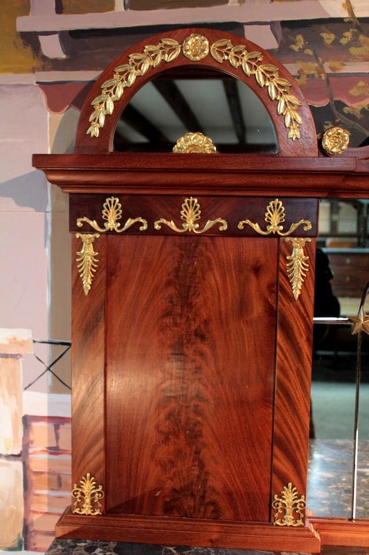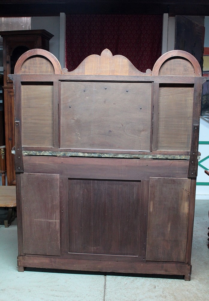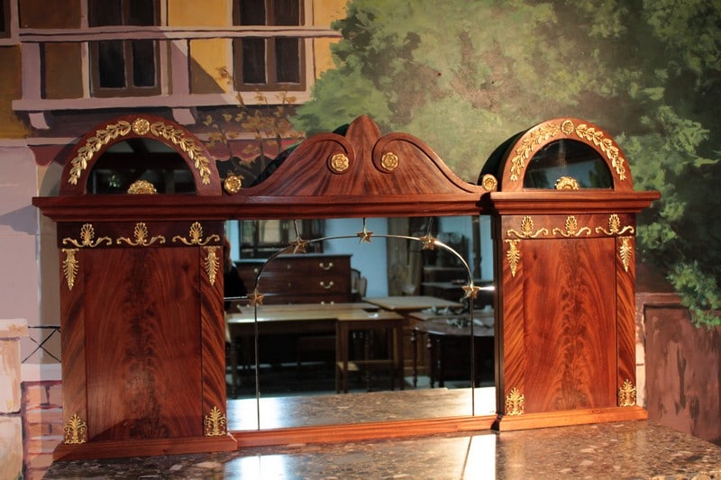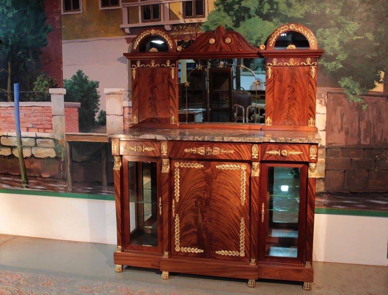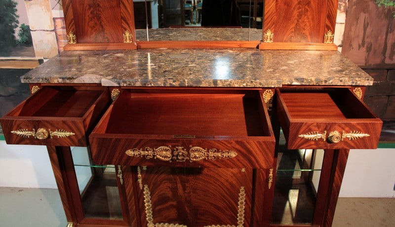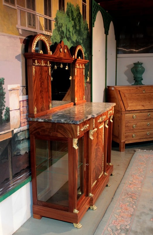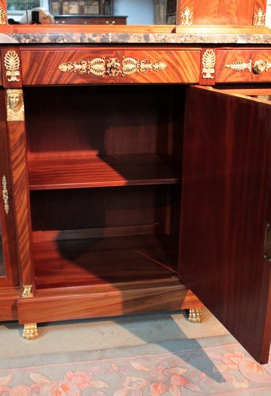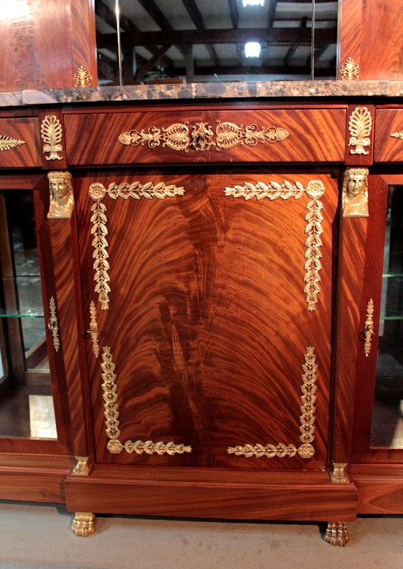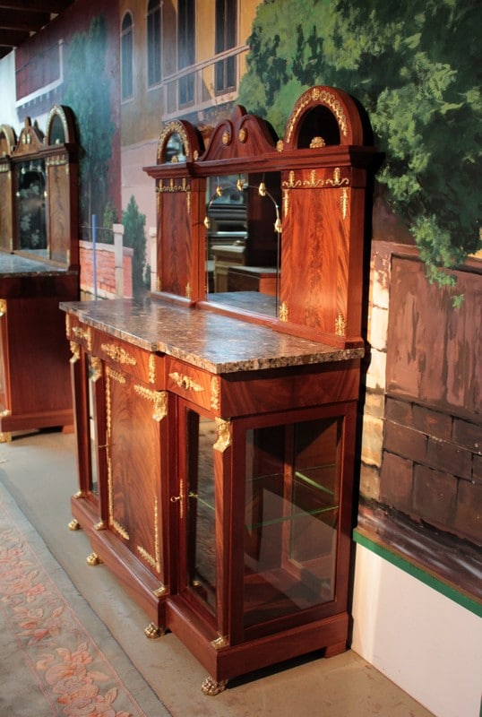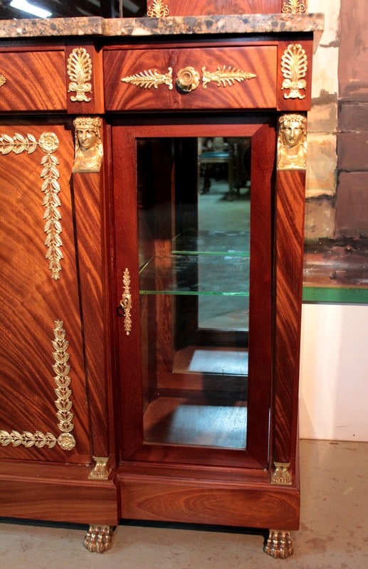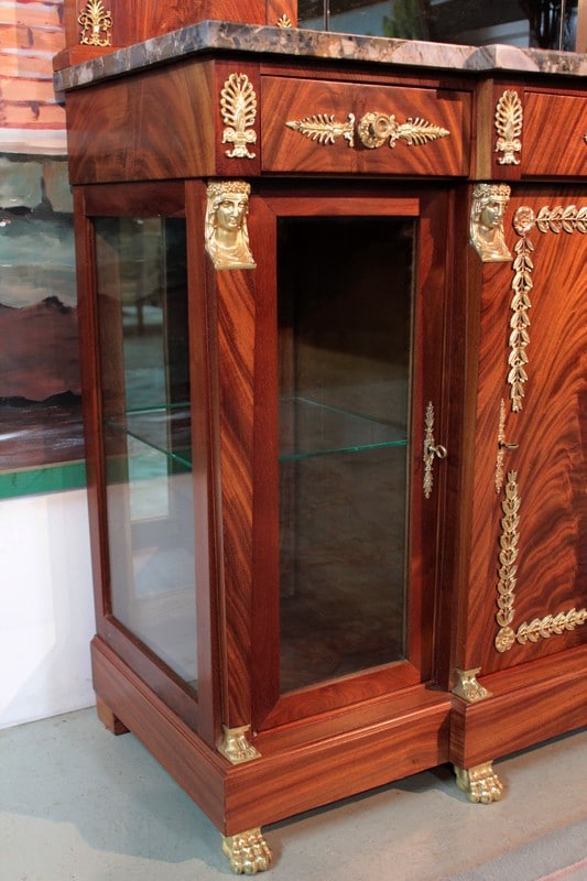 Desserte de style ‘Retour d’Égypte’ en ronce d’acajou avec dessus en marbre gris surmonté d’un miroir à encadrement. Elle ouvre par 3 tiroirs dans le bandeau et 3 portes en partie basse, celle du centre étant plus large et pleine, tandis que celles des côtés étant vitrées sur 2 faces. Fond miroir et étagère en verre à l’intérieur.
