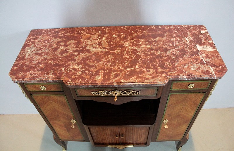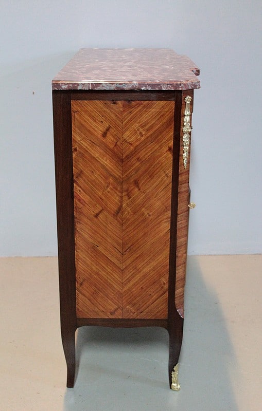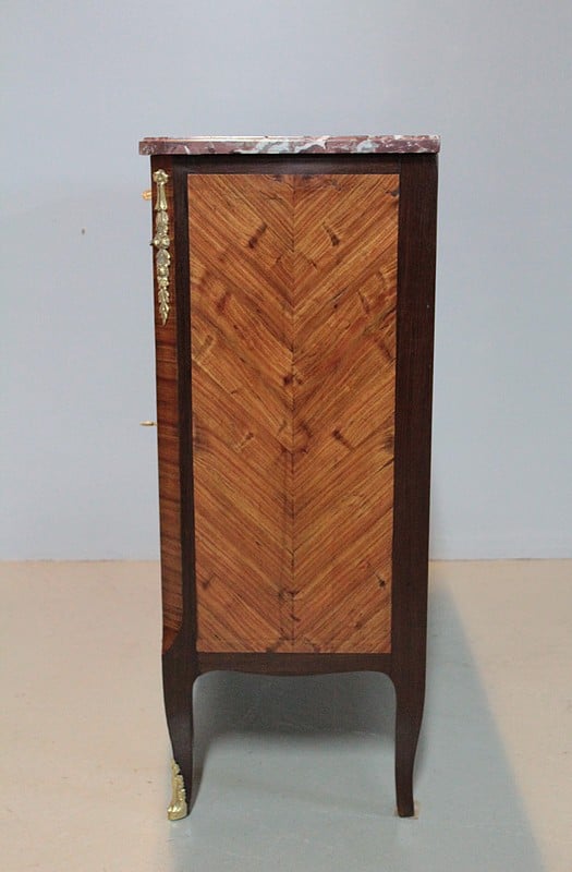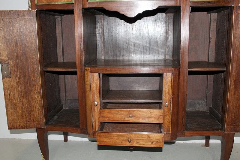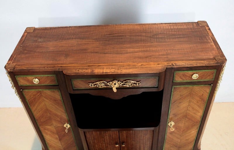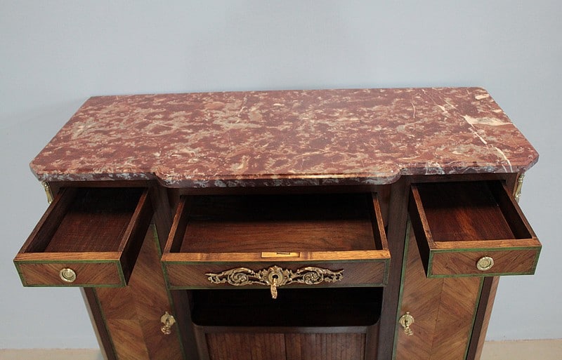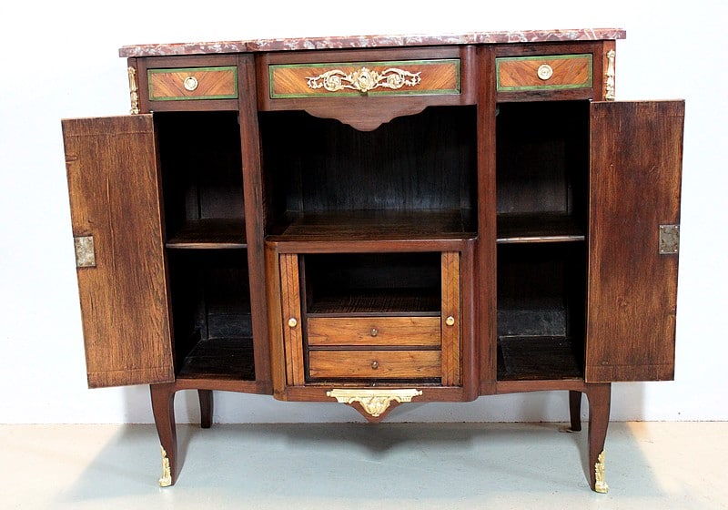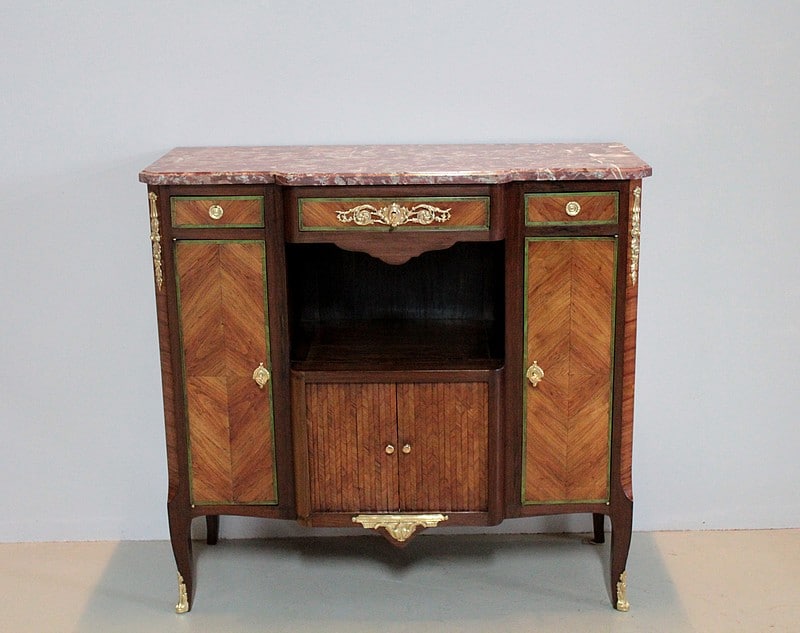 Meuble d’entre-deux à ressaut central en placage de bois de rose et d’acajou, de style transition Louis XV-Louis XVI.